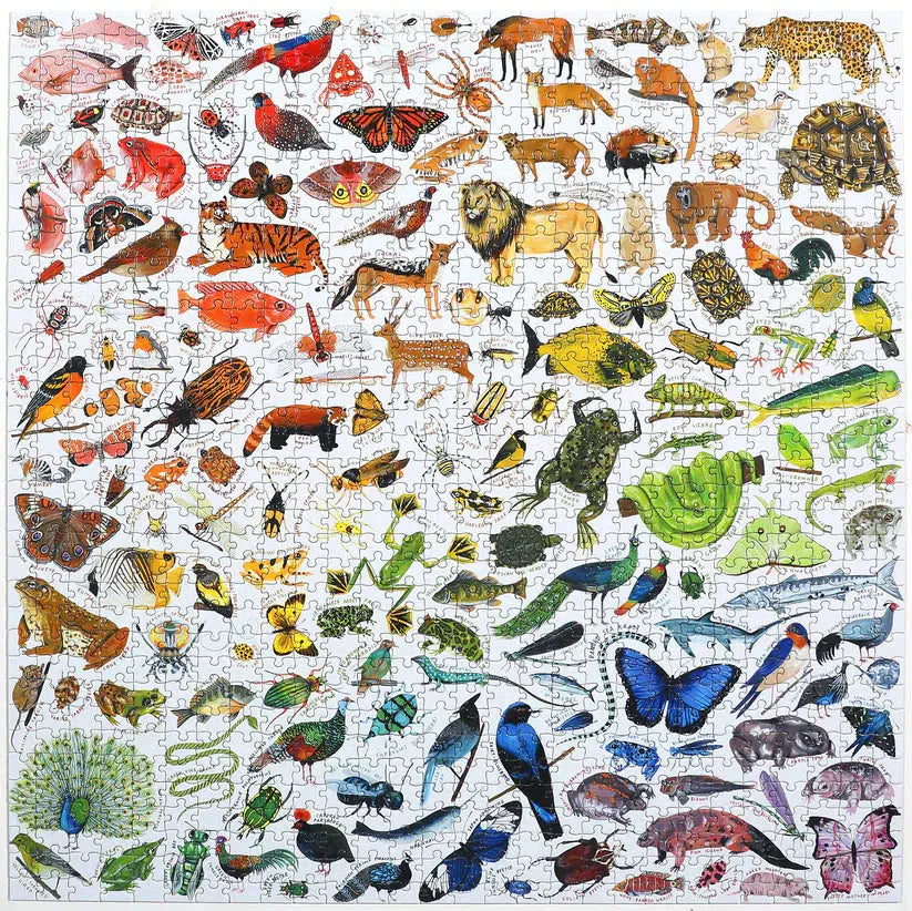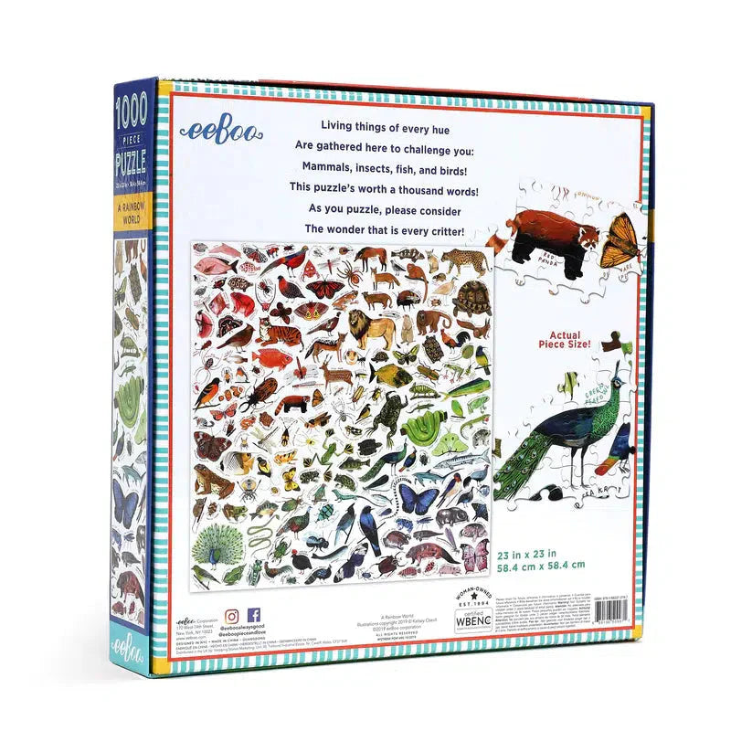 Puzzle your way through eeBoo’s A Rainbow World 1000 Piece Puzzle. The variety of beautiful flora and fauna in our world is truly astounding. Which of these fellow inhabitants of our Rainbow World is your favorite?  Jigsaw puzzles are a great activity for the whole family to enjoy. Featuring art by Kelsey Oseid (@kelzuki).