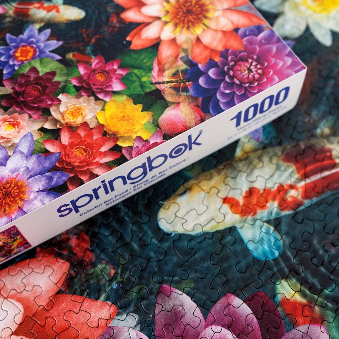 Relax and unwind with Springbok's Colorful Koi Pond 1000 piece puzzle for adults that takes you away to a peaceful place. Great puzzle for a mindfulness activity or just to unwind with.