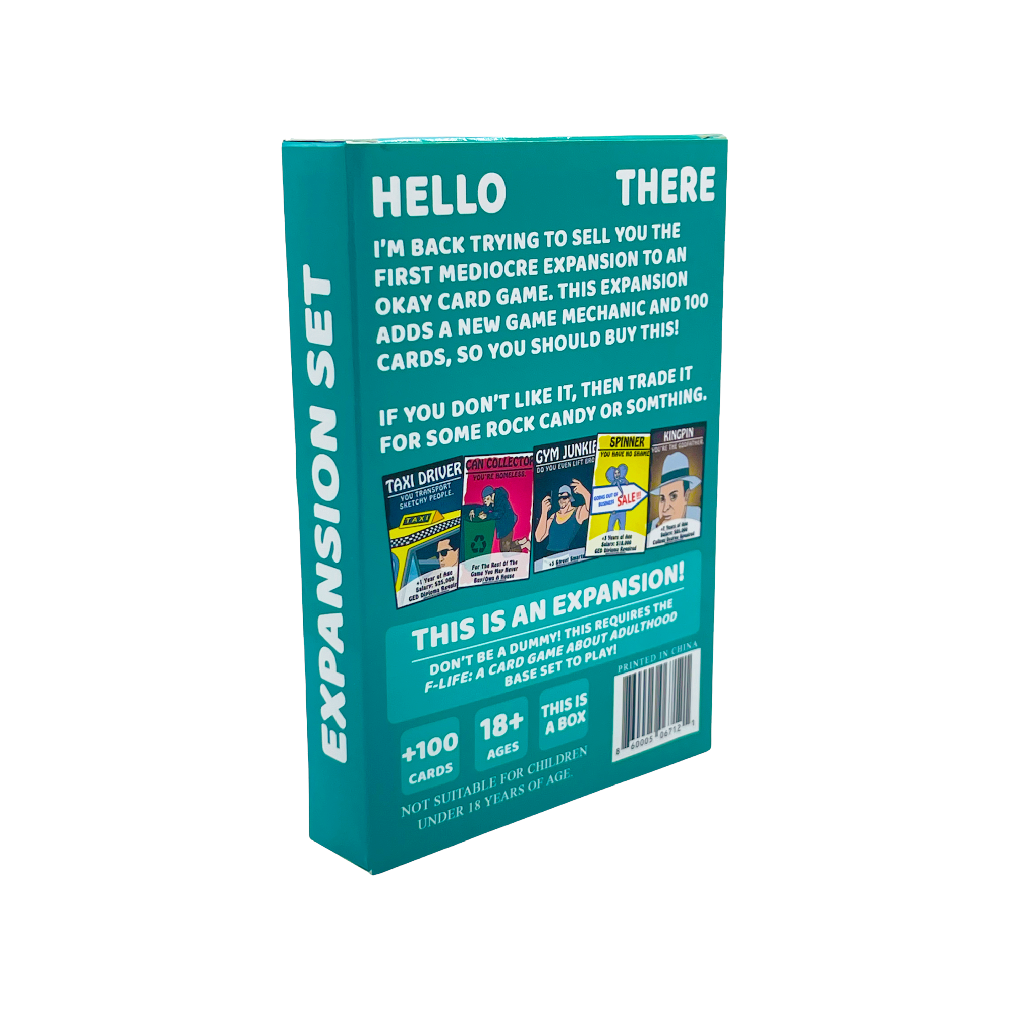 THIS EXPANSION REQUIRES THE F-LIFE: A CARD GAME ABOUT ADULTHOOD BASE SET TO PLAY!