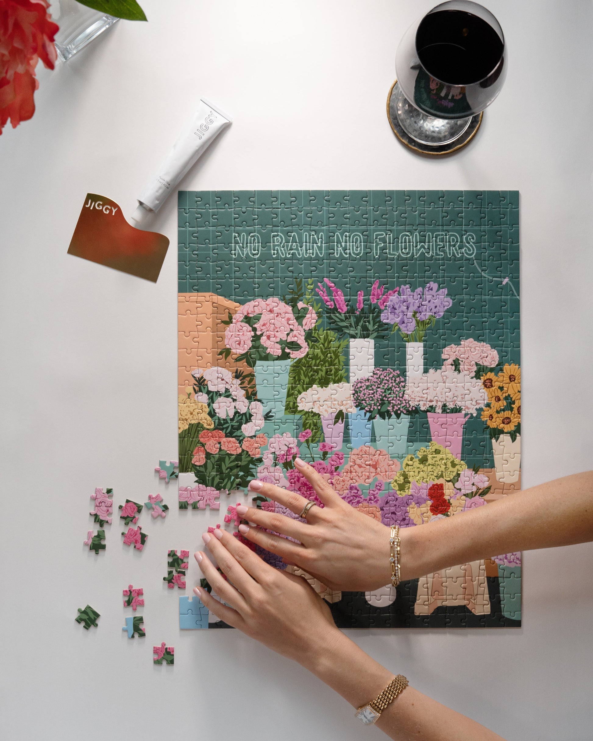 Each JIGGY puzzle comes in a reusable glass jar and includes a tube of puzzle glue, a straight-edge tool to spread the glue and a print of the art to follow.