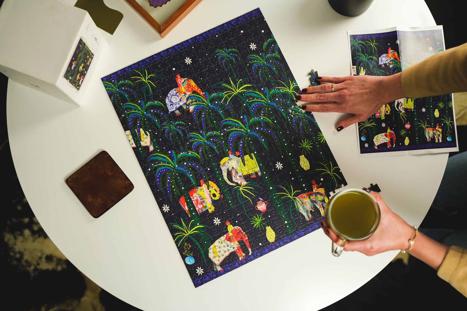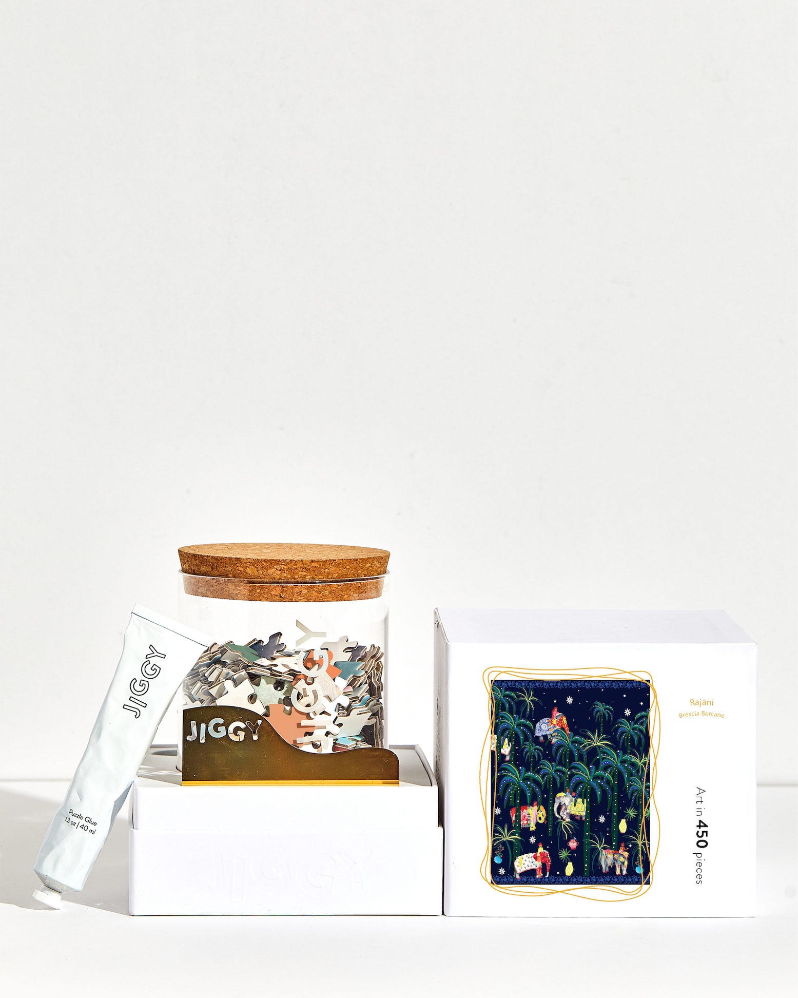 Each JIGGY puzzle comes in a reusable glass jar and includes a tube of puzzle glue, a straight-edge tool to spread the glue and a print of the art to follow.