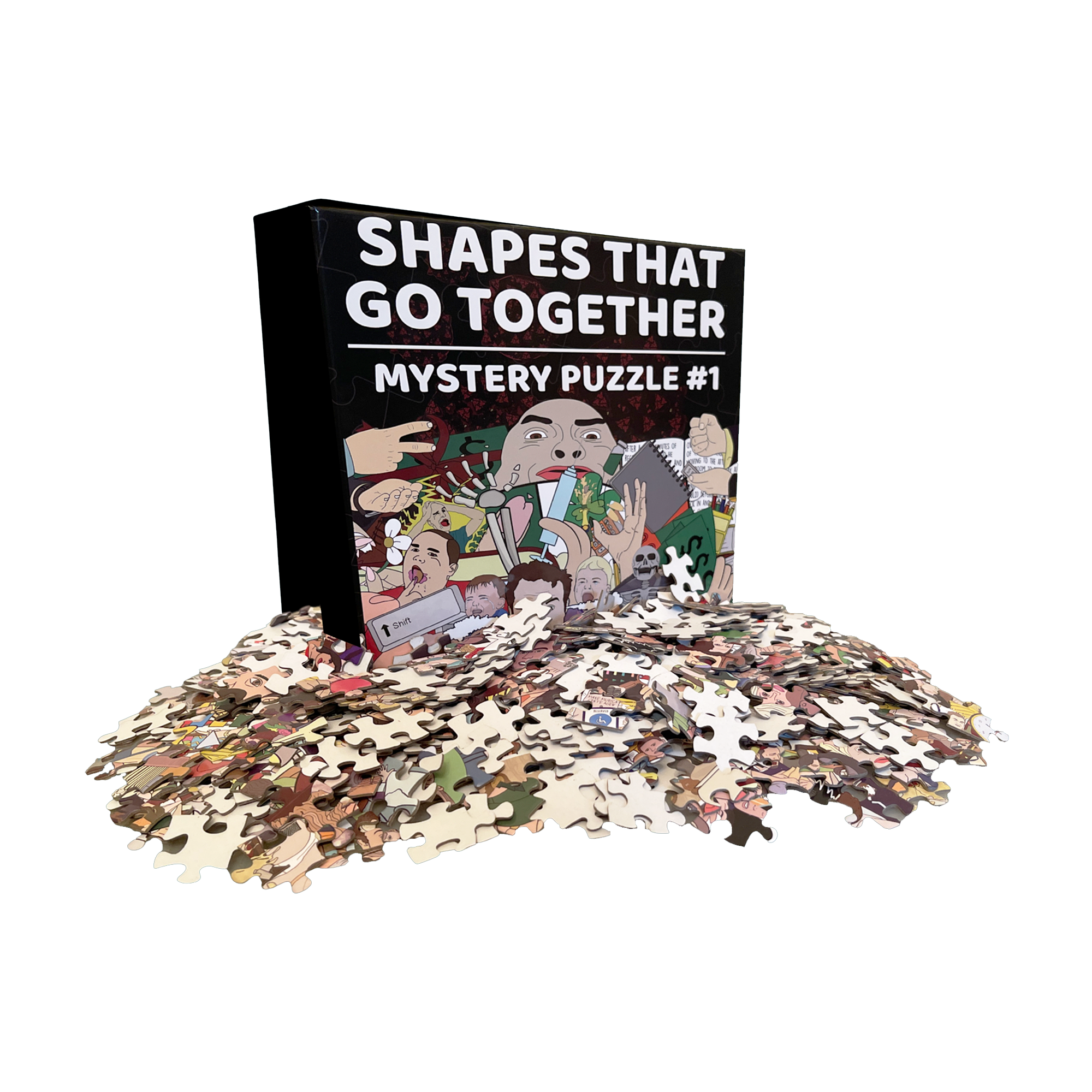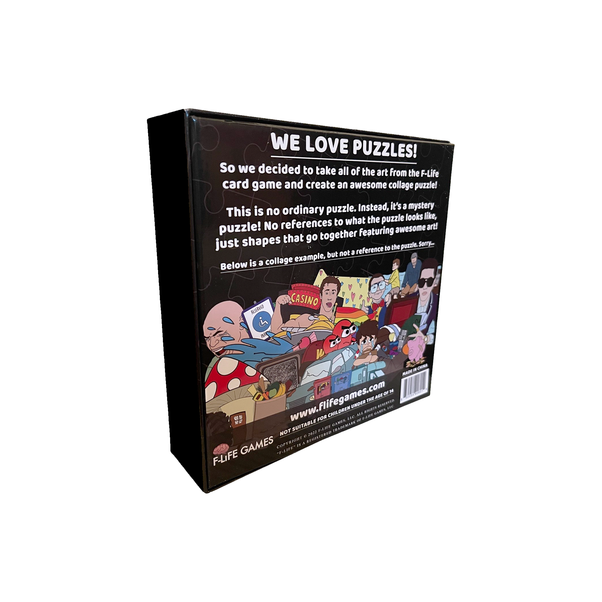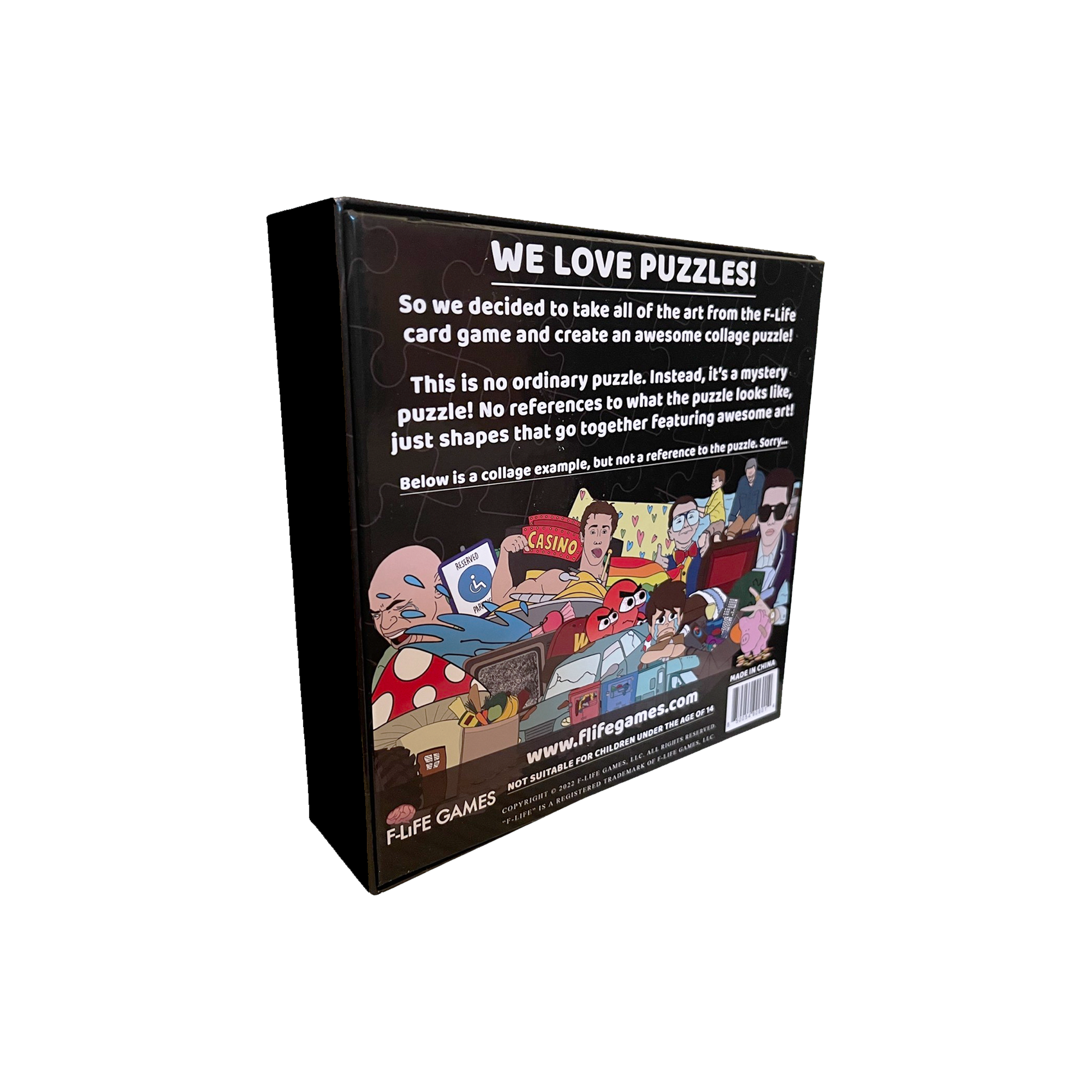 So, we decided to take all of the art from the F-Life card game and create an awesome collage puzzle! This is no ordinary puzzle. Instead, it’s a mystery puzzle! There are no references to what the puzzle looks like, just shapes that go together featuring awesome art! The box shows a collage example, but it does not reference the actual puzzle. Sorry...
