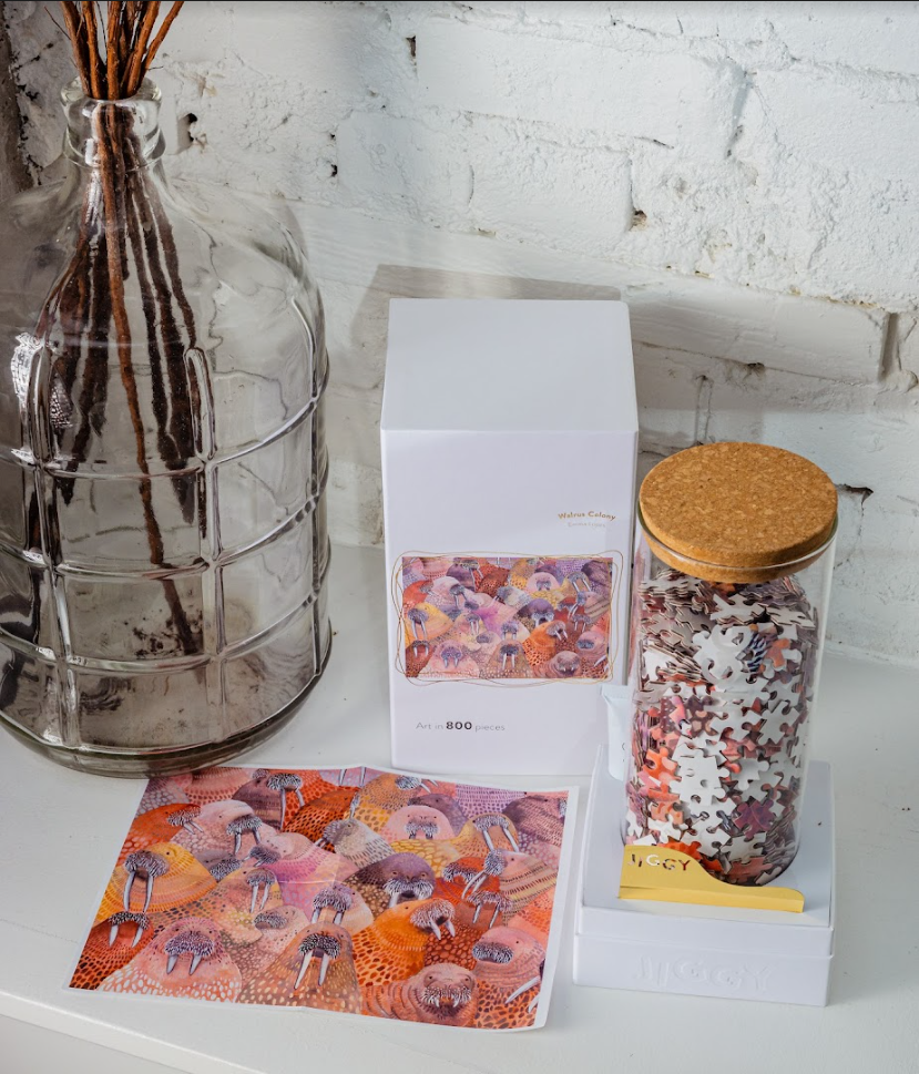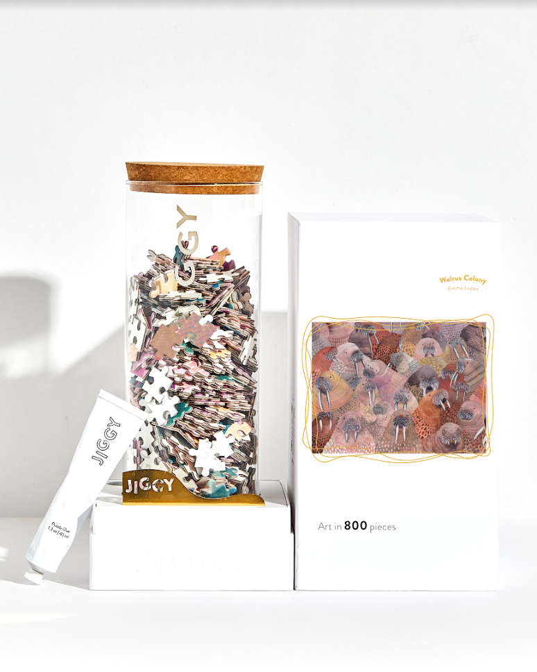 Each JIGGY puzzle comes in a reusable glass jar and includes a tube of puzzle glue, a straight-edge tool to spread the glue and a print of the art to follow.
