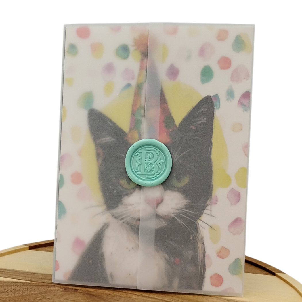 Send smiles and laughs with this adorable and witty birthday card, specially designed for the cat lover in your life! The front of the card features a charming illustration of a sleek black and white cat, green eyes wide with excitement, sporting a festive party hat adorned with white polka dots and a yellow/orange pom-pom.