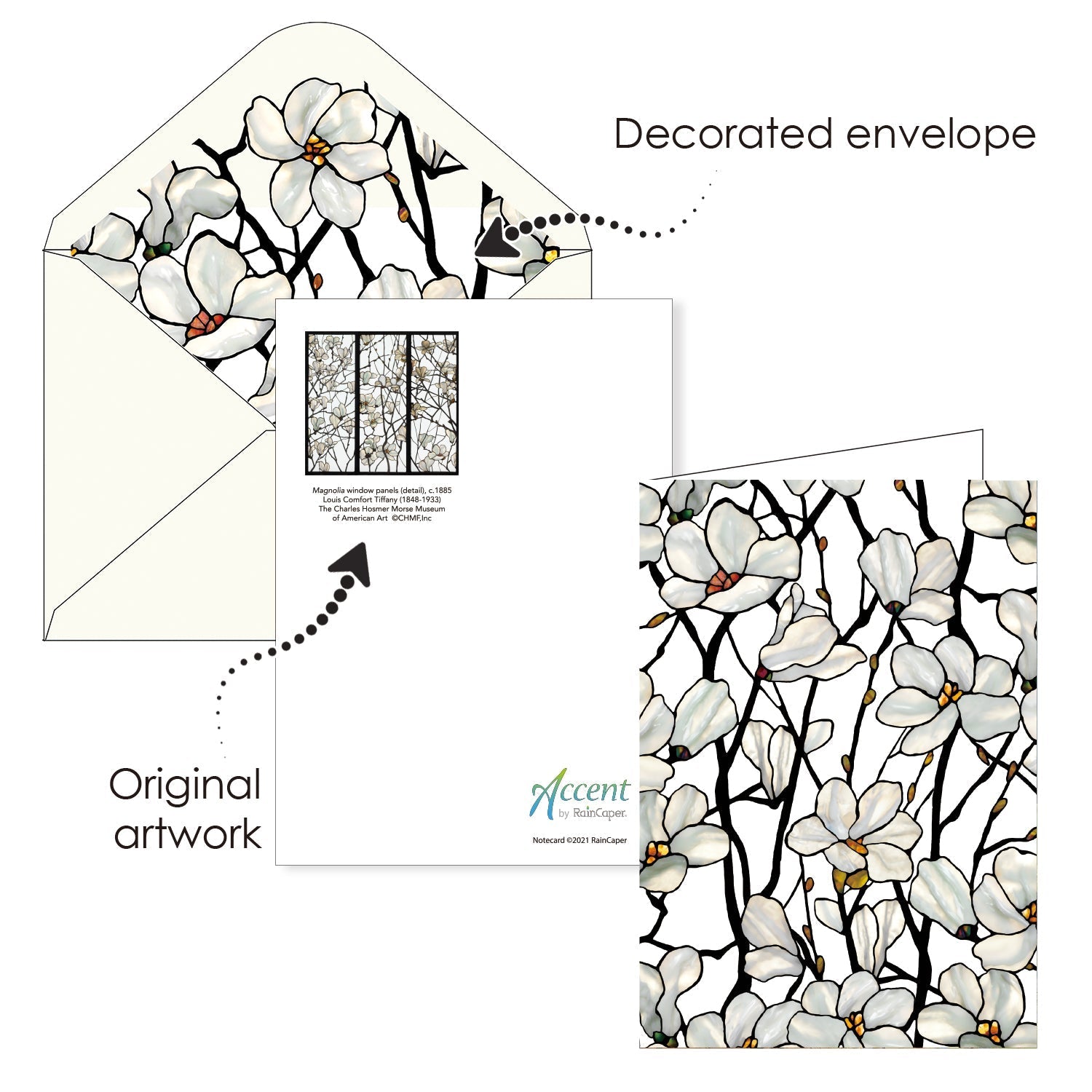 This box contains an array of four designs, each featuring works in stained glass by iconic glassmaker Louis Comfort Tiffany. No matter which design you choose, the rich beauty of the glowing, opalescent glass makes these cards perfect for any occasion.
