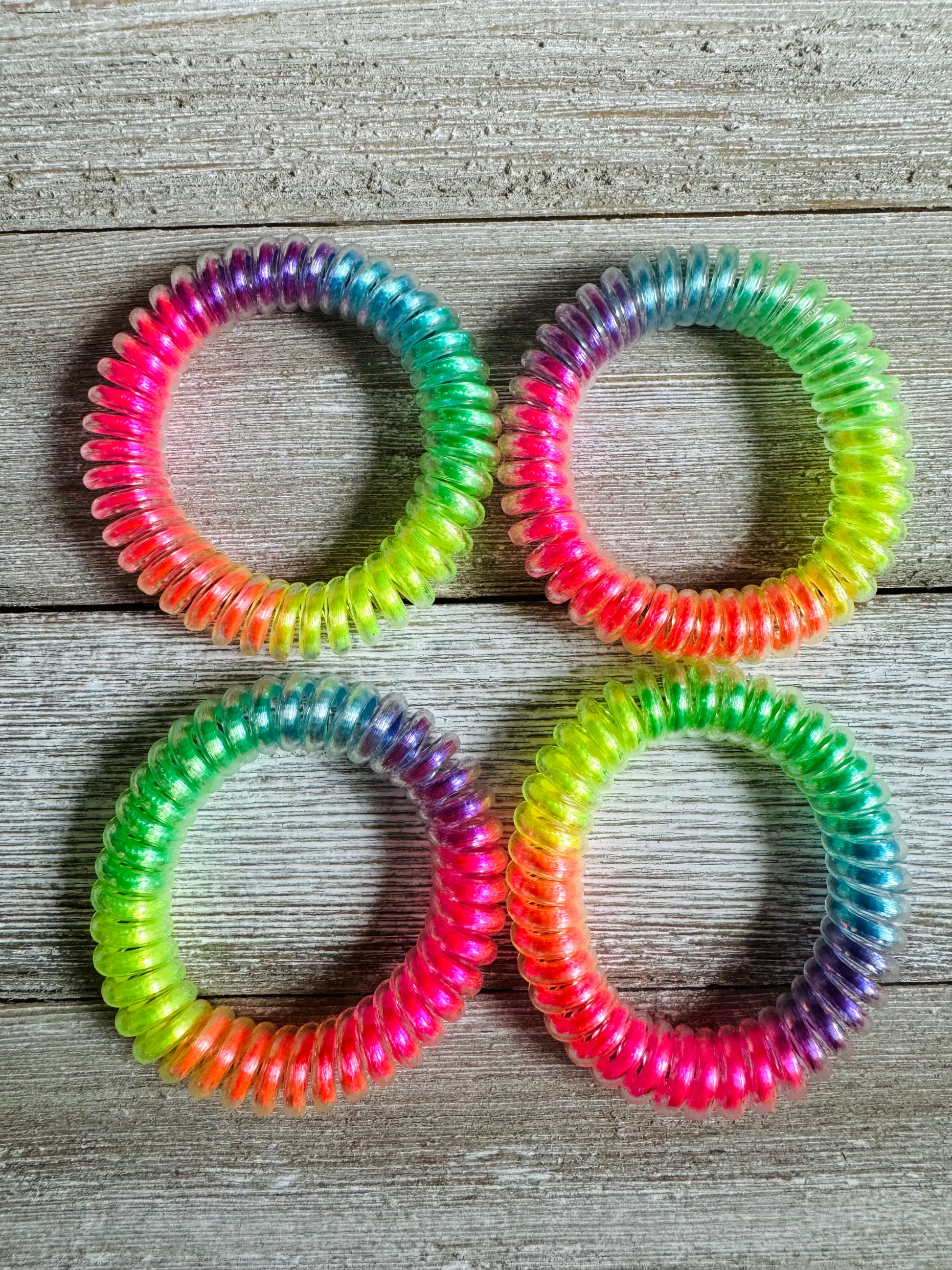 Each coiled telephone cord style hair tie is one of a kind, please expect slight differences in color and pattern. Set includes four (4) hair ties.