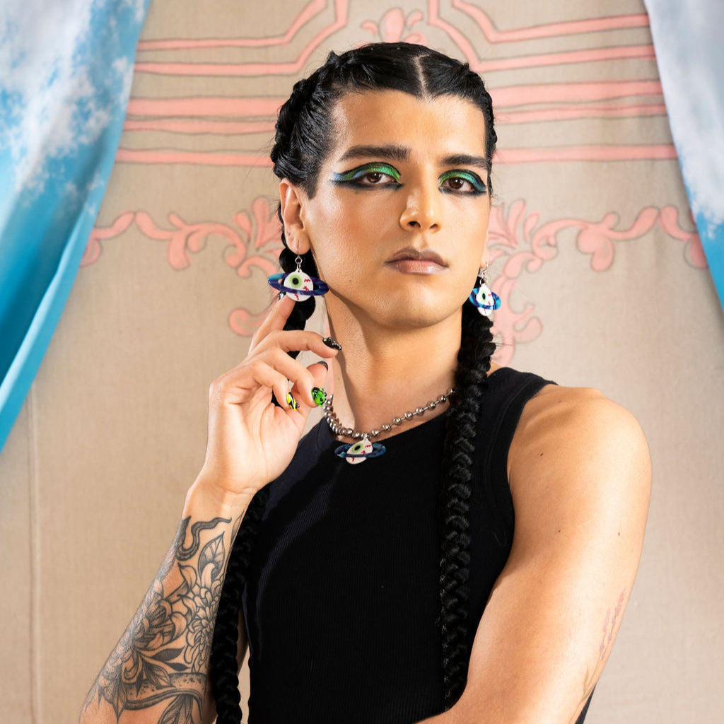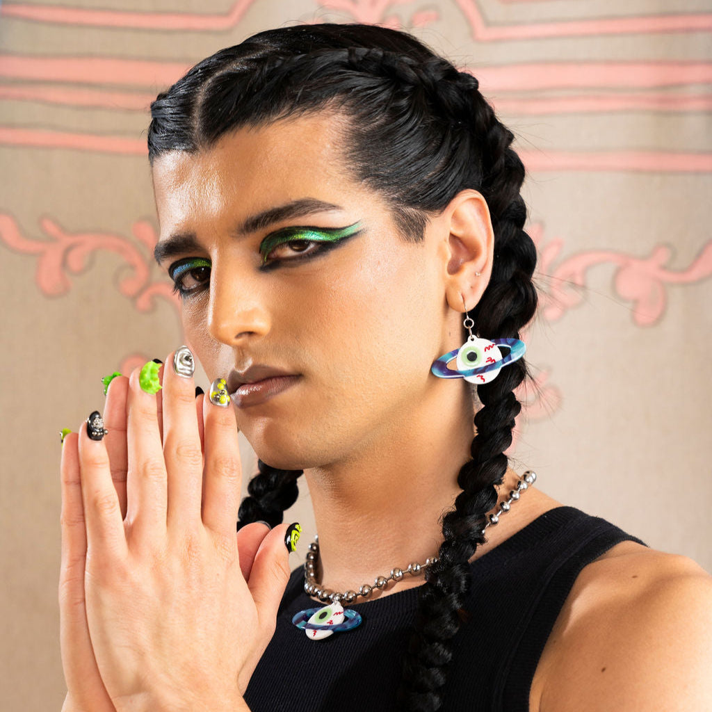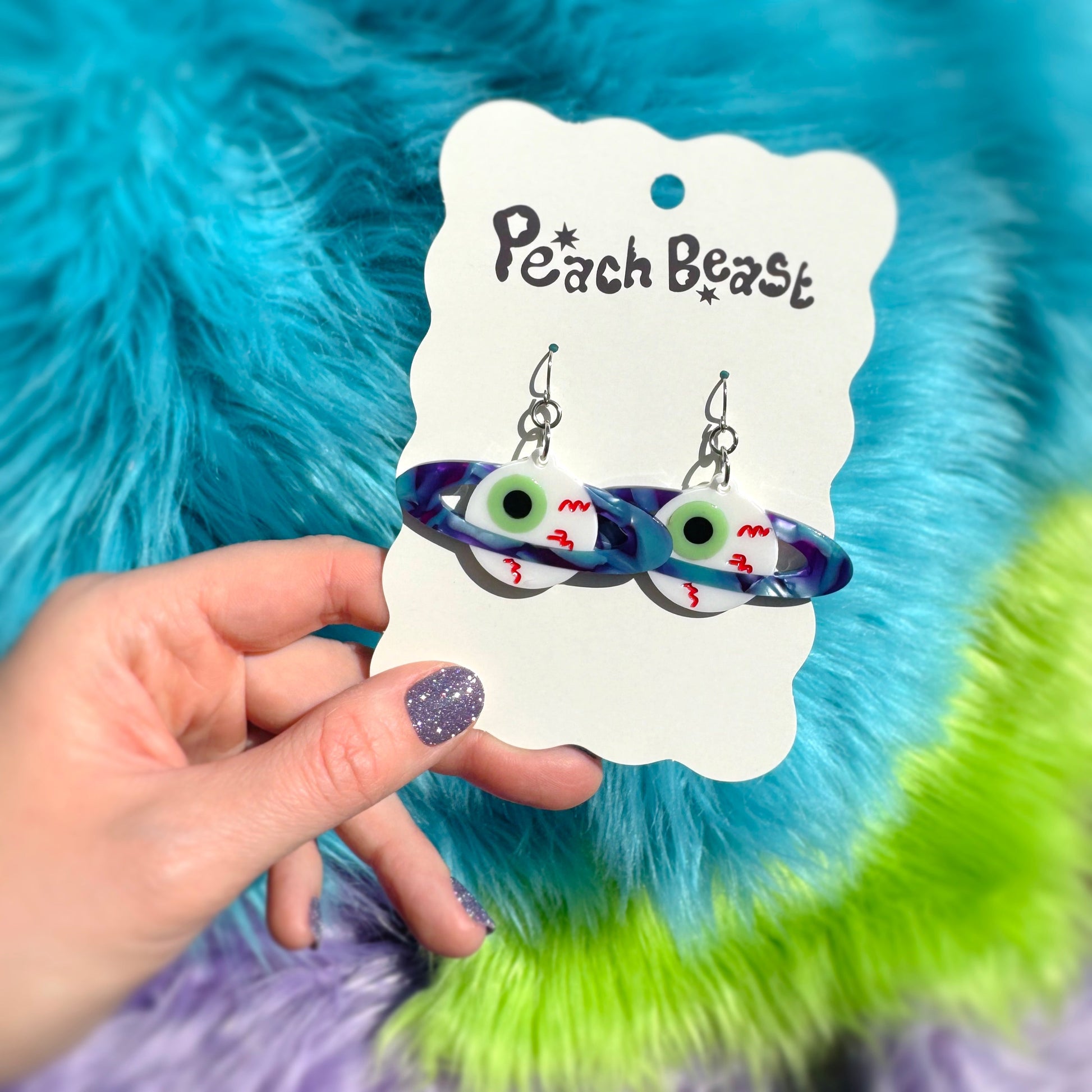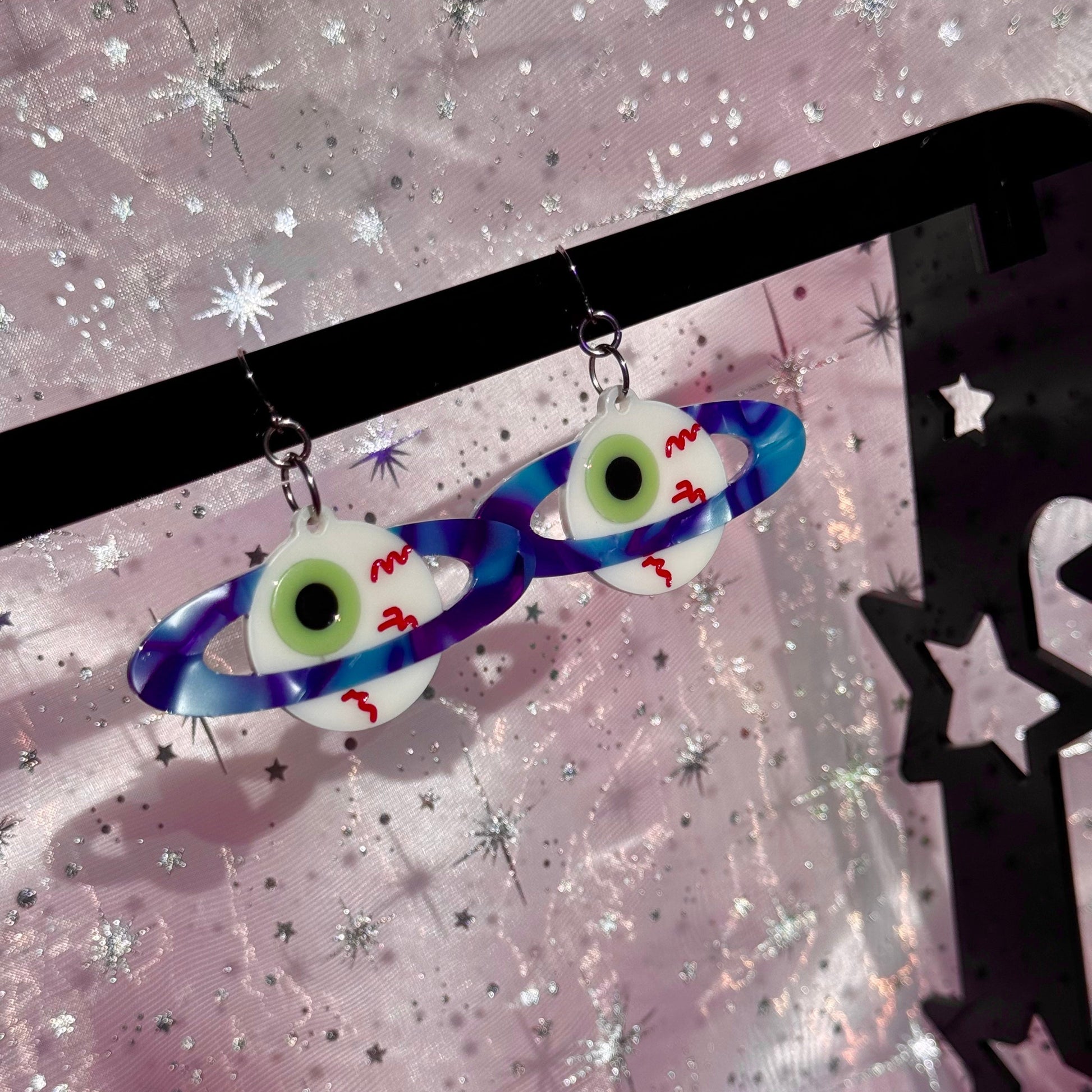 It's a weird planet, isn't it? These creepy little eyeball earrings have a sparkly blue and purple planet ring, and make an awesome addition to any outfit. Very punk, very weird, very cool. 2" in length.