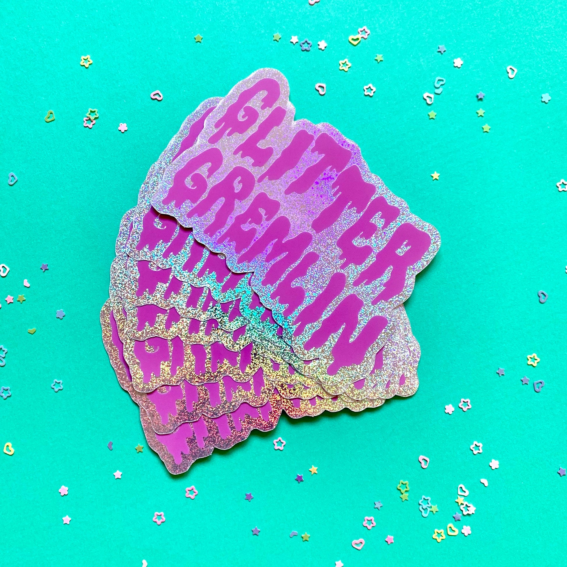 Calling all glitter gremlins!! This sticker is for all you little sparkly freaks out there. Iridescent sparkles and pink text make up this adorable little statement sticker. Measures 4"x3". When you buy 5 stickers, one is free!