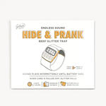 This innocent-looking device plays that unmistakable "beep-beep" watch sound intermittently for 8+ hours until the battery dies OR until your victim finally tracks it down and removes it—triggering the hidden glitter bomb surprise. The best part? Everyone will blame each other's watches before they ever suspect a hidden device.