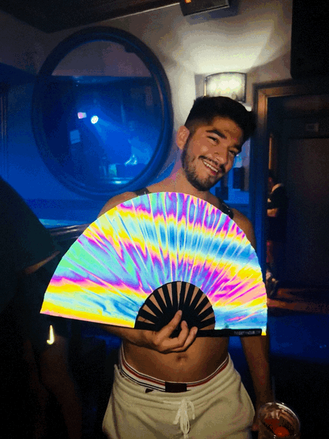 The Eclipse Fan is a top selling rave fan that changes colors in a flash 📸. This deluxe bamboo and fabric hand fan appears black until a flash reveals the bold, dazzling rainbow design beneath. Perfect for those who love to keep ’em guessing at Pride, raves, or late-night drag brunches. When the spotlight hits, this hand fan clacks loud and clear.