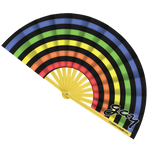 • Vibrant bamboo folding fan featuring an electric rainbow design