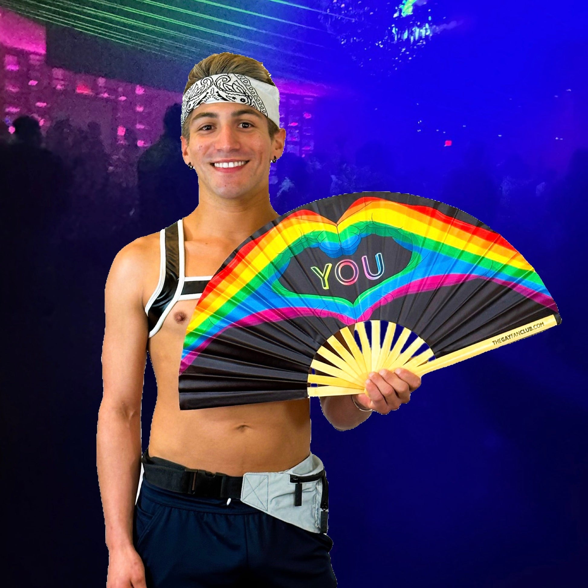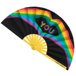 The Love You Fan is a top-selling rave fan and your go-to for sending love and good vibes at raves, Pride parades, and every celebration in between. With a vibrant black and rainbow design and a loud clack, this bamboo hand fan is made for those who believe love is the loudest language of all.