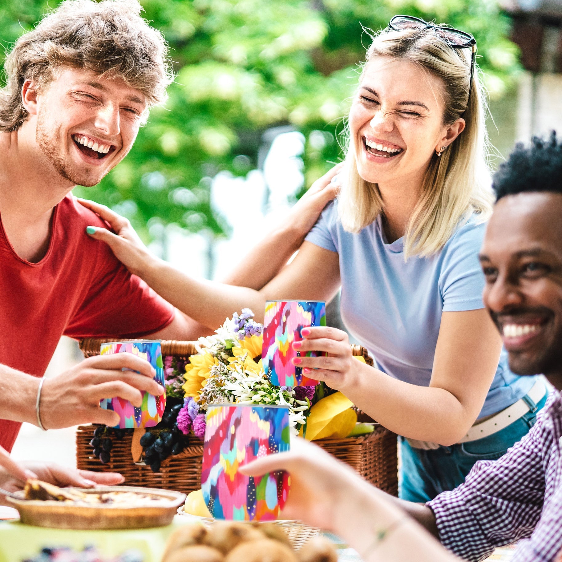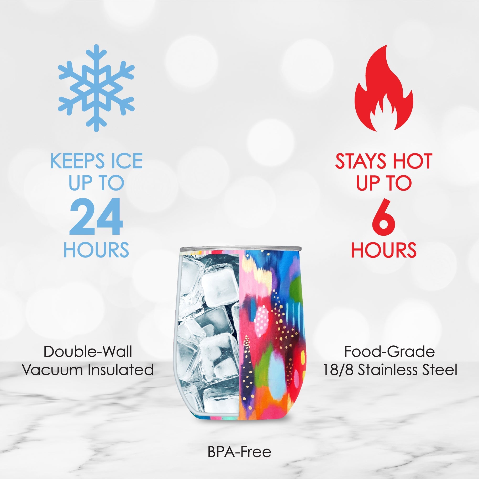 Stay Refreshed On-The-Go with Our 12oz Stainless Wine Tumbler!Discover the perfect blend of style and practicality with our Stainless Steel Wine Tumbler. The sleek, modern design of this Tumbler makes it a fashionable accessory for any occasion. Whether you're hitting the gym, the office, school, or the trails, it's the perfect choice. This double-wall vacuum insulated Tumbler keeps beverages hot for 6 hours and cold for 12, keeps ice frozen for up to 1 day ensuring you're always refreshed. Crafted from durable, BPA-free 18/8 stainless steel, it's a sustainable and eco-friendly choice. The leak-proof design guarantees a mess-free experience, while the wide mouth simplifies cleaning. Elevate your hydration game, reduce waste, and enjoy hassle-free adventures with this travel-friendly companion.Our product features exquisite designs inspired by the vibrant, colorful designs and bold patterns of Jessi Raulet. She began her love affair with color at the age of four and has been creating ever since. She paints colorful fine art pieces and designs to brighten up her surroundings. She is inspired by her life in France, travel adventures and pop culture. Add a touch of her exceptional artistry to your life with our exclusive collection featuring Etta Vee's unique and lively creations.Stunning rendering of EttaVee's famous art, "Brush 100." The design is captured with an artist's eye for detail, light & color.