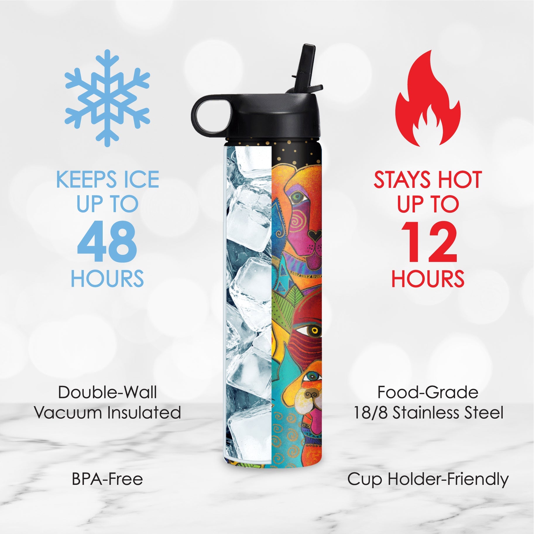 - BPA-free 18/8 stainless steel, double-wall vacuum insulated to keep hot beverages hot up to12 hours; cold drinks up to 30 hours, keeps ice frozen for up to 2 days