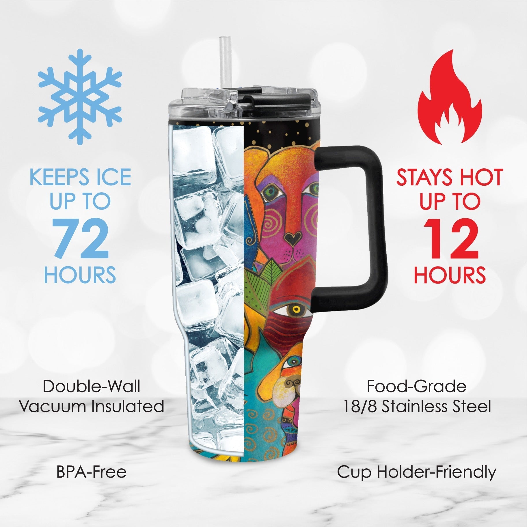 Stay Refreshed On-The-Go with Our 30oz Stainless Steel Tumbler!Discover the perfect blend of style and practicality with our Stainless Steel Tumbler. The sleek, modern design of this Tumbler makes it a fashionable accessory for any occasion. Whether you're hitting the gym, the office, school, or the trails, it's the perfect choice. This double-wall vacuum insulated Tumbler keeps beverages hot for 12 hours and cold for 36, ice up to 3 days ensuring you're always refreshed. Crafted from durable, BPA-free 18/8 stainless steel, it's a sustainable and eco-friendly choice. The leak-proof design guarantees a mess-free experience, while the wide mouth simplifies cleaning. Elevate your hydration game, reduce waste, and enjoy hassle-free adventures with this travel-friendly companion.Our product features exquisite designs inspired by the timeless artistry of Laurel Burch. Burch's art is renowned for its vibrant colors, whimsical designs, and uplifting themes. Her unique style features bold patterns and fantastical creatures, celebrating joy, love, and the human spirit. Each piece of Laurel Burch art brings a sense of wonder and enchantment, making it a perfect addition to any collectionStunning rendering of Laurel Burch famous art, "Dogs, Dogs, Dogs." The design is captured with an artist's eye for detail, light & color.