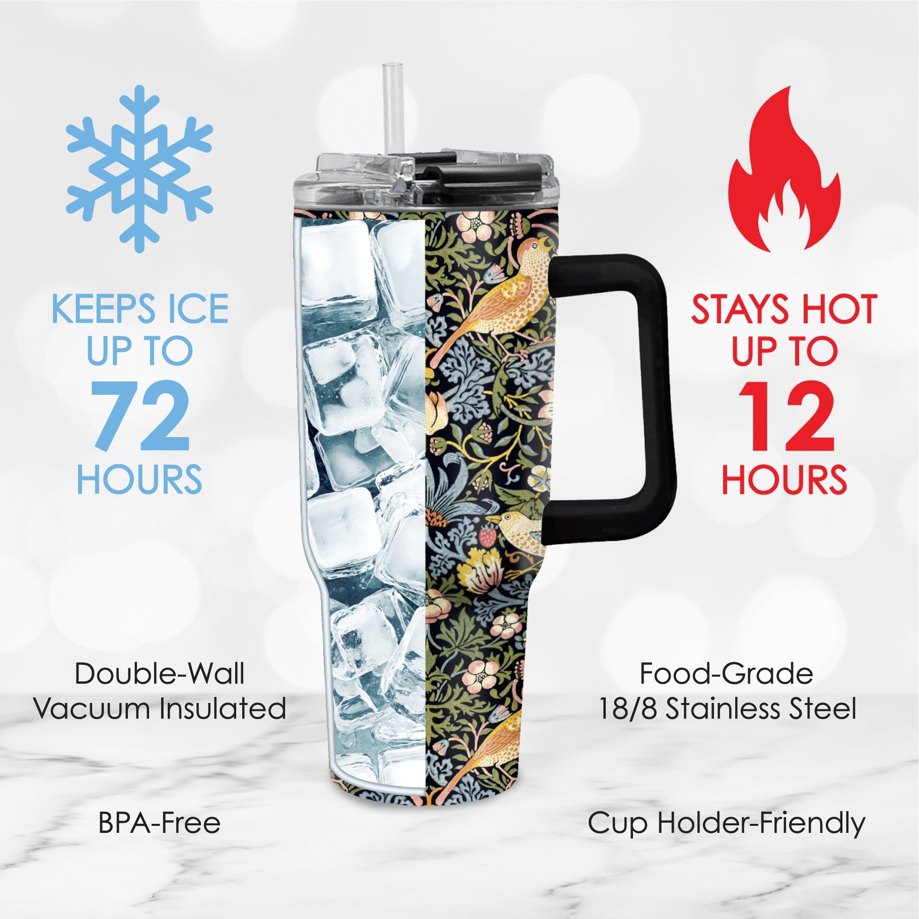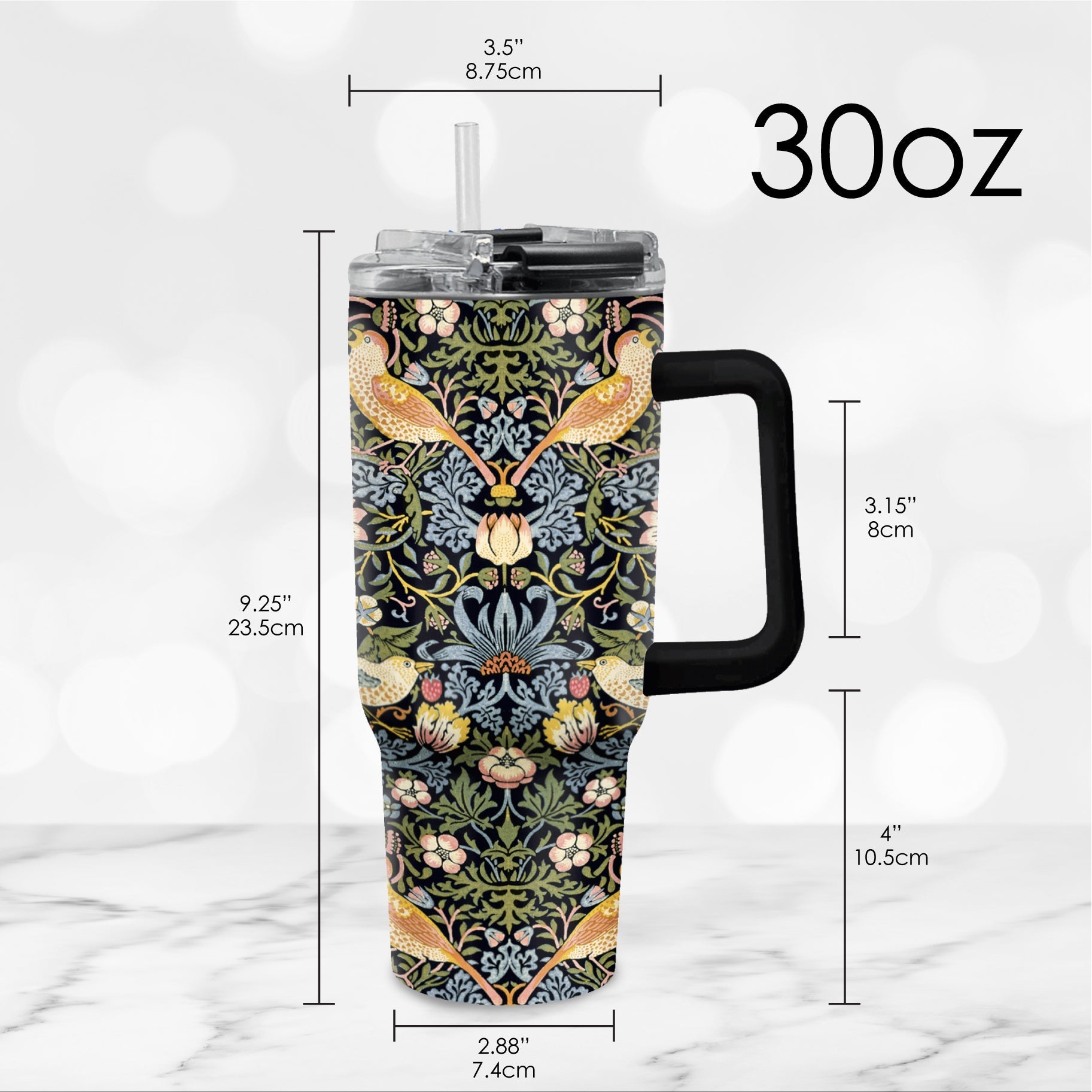 Stay Refreshed On-The-Go with Our 30oz Stainless Steel Tumbler!Discover the perfect blend of style and practicality with our Stainless Steel Tumbler. The sleek, modern design of this Tumbler makes it a fashionable accessory for any occasion. Whether you're hitting the gym, the office, school, or the trails, it's the perfect choice. This double-wall vacuum insulated Tumbler keeps beverages hot for 12 hours and cold for 36, ice up to 3 days ensuring you're always refreshed. Crafted from durable, BPA-free 18/8 stainless steel, it's a sustainable and eco-friendly choice. The leak-proof design guarantees a mess-free experience, while the wide mouth simplifies cleaning. Elevate your hydration game, reduce waste, and enjoy hassle-free adventures with this travel-friendly companion.Our product features exquisite designs inspired by the timeless artistry of William Morris. Known for his intricate patterns and attention to detail, Morris's work brings a touch of classic elegance and sophistication to our design, making each piece a beautiful blend of art and functionality. Enjoy the rich heritage and artistic flair of William Morris in every aspect of our product.Stunning rendering of William Morris famous art, "Strawberry Thief." The design is captured with an artist's eye for detail, light & color.