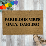 Welcome your fabulous guests to your home with this "Fabulous Vibes Only, Darling" doormat! Let them know they're entering the right place with a funny saying that's sure to put a smile on their face. No worries - only fabulous vibes here!