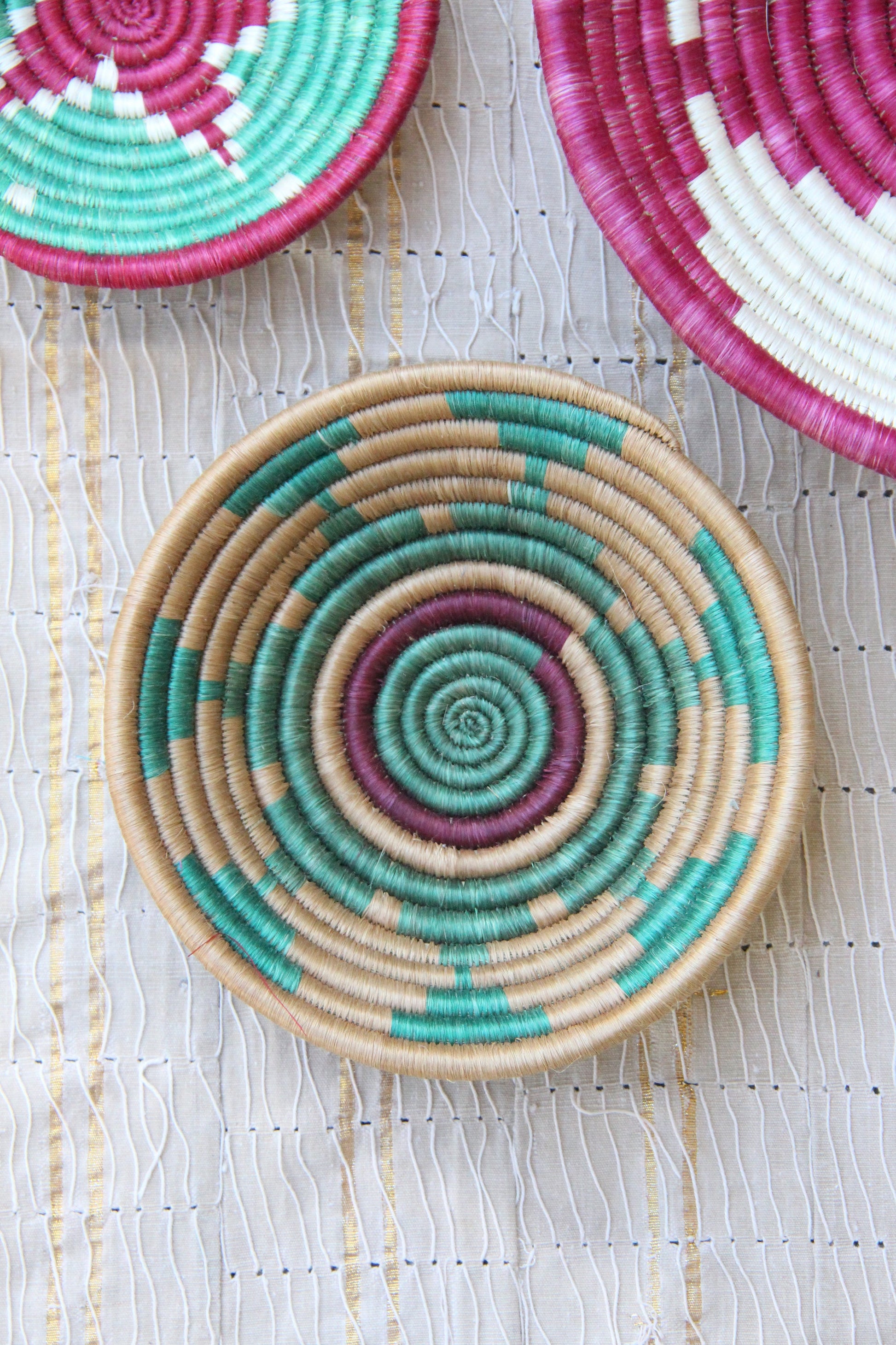 Add some pizzazz to a boring wall or tabletop with this curated and cohesive collection of berry, teal, and neutral African baskets. This colorful set makes it easy to create a global boho home. Handcrafted in Rwanda by women, from Sisal wrapped around native grasses, these vibrant baskets are not only beautiful, but widely functional too.
