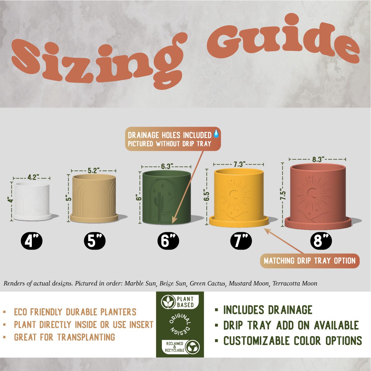 *Enjoy our Matte color selection for an elevated look. Gold, Copper, & Silver have a shiny finish we call metallic. The Rainbow color will vary depending on size of planter. If you would like a specific coloration please leave 2 colors in the notes!