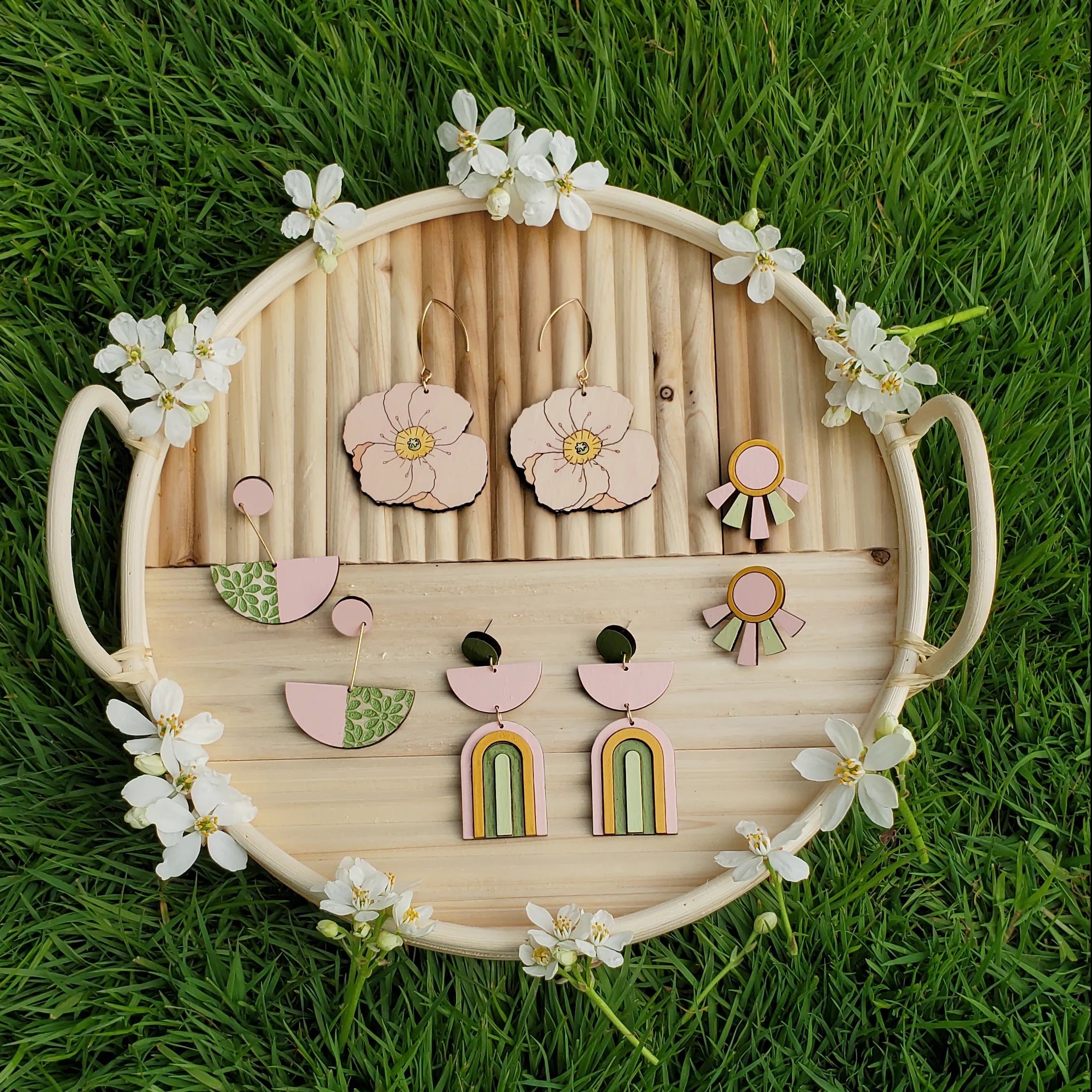 From our Return to Nature collection where geometric shapes transform into organic floral designs meet our Art Deco Pastel Studs! These earrings were hand-painted then glued with a thin wood to create dimension through shapes and colors.