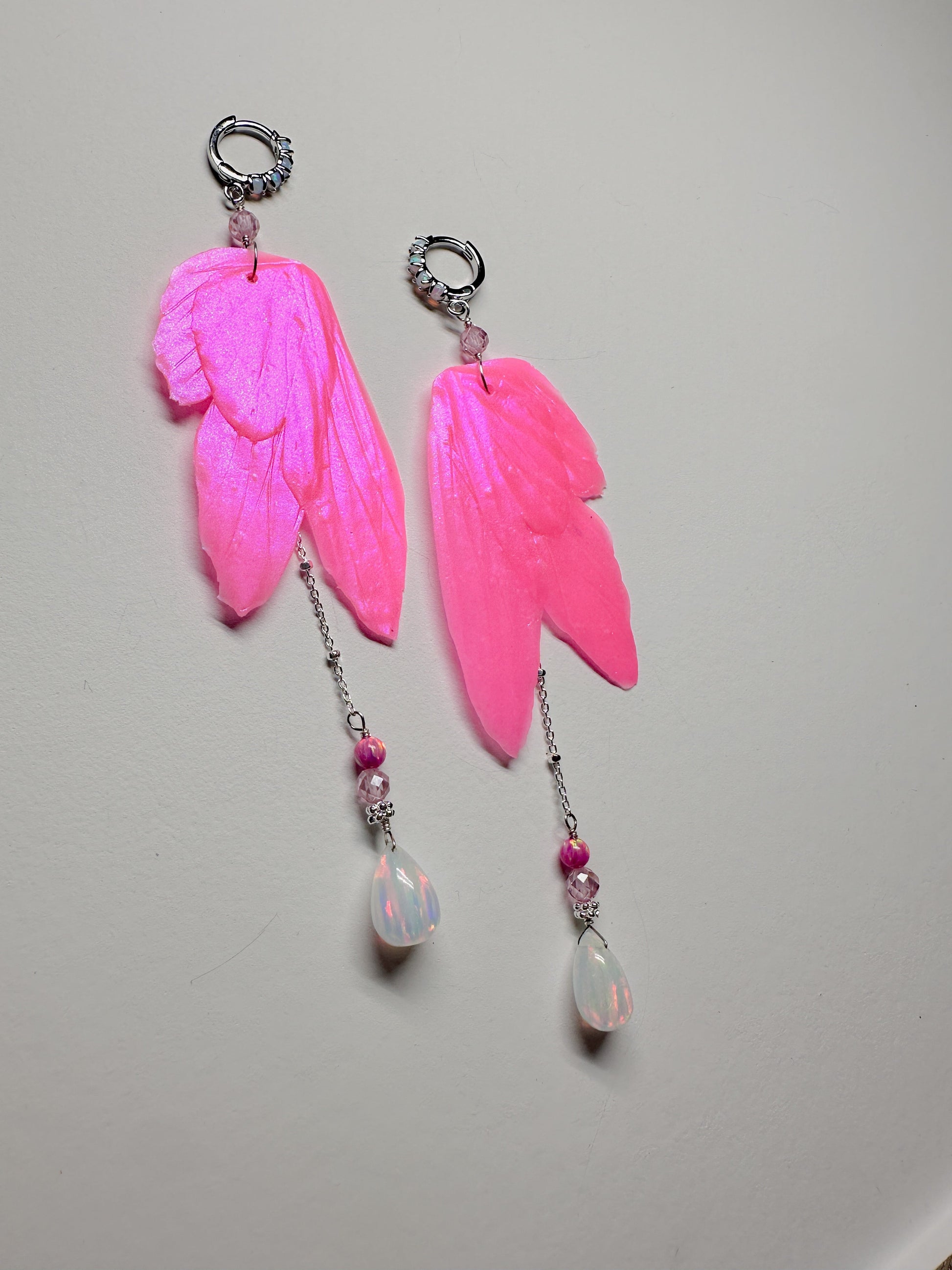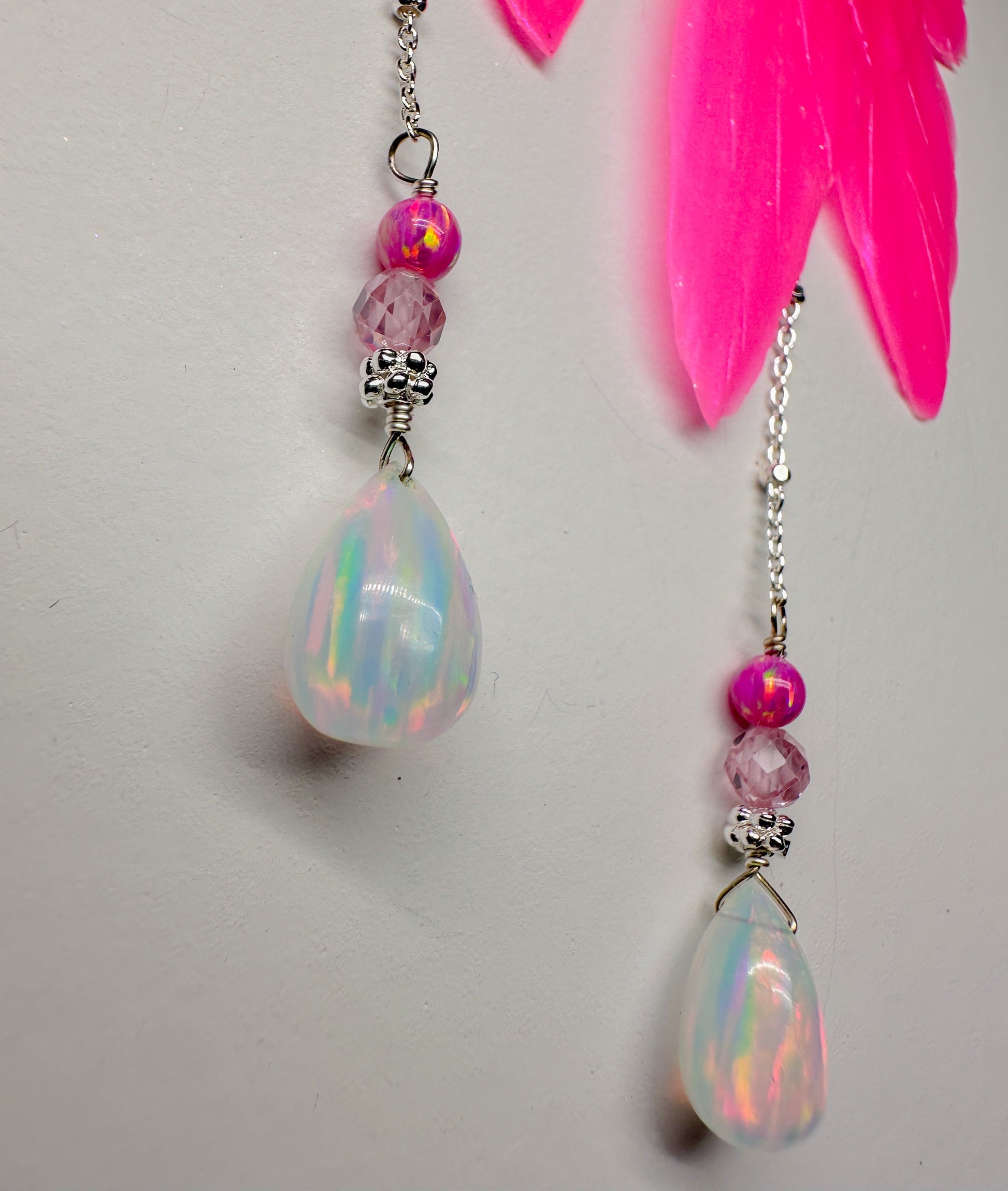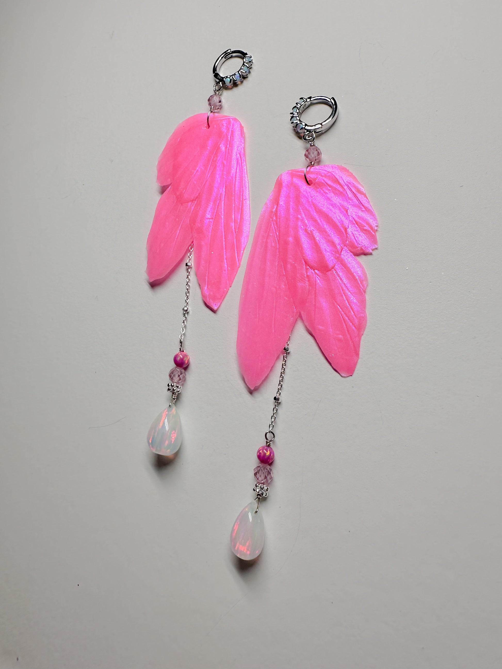Soft violet shimmer on vibrant neon wings with large chunky jelly opal drop on sterling chain with silver plated brass opal Huggies