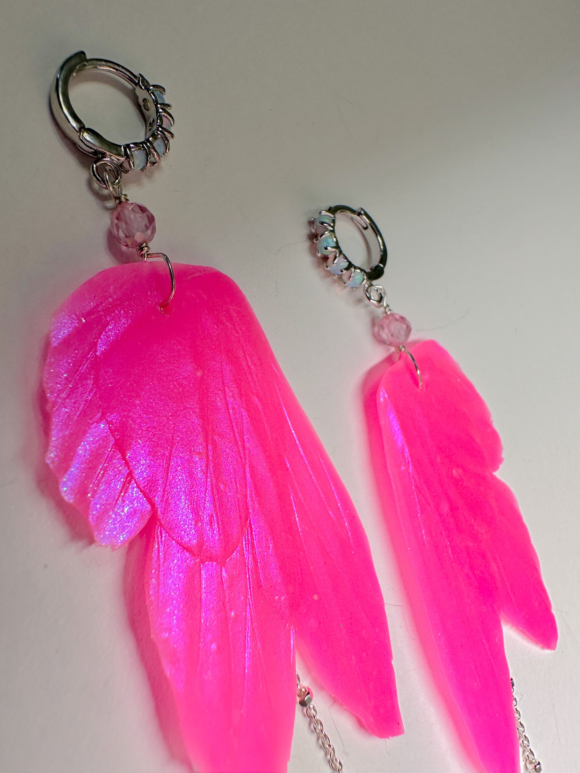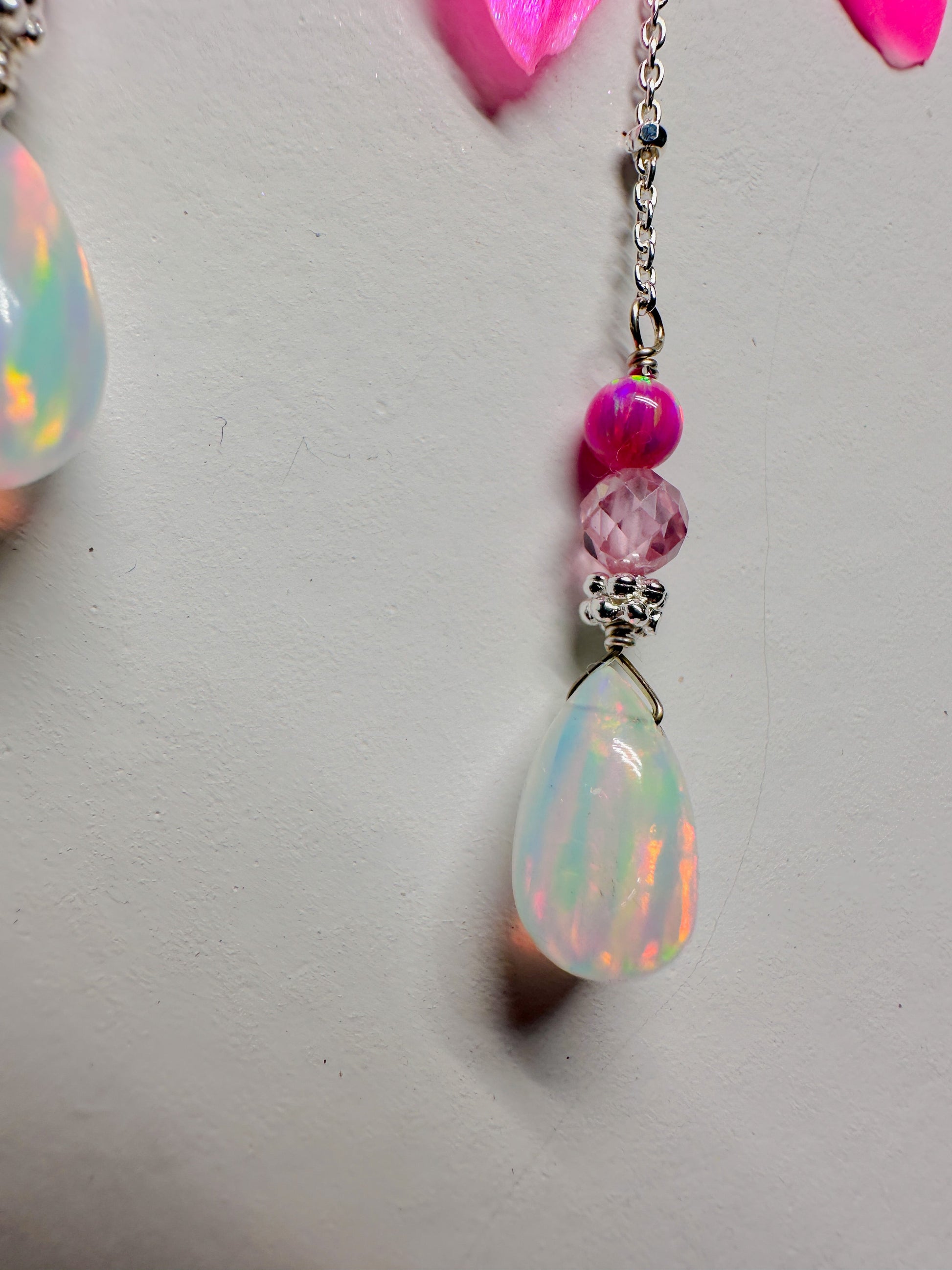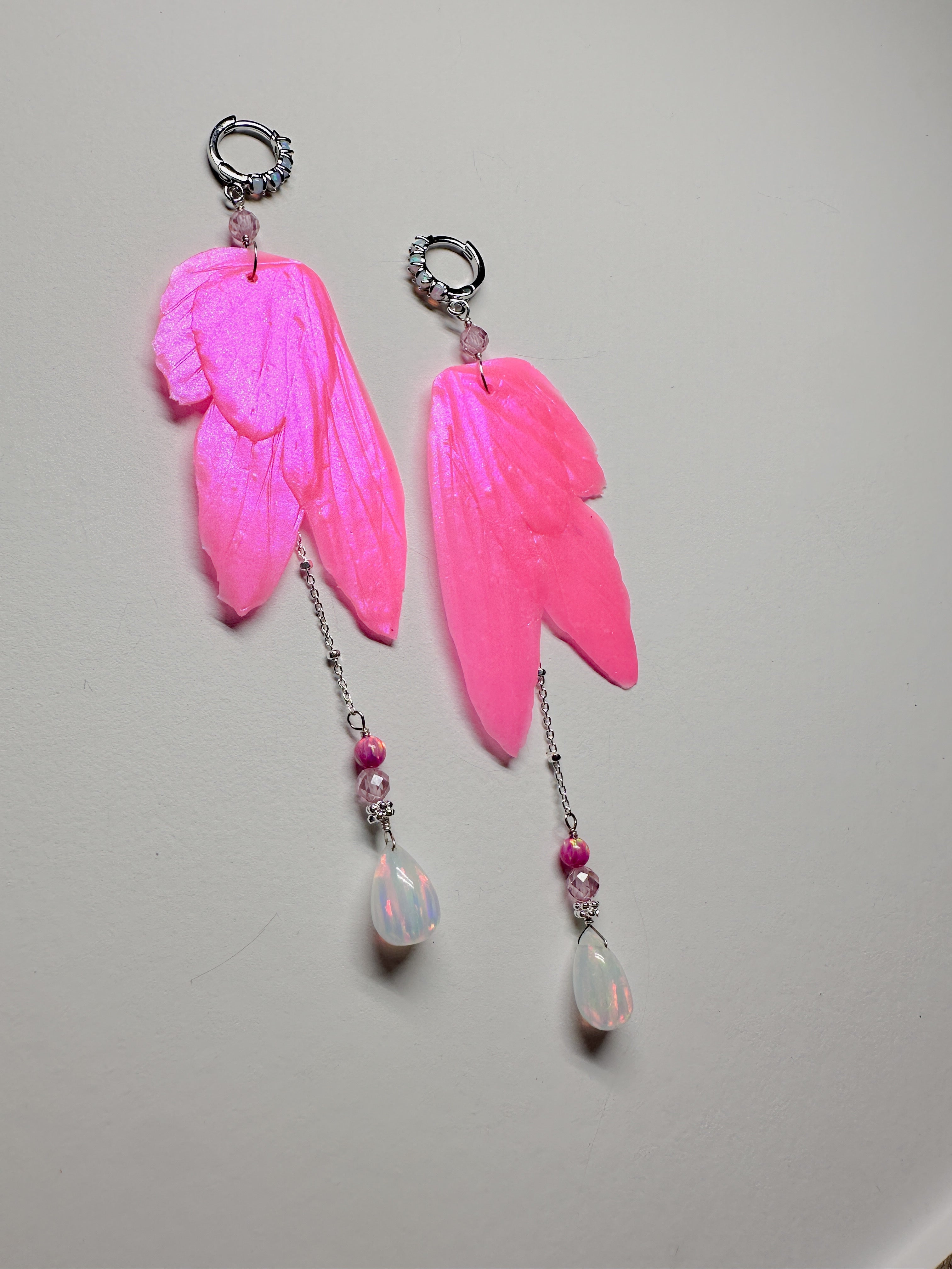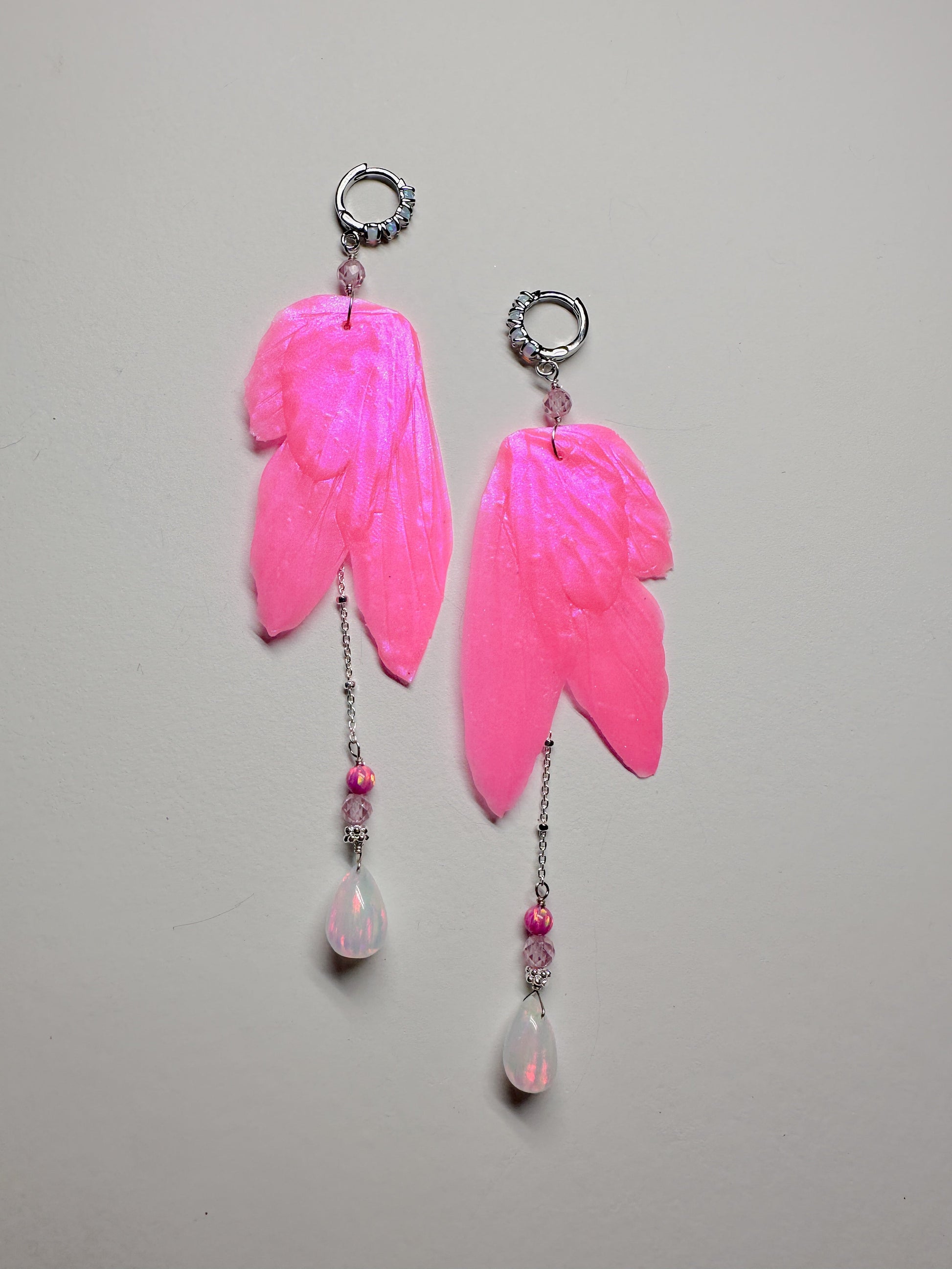 Soft violet shimmer on vibrant neon wings with large chunky jelly opal drop on sterling chain with silver plated brass opal Huggies