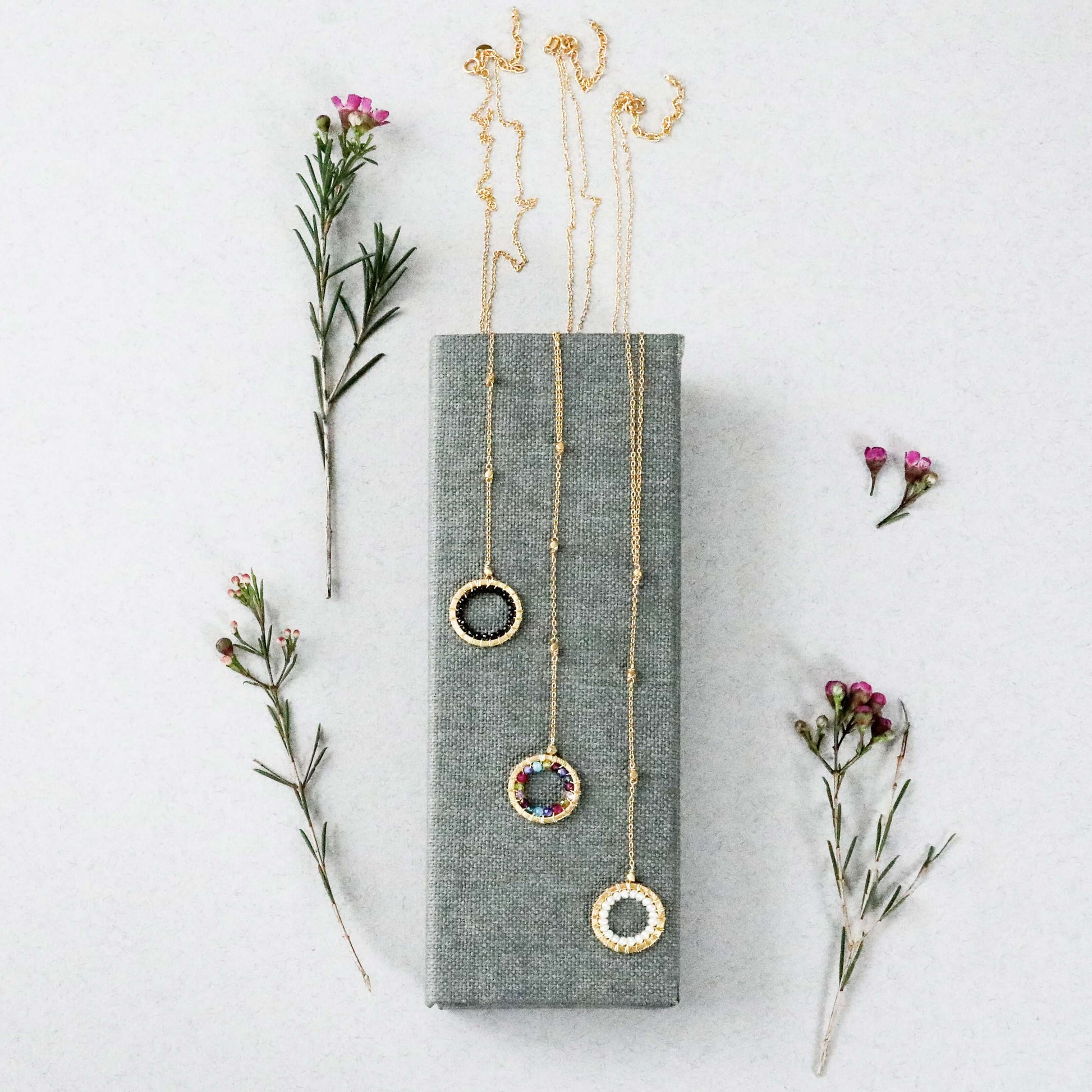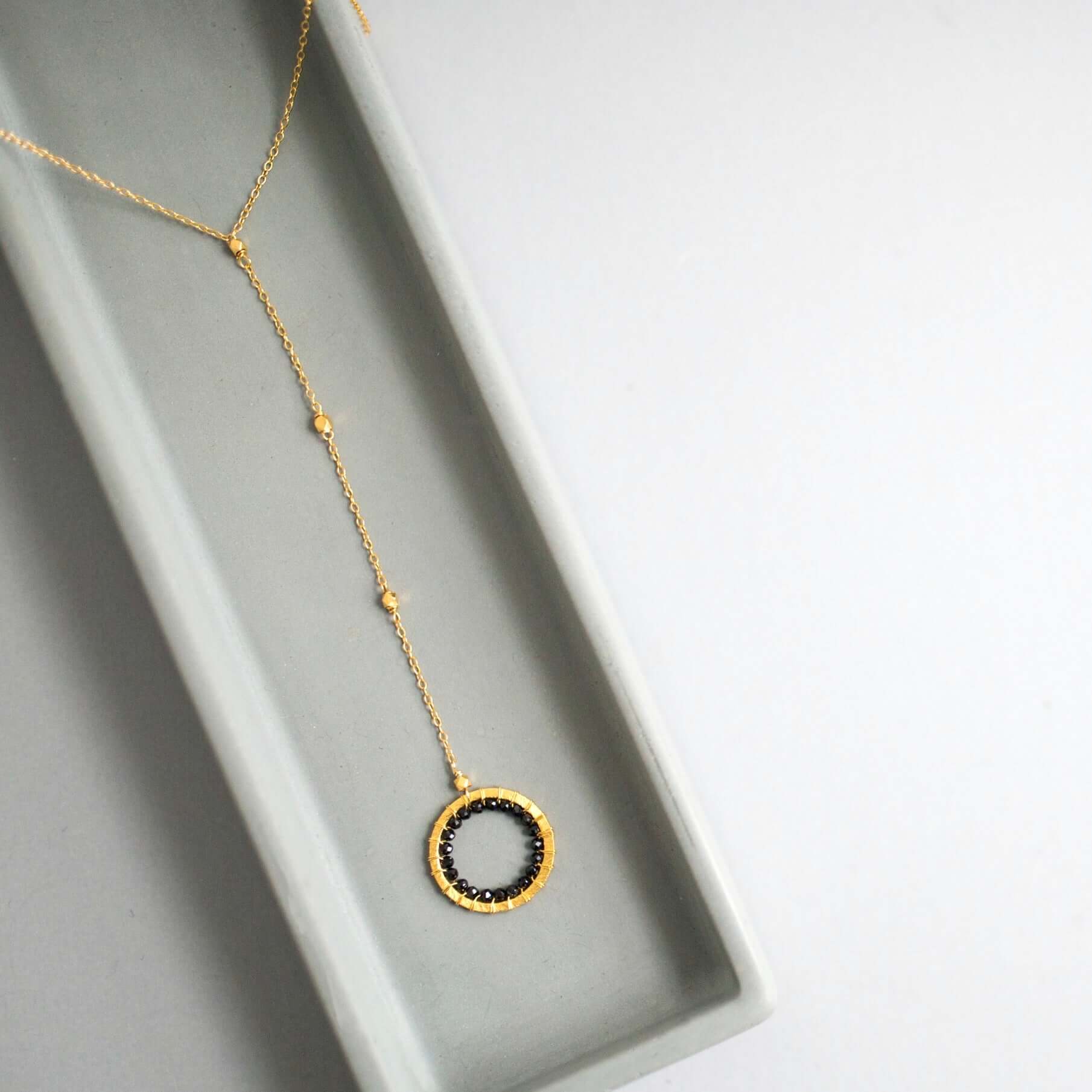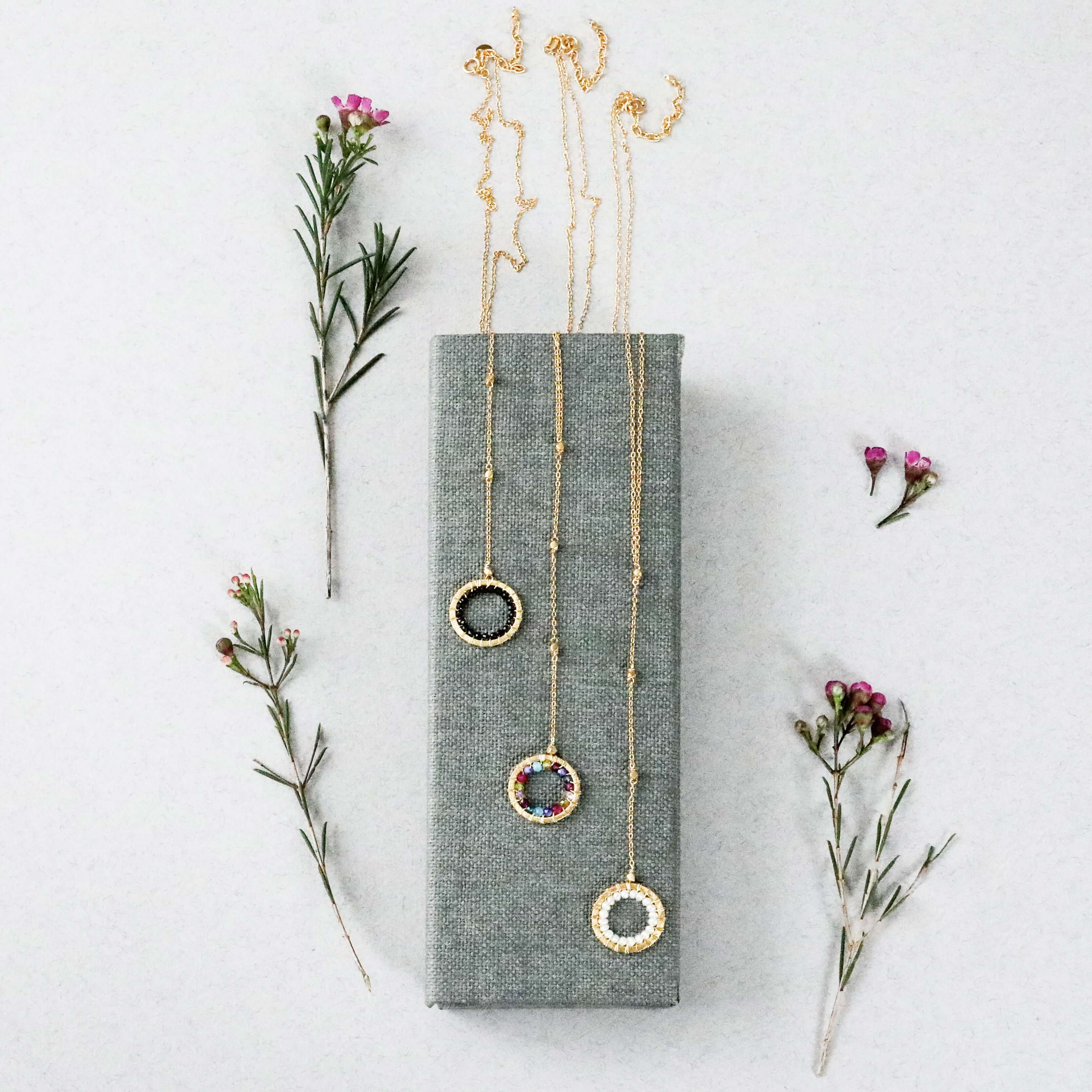The Halo collection was our very first one. Intended to symbolize the intricate, universal energy woven within us all. These beautiful necklaces are ultra lightweight and perfectly handmade featuring sparkling black spinel, lustrous pearl and a delicious rainbow of gems woven into our unique, mini floating Y pendant design.