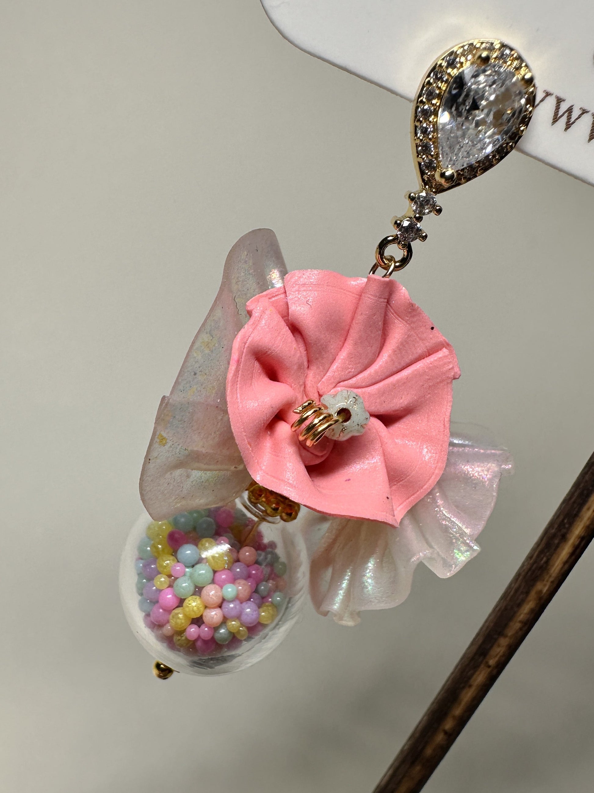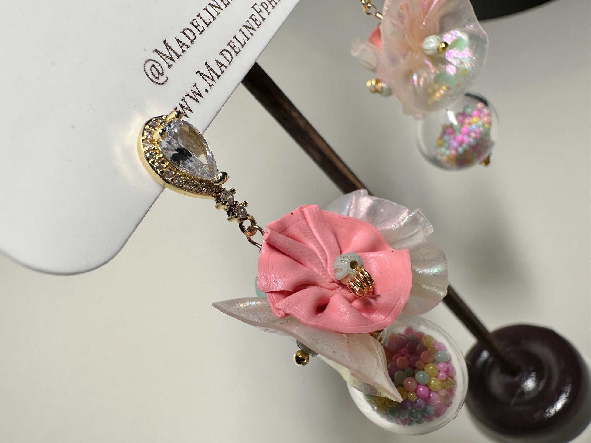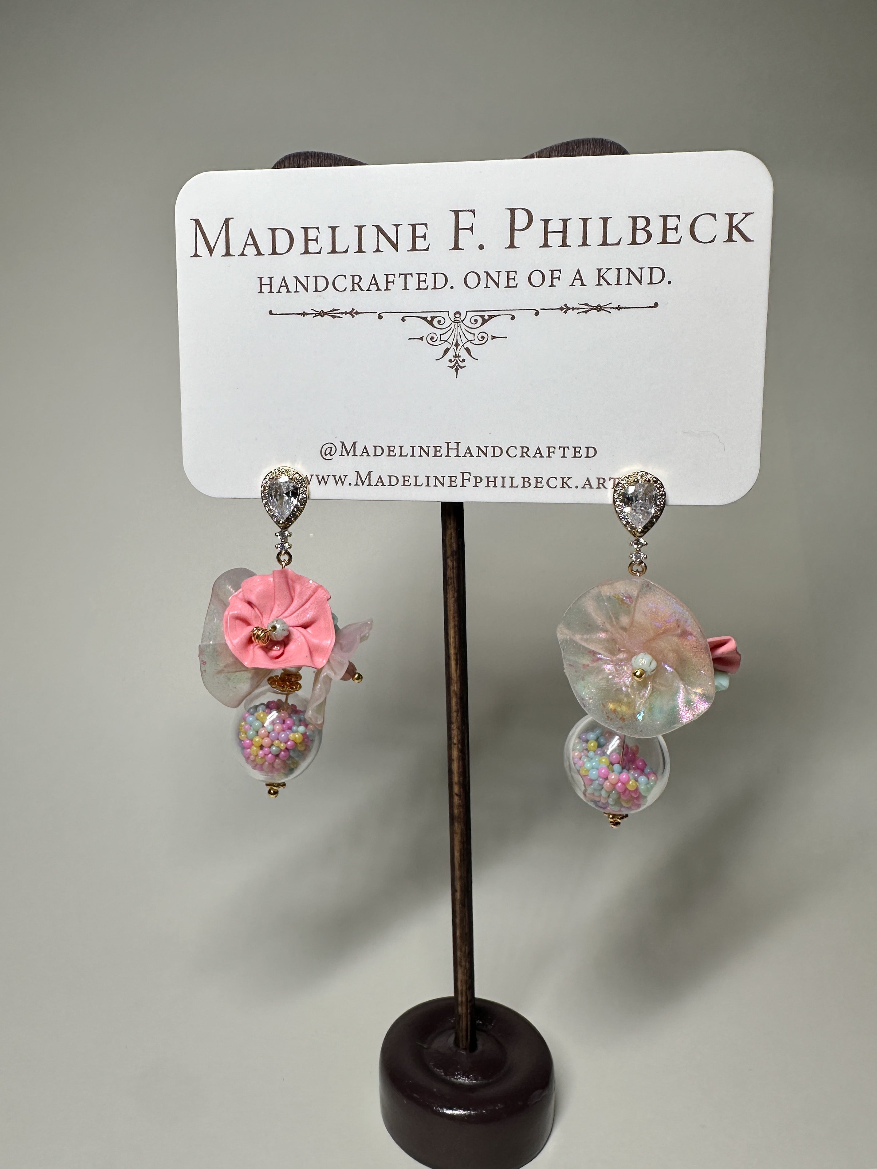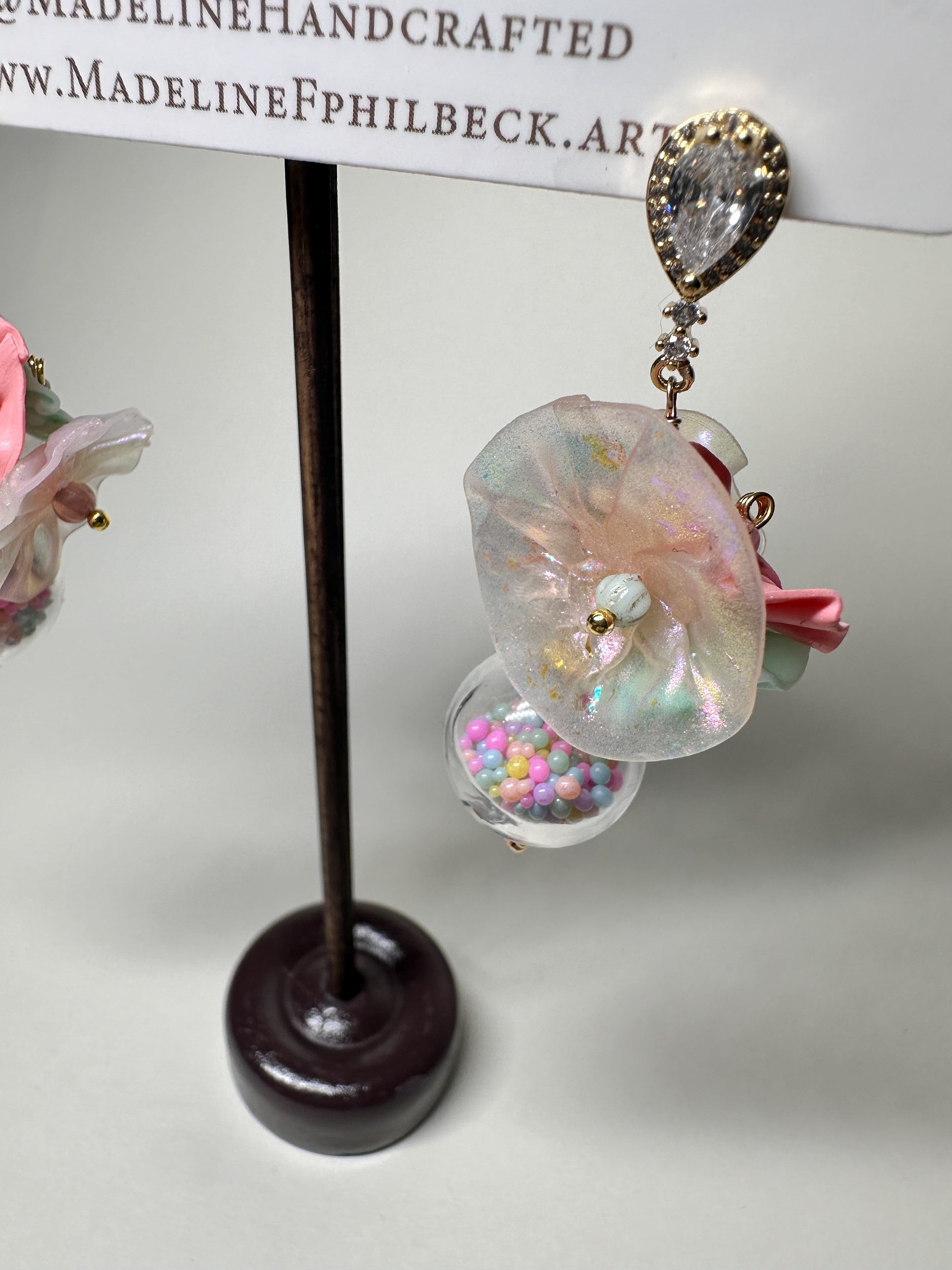 Bright pink and shimmering iridescent flowers on top of a pastel gumball blown glass ball on crystal studs with sterling post
