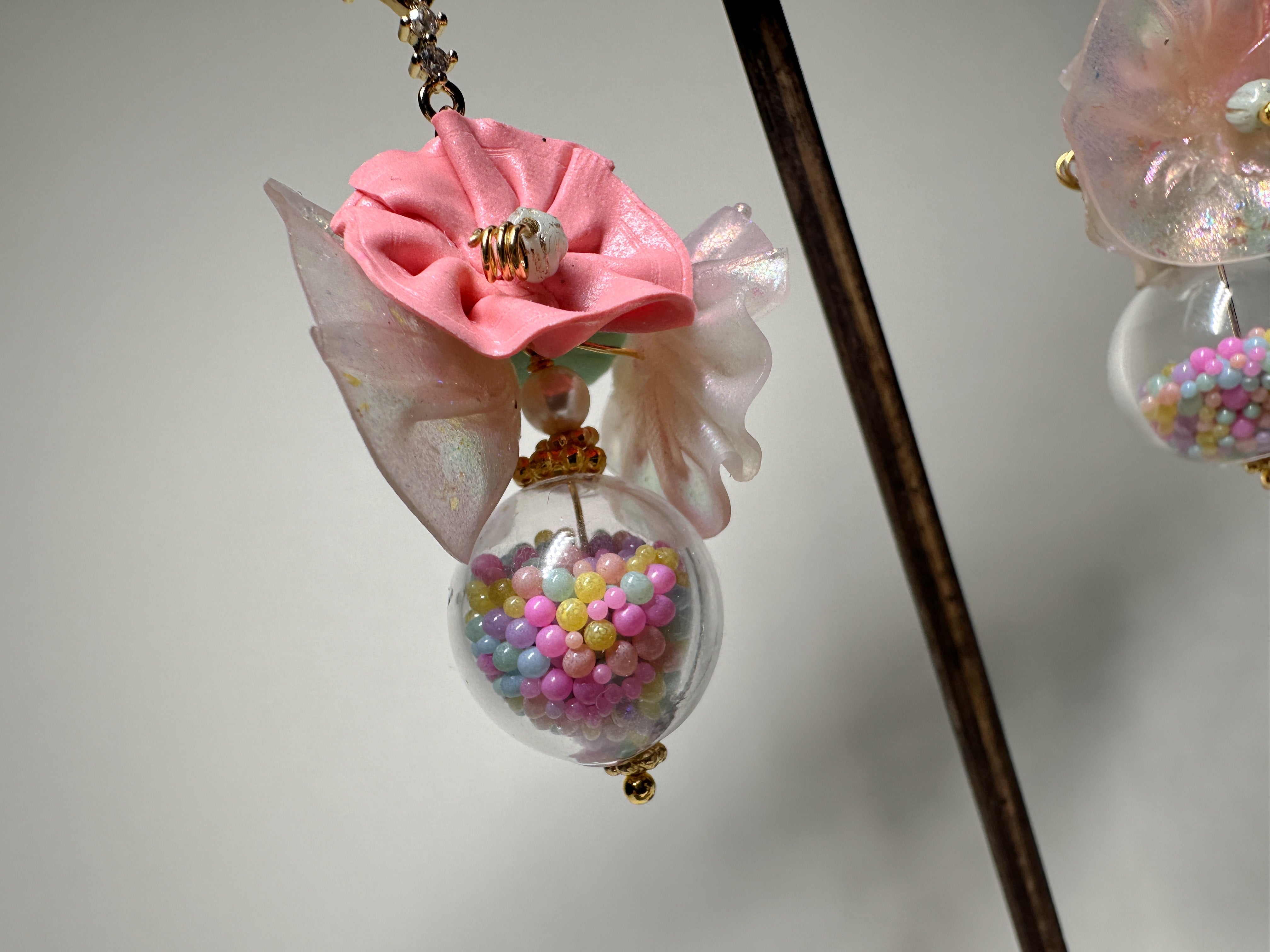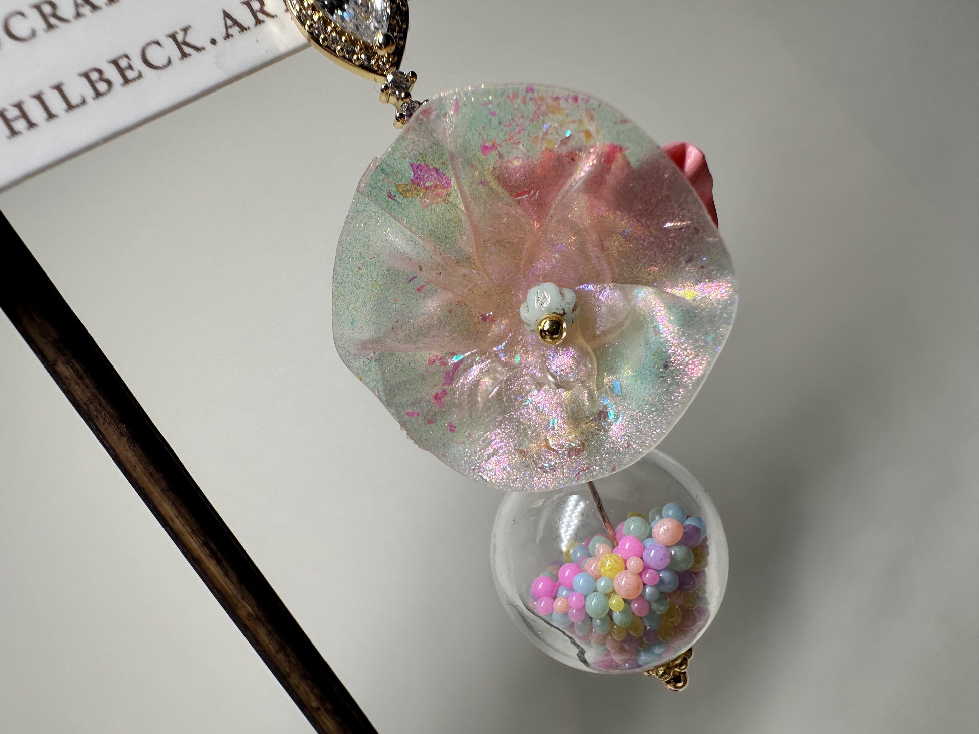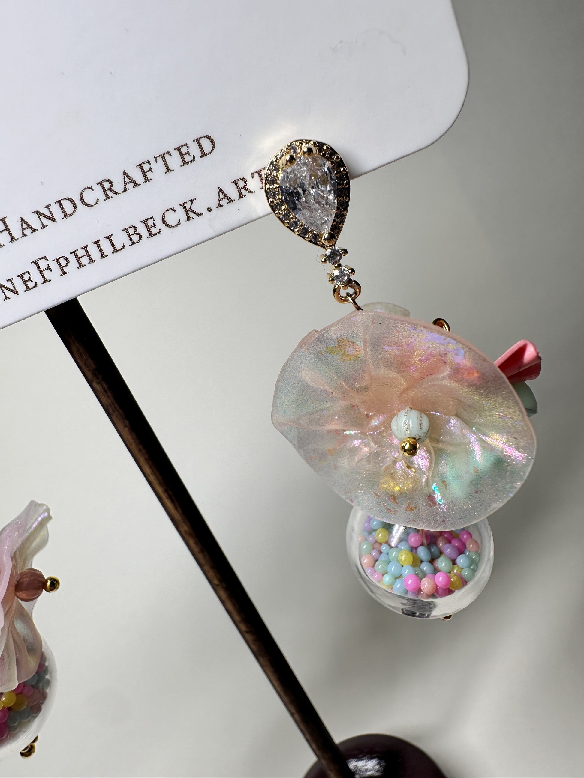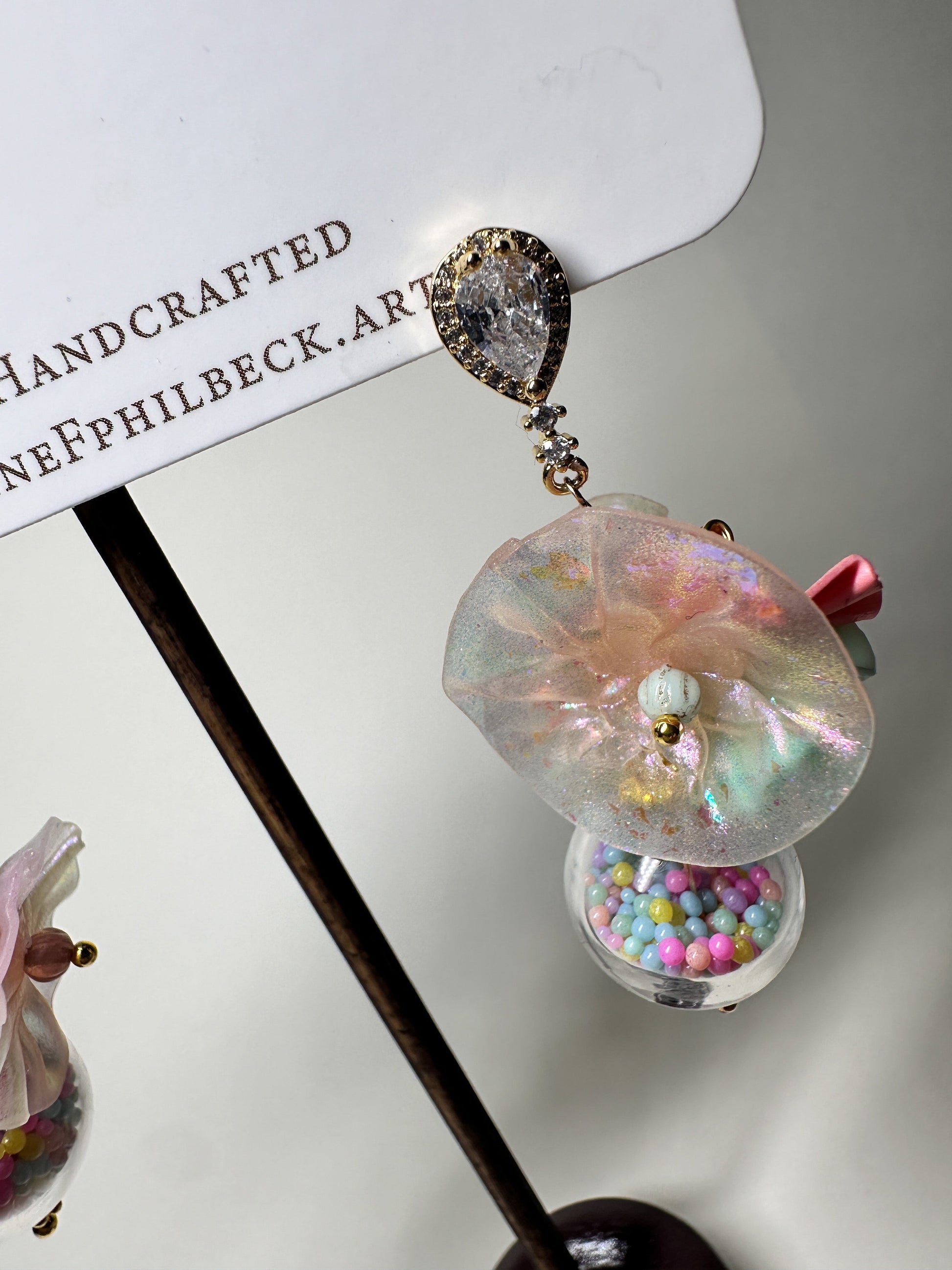 Bright pink and shimmering iridescent flowers on top of a pastel gumball blown glass ball on crystal studs with sterling post