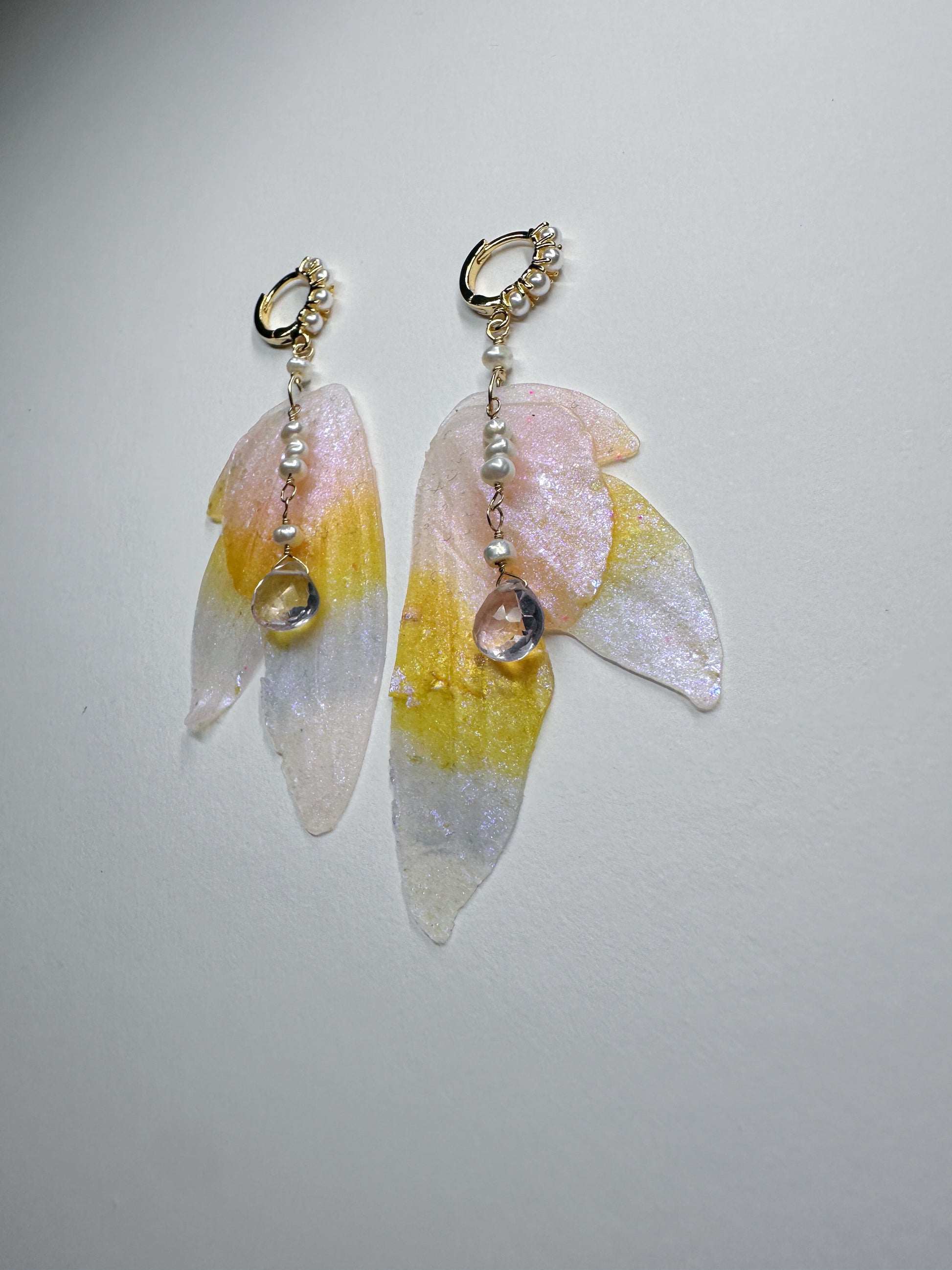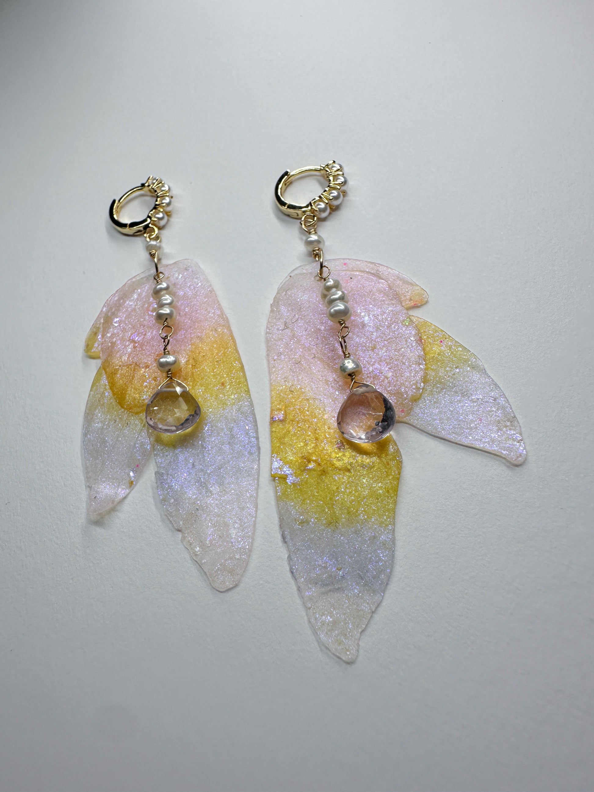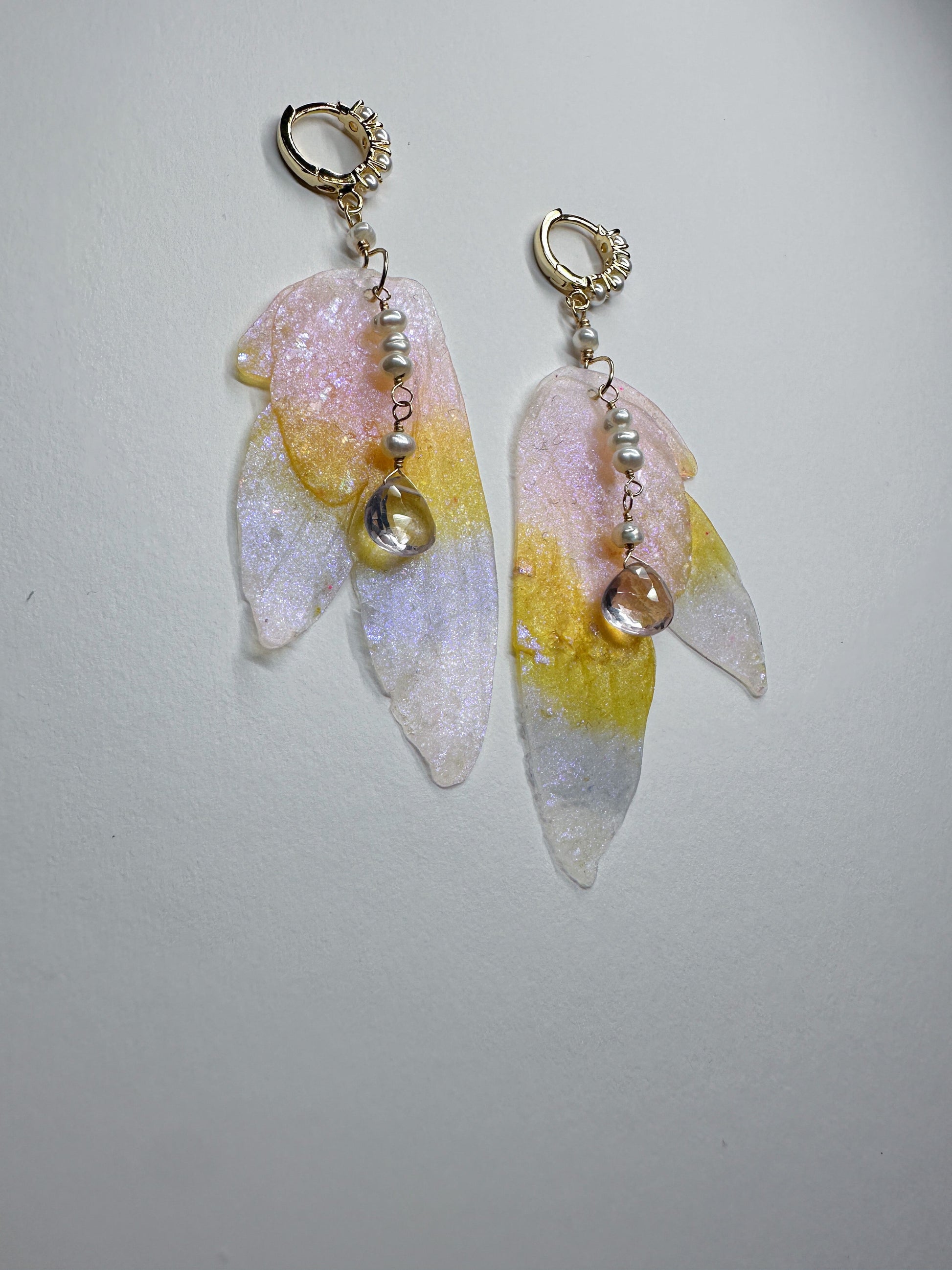 Soft pastel hues shimmering throughout the wings with gold and pearl detail