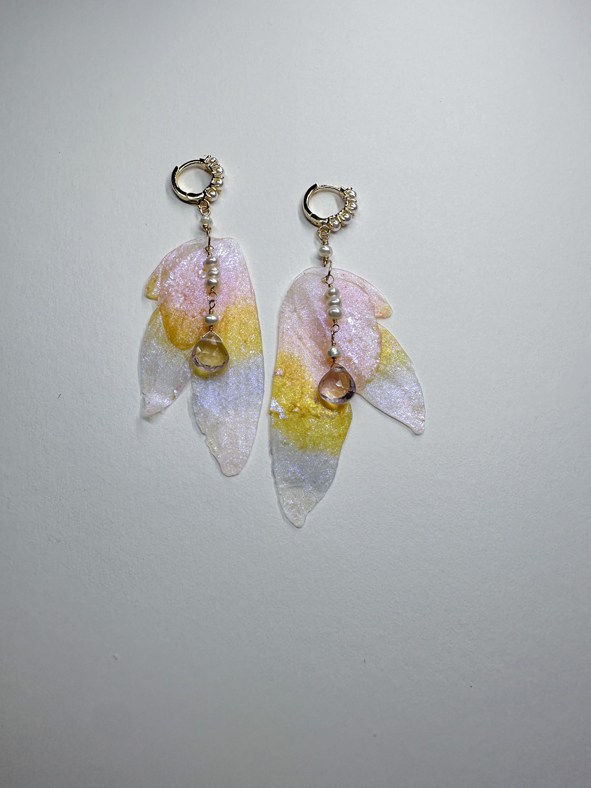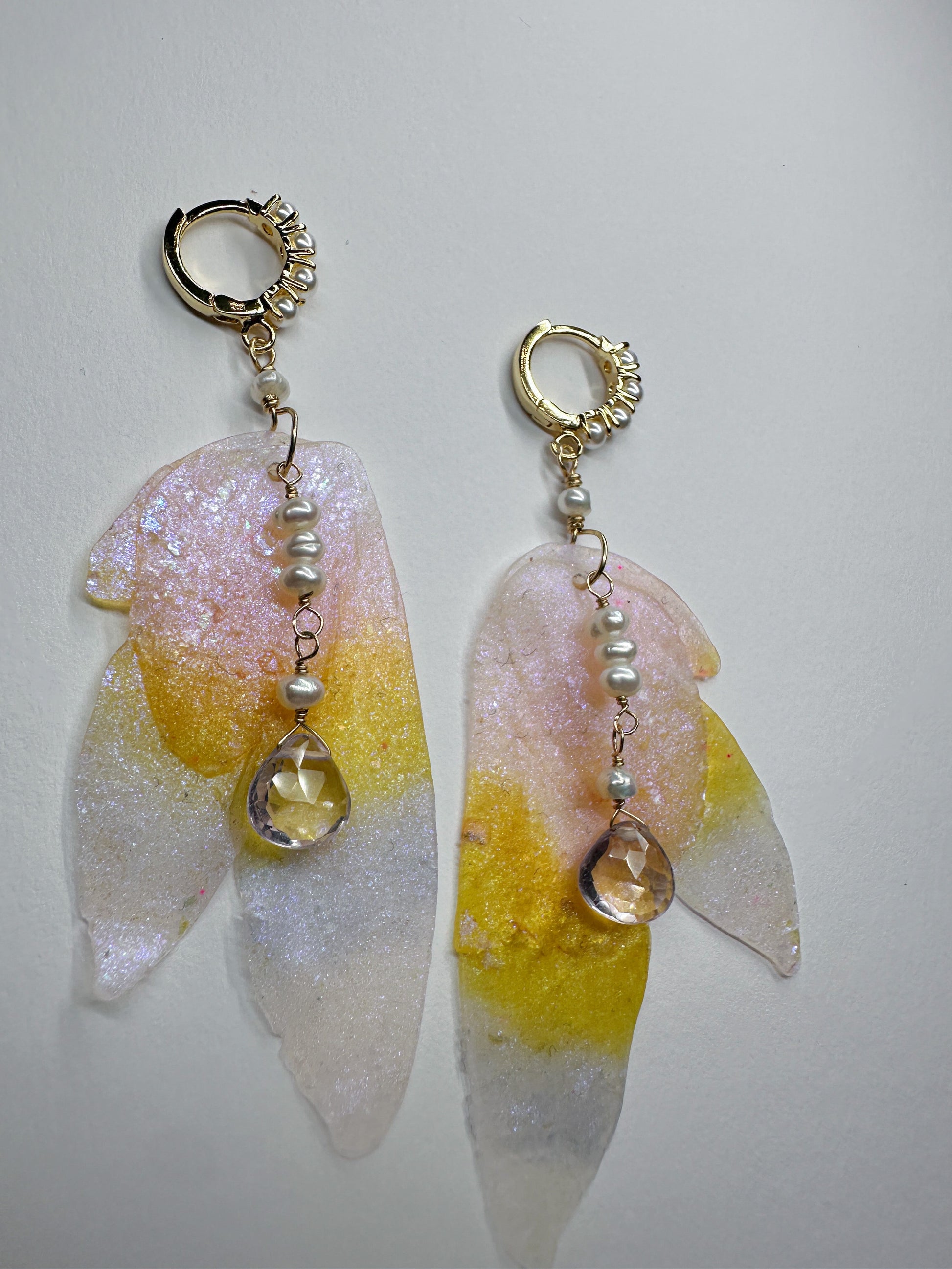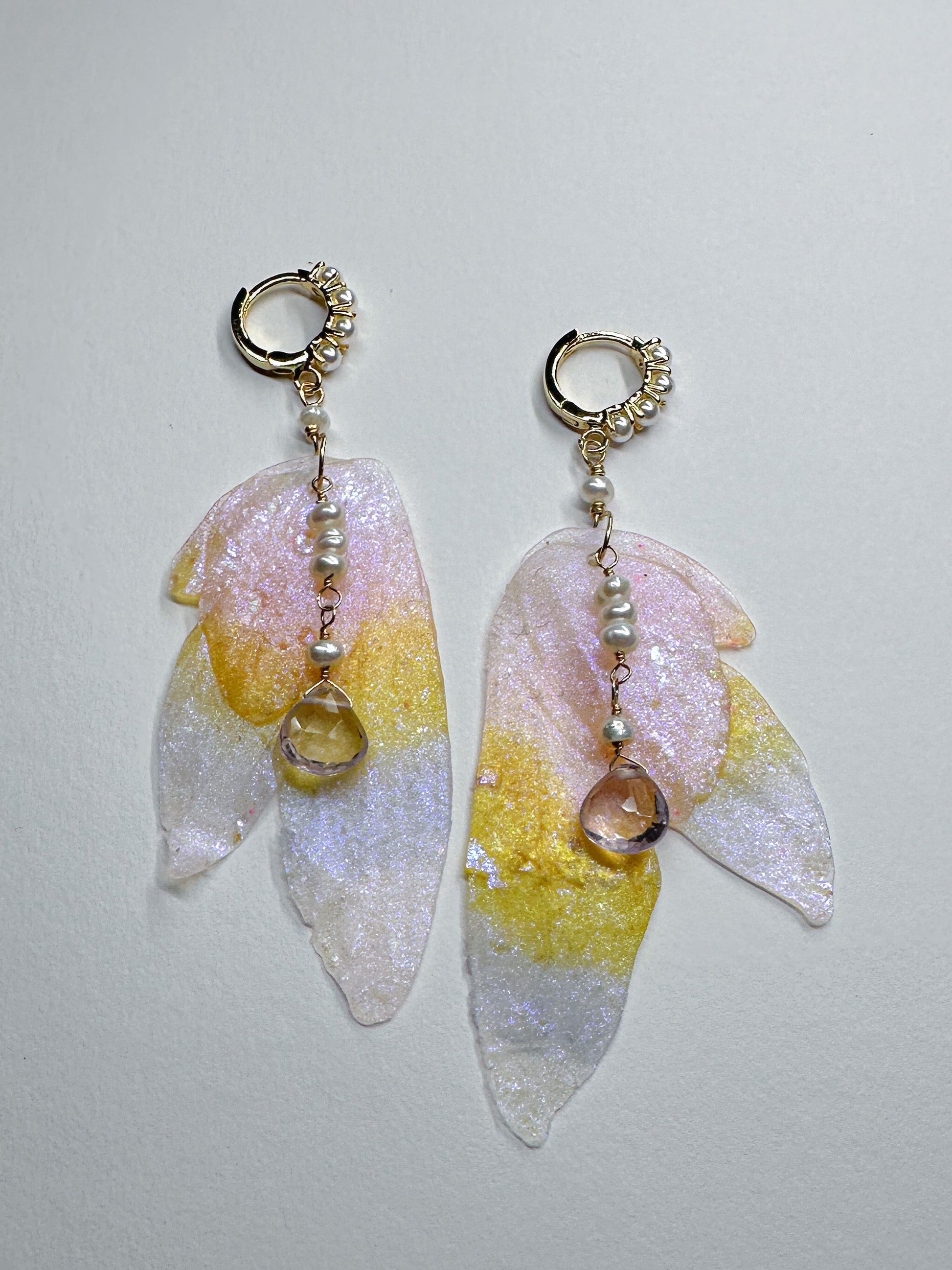 Soft pastel hues shimmering throughout the wings with gold and pearl detail