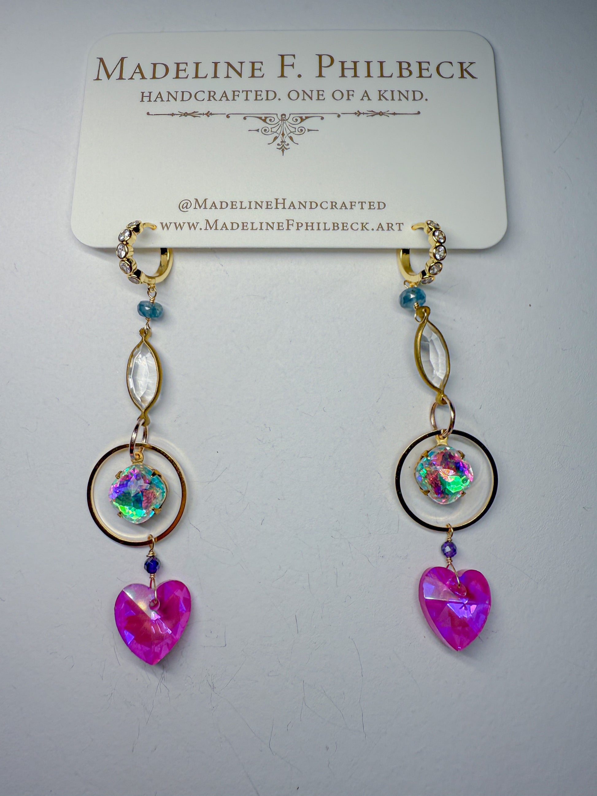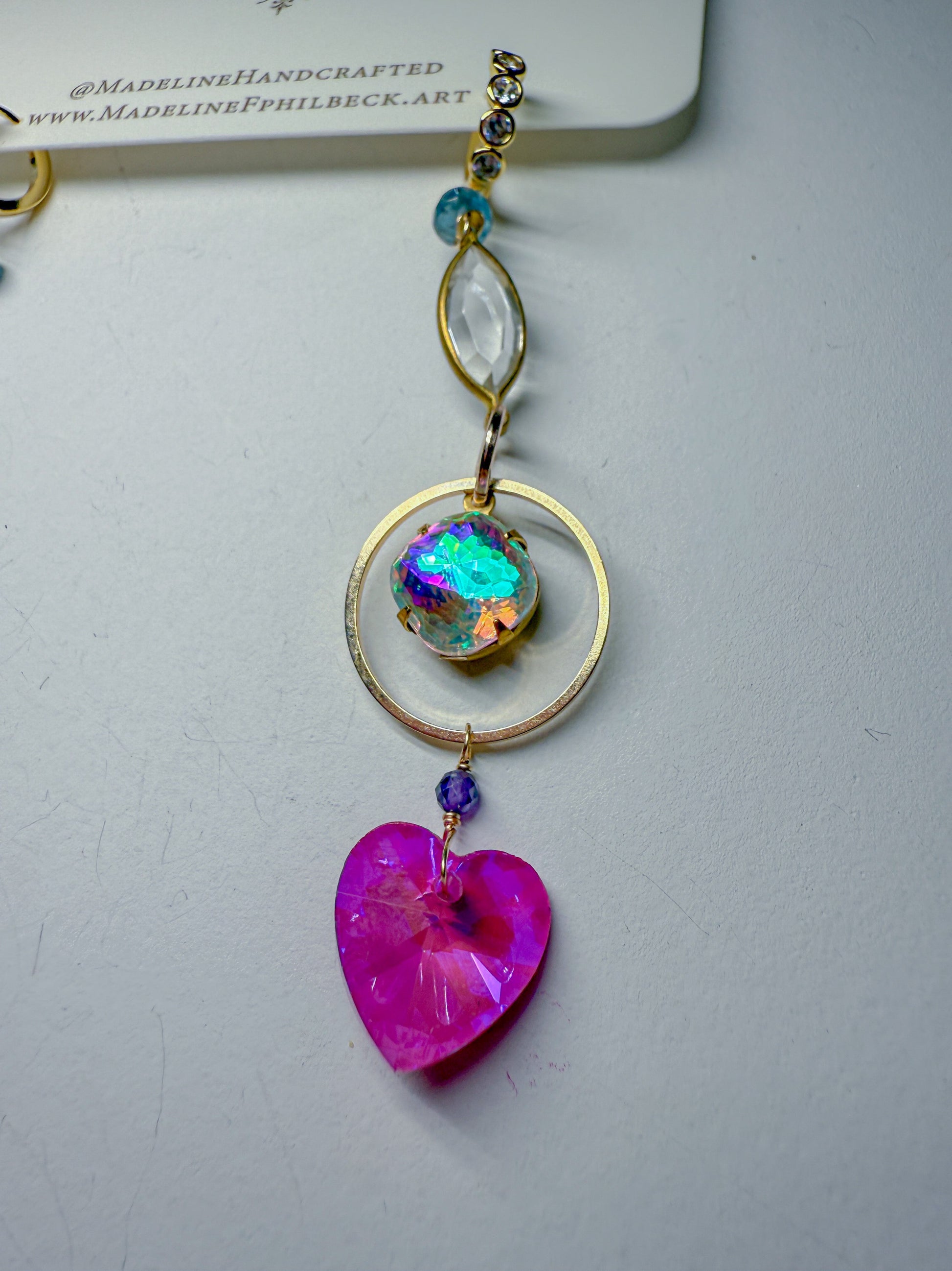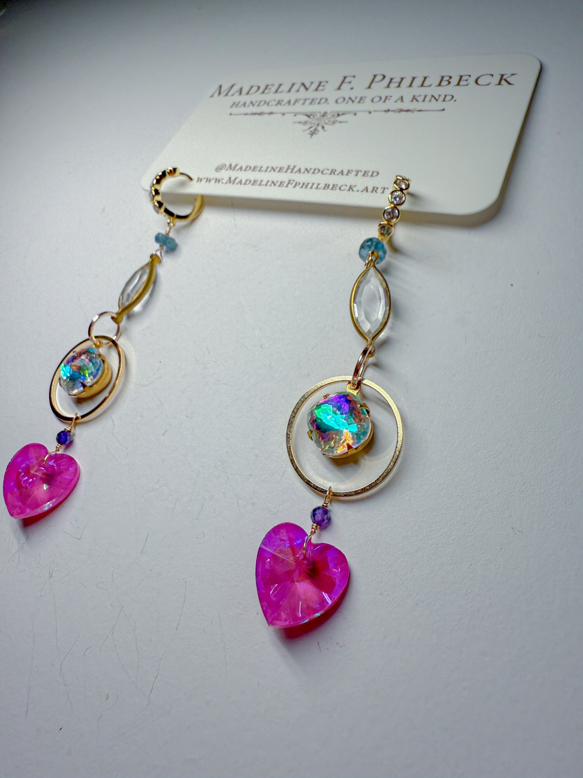 Fuschia sparkle heart and vintage set pink and green shift Swarovski with vintage crystal navette on brass Huggies