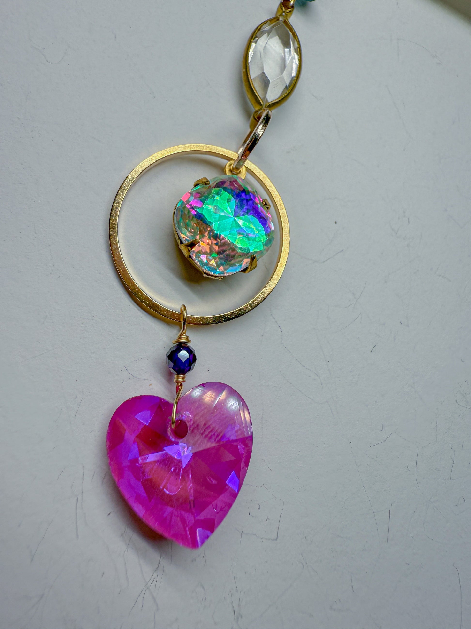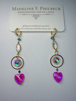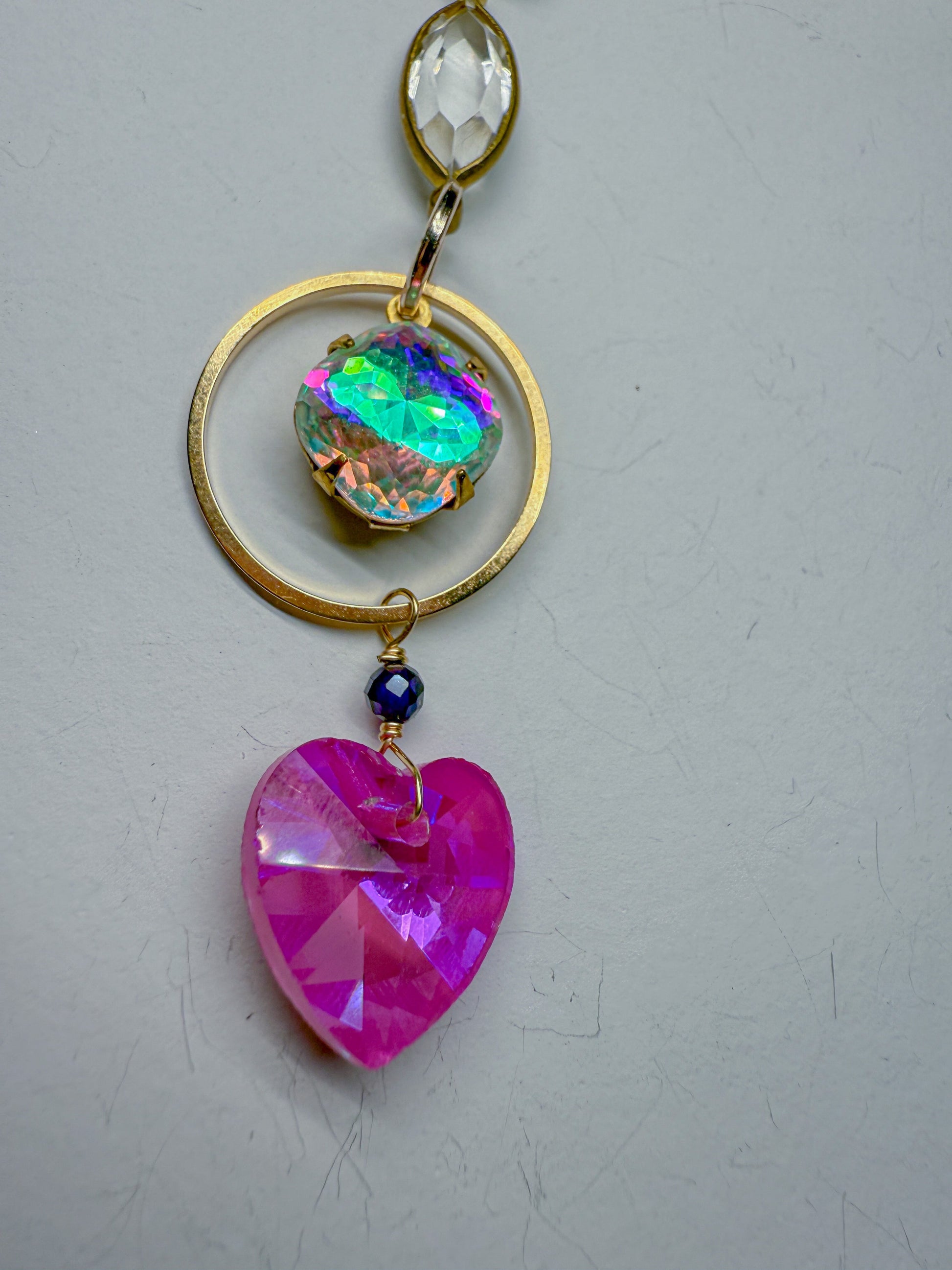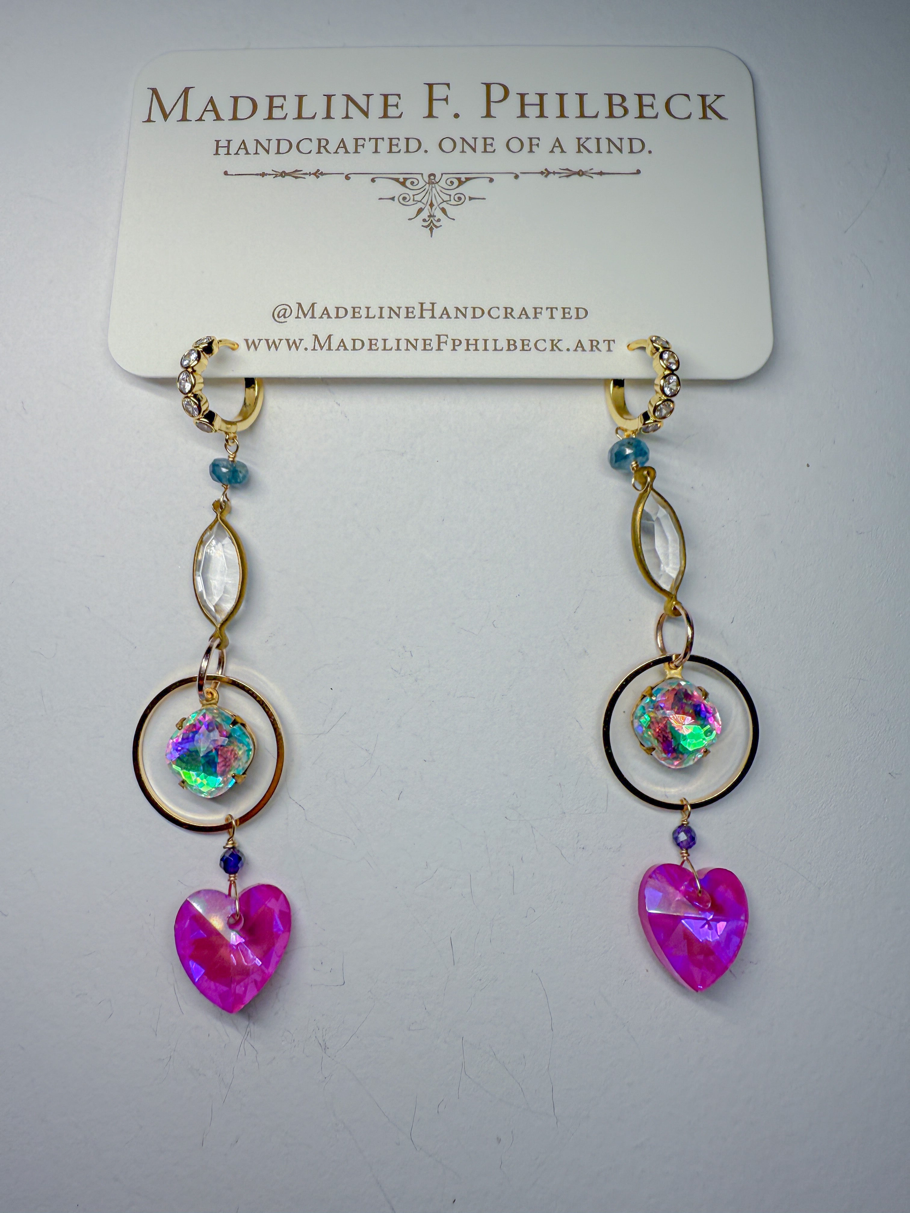 Fuschia sparkle heart and vintage set pink and green shift Swarovski with vintage crystal navette on brass Huggies