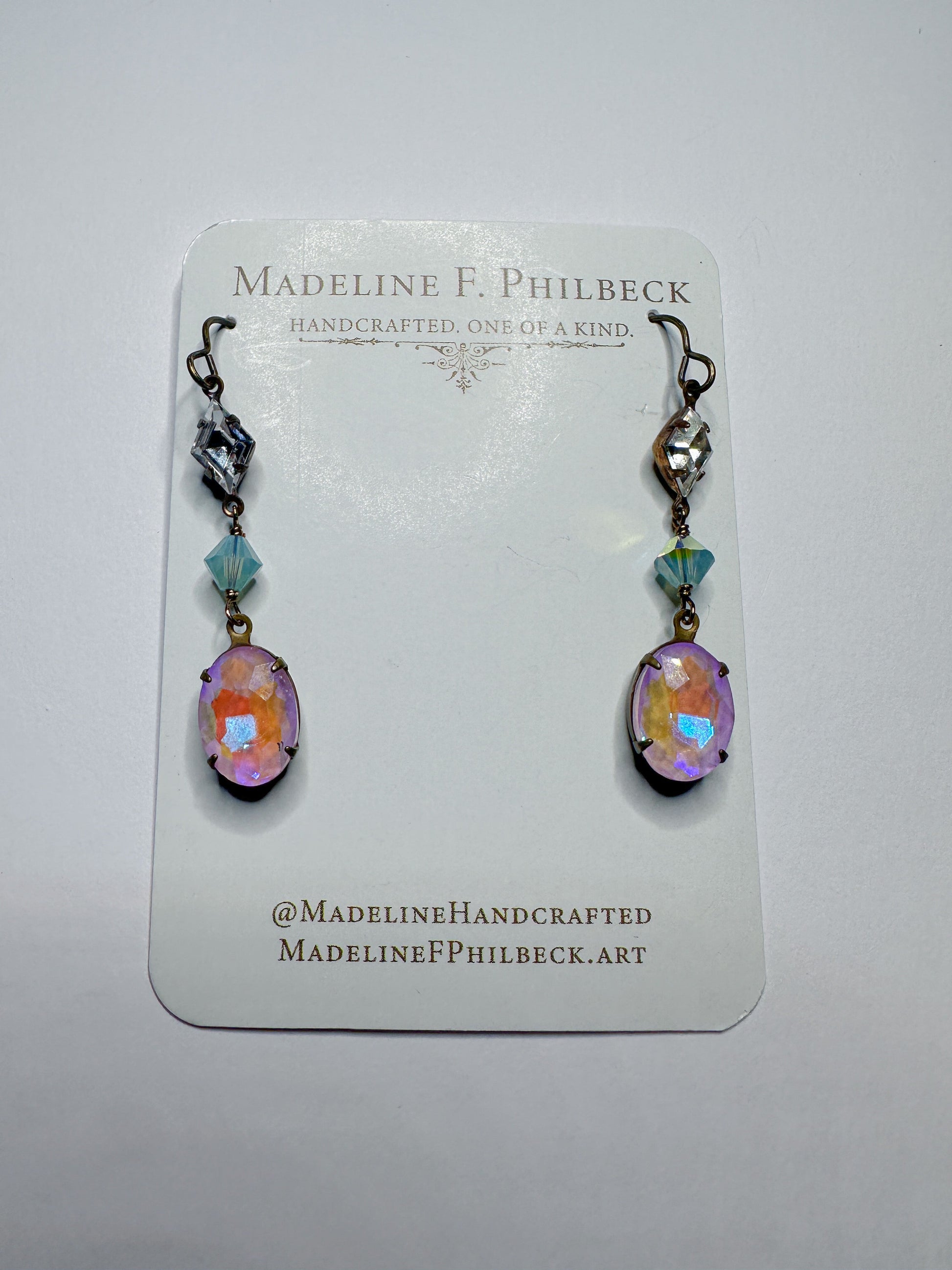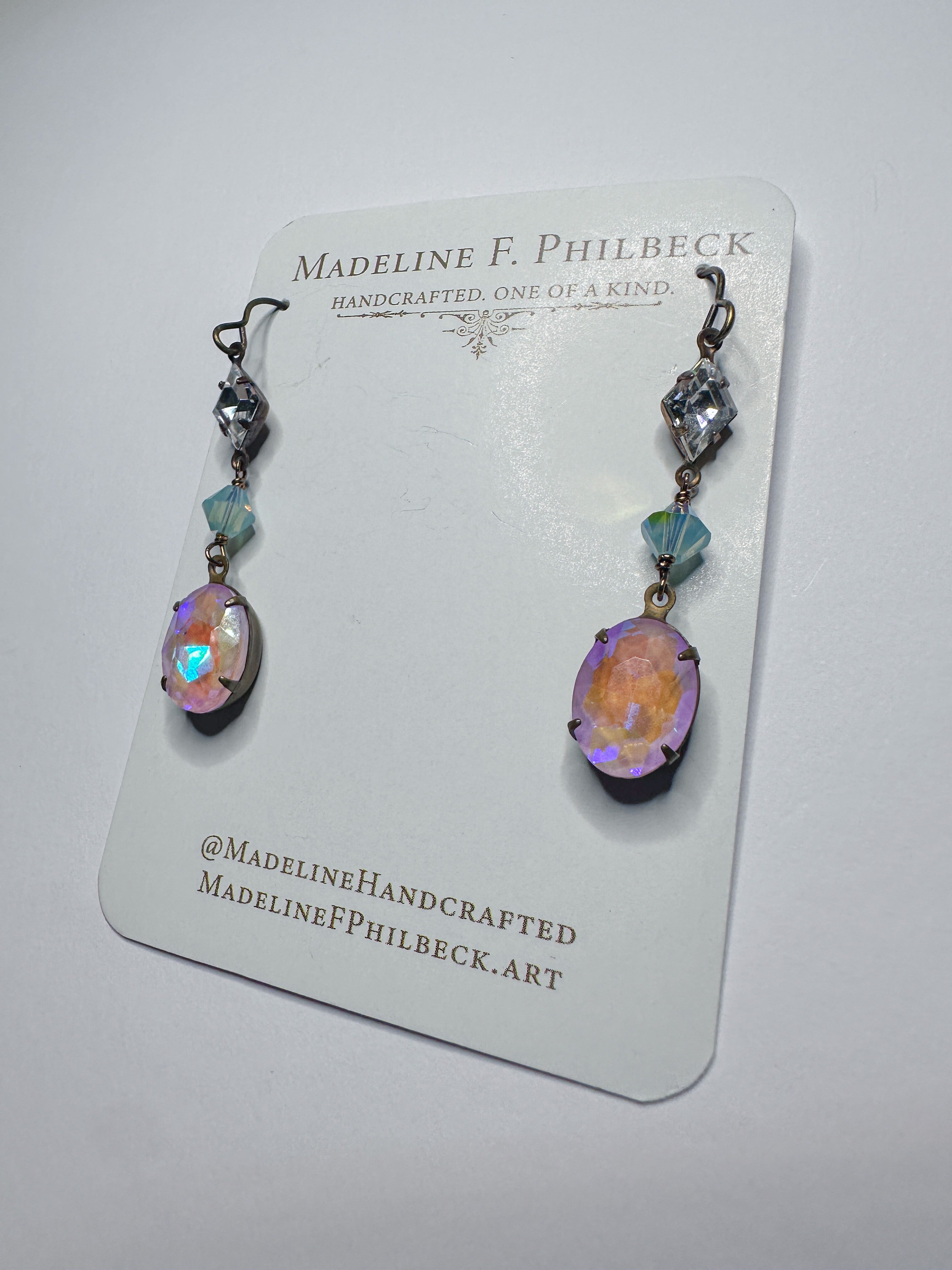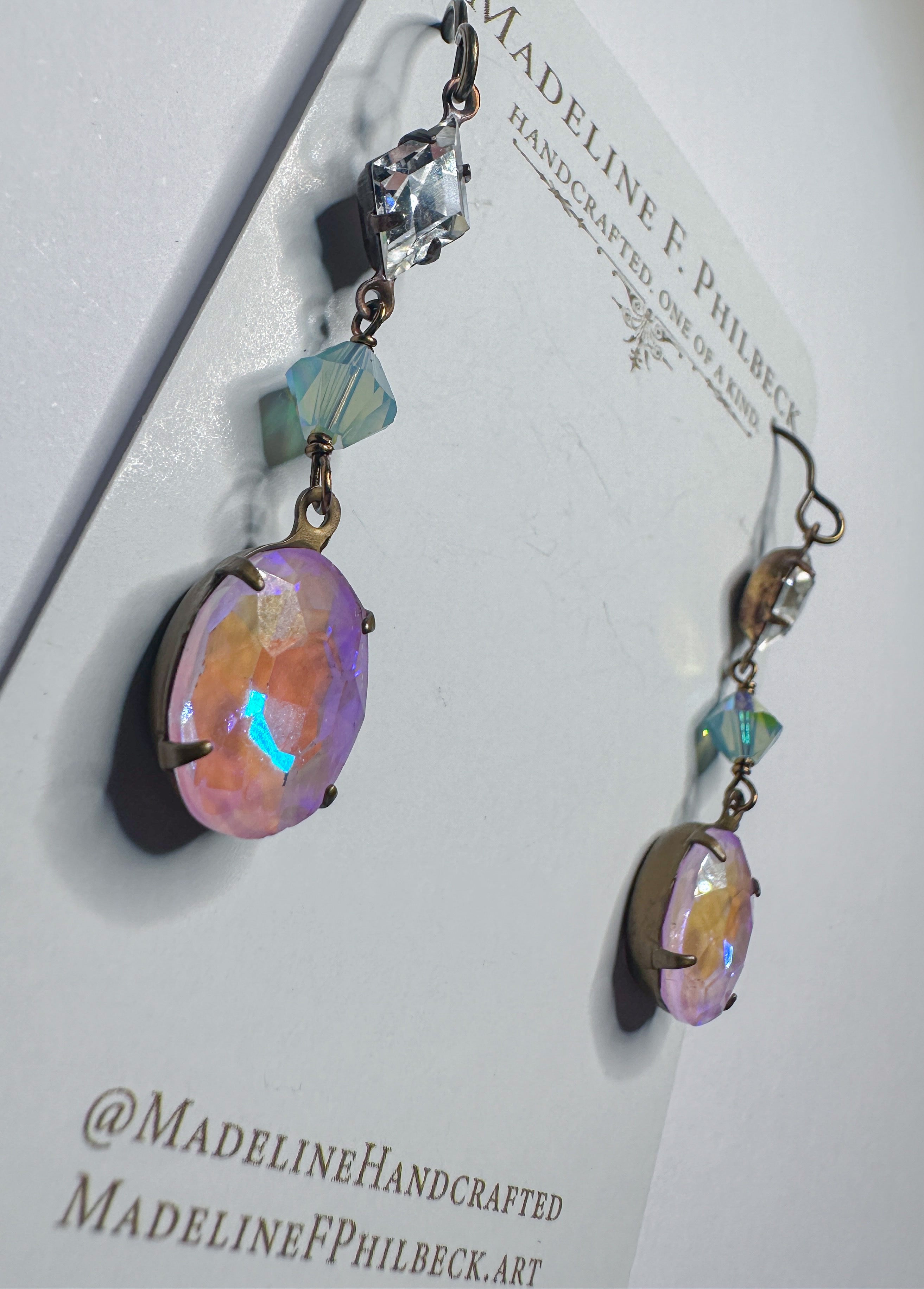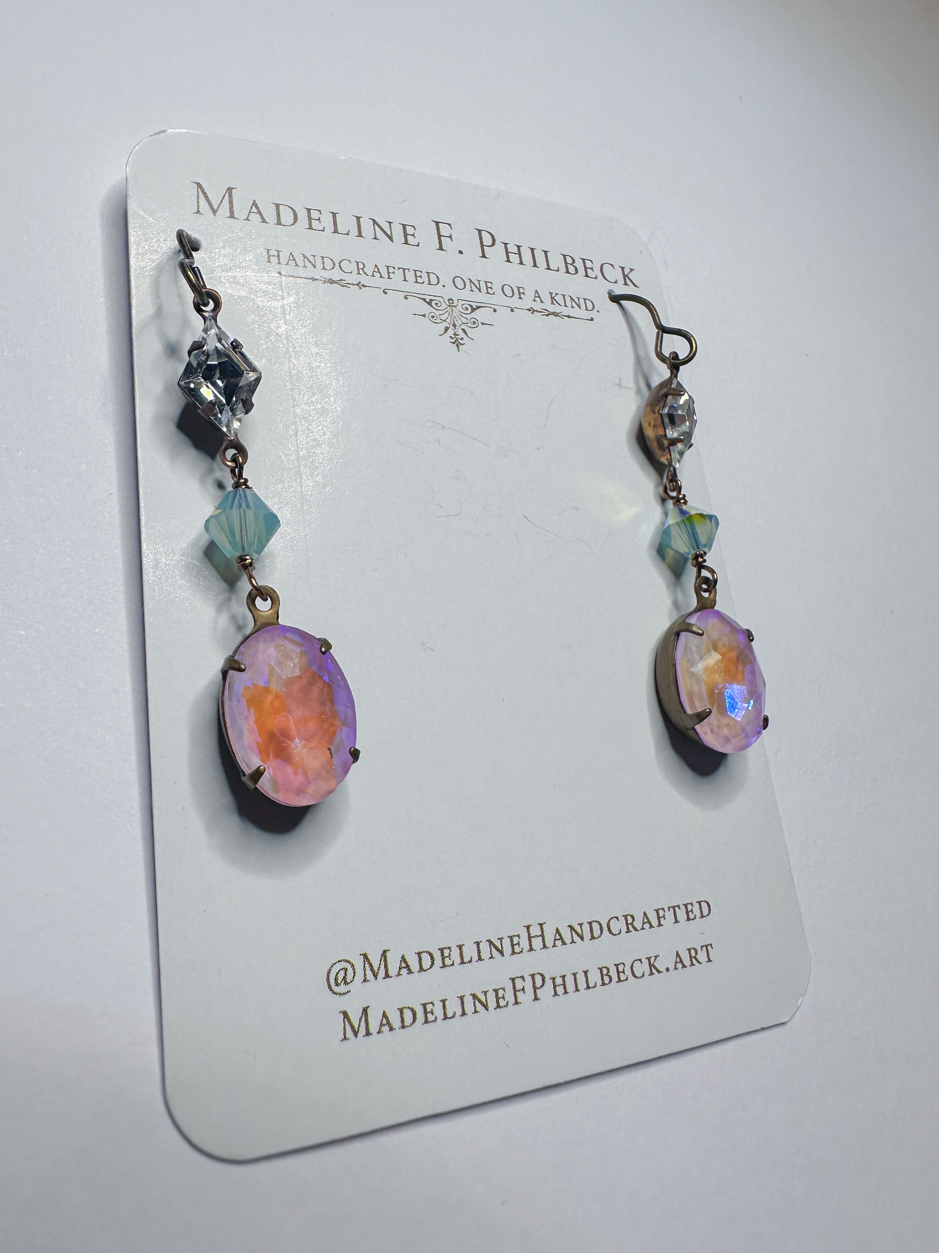 Vintage Cheyenne pink and indigo flash crystal with mint green Swarovski with antique Swarovski diamond on brass hooks
