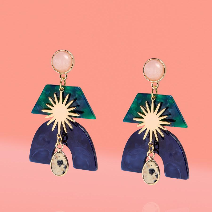 A breathtaking "hero" piece for the true maximalist, designed to be the vibrant, neutral statement earring you never thought you needed. The Fatima Statement Glam Dangles feature a striking Boho print mix in deep teal and navy tones, creating a sophisticated balance of pattern. Topped with luminous rose quartz and finished with a grounded dalmatian jasper drop, these earrings are a masterclass in mixed-media artisan jewelry.