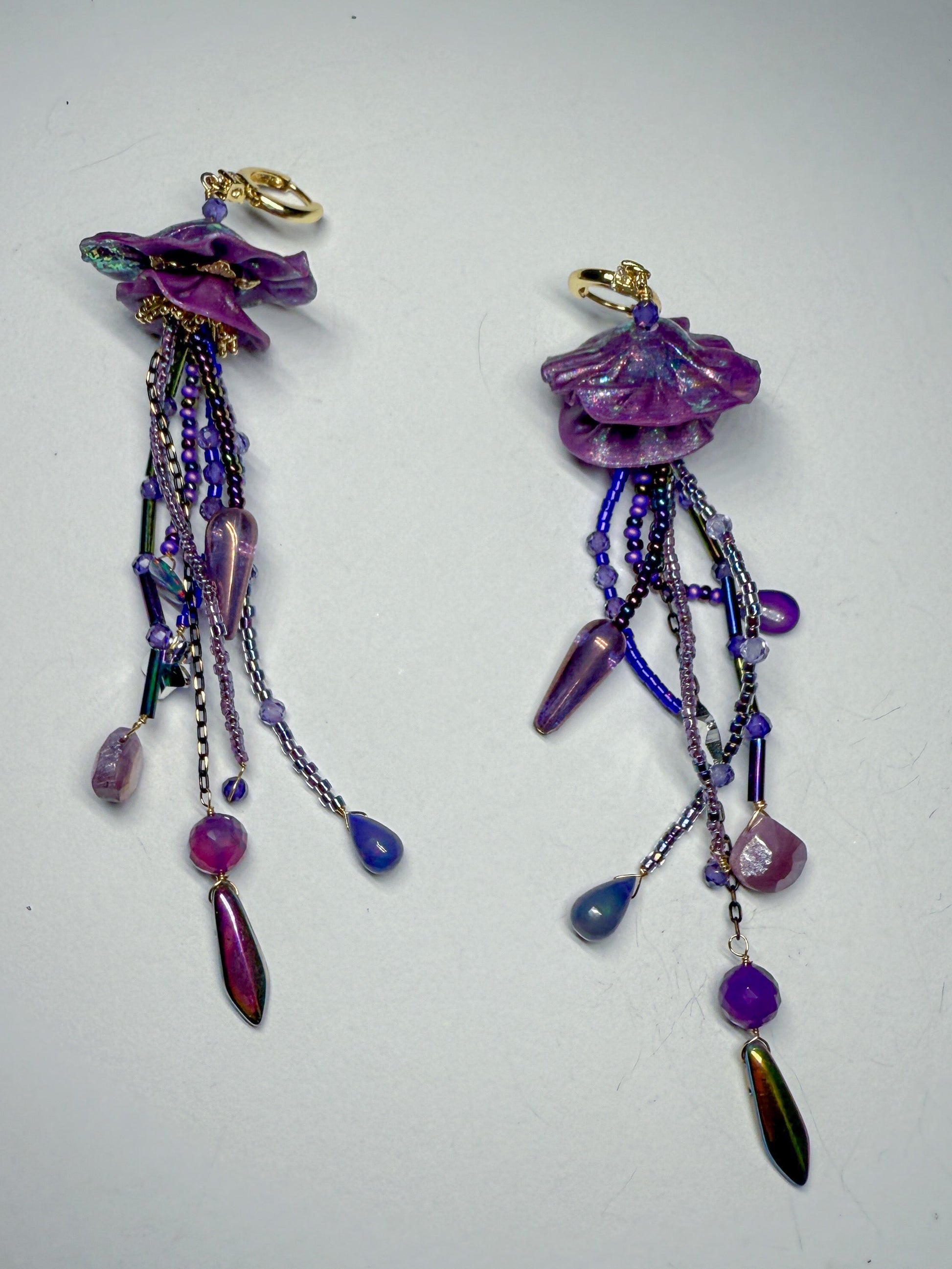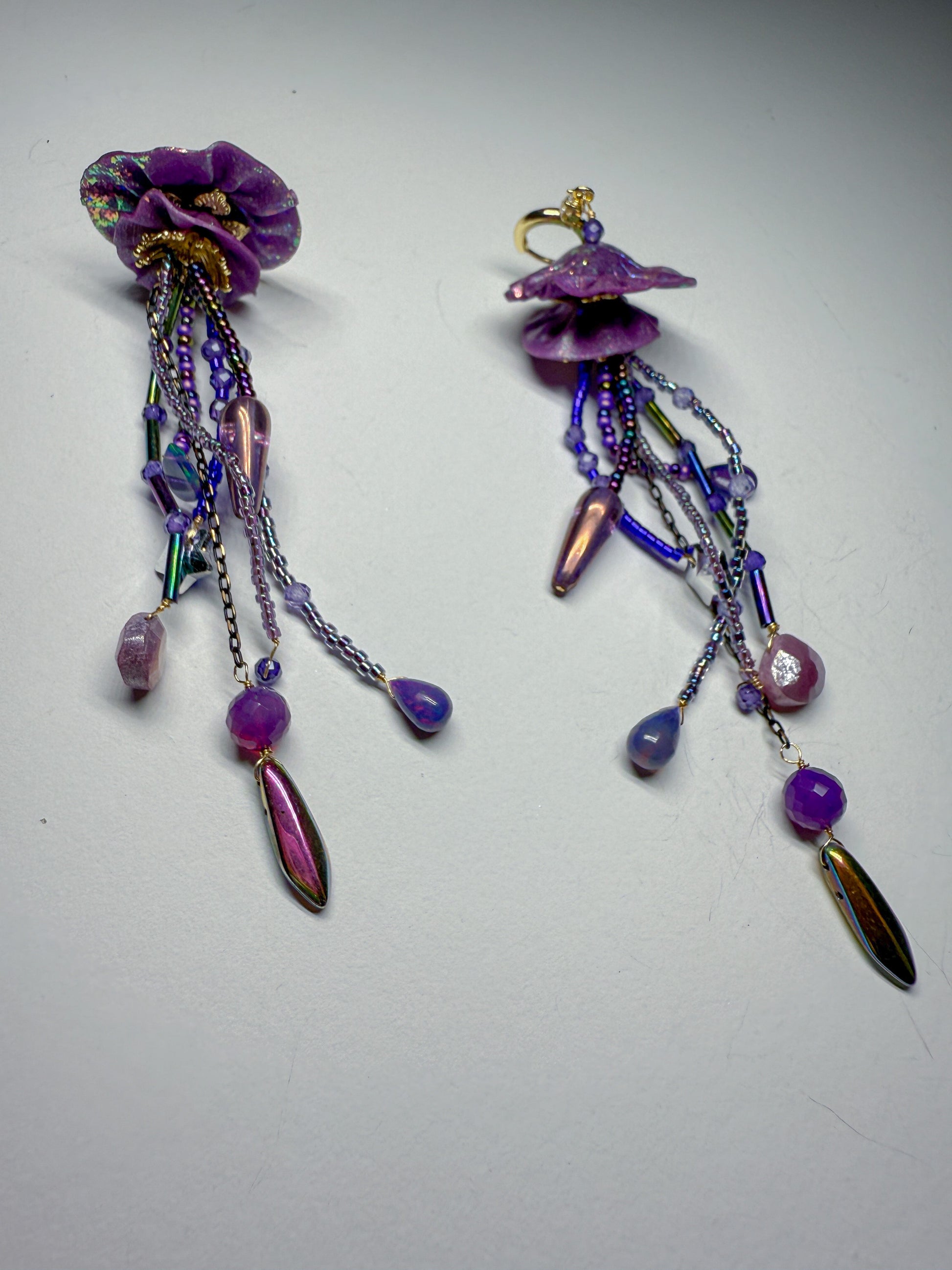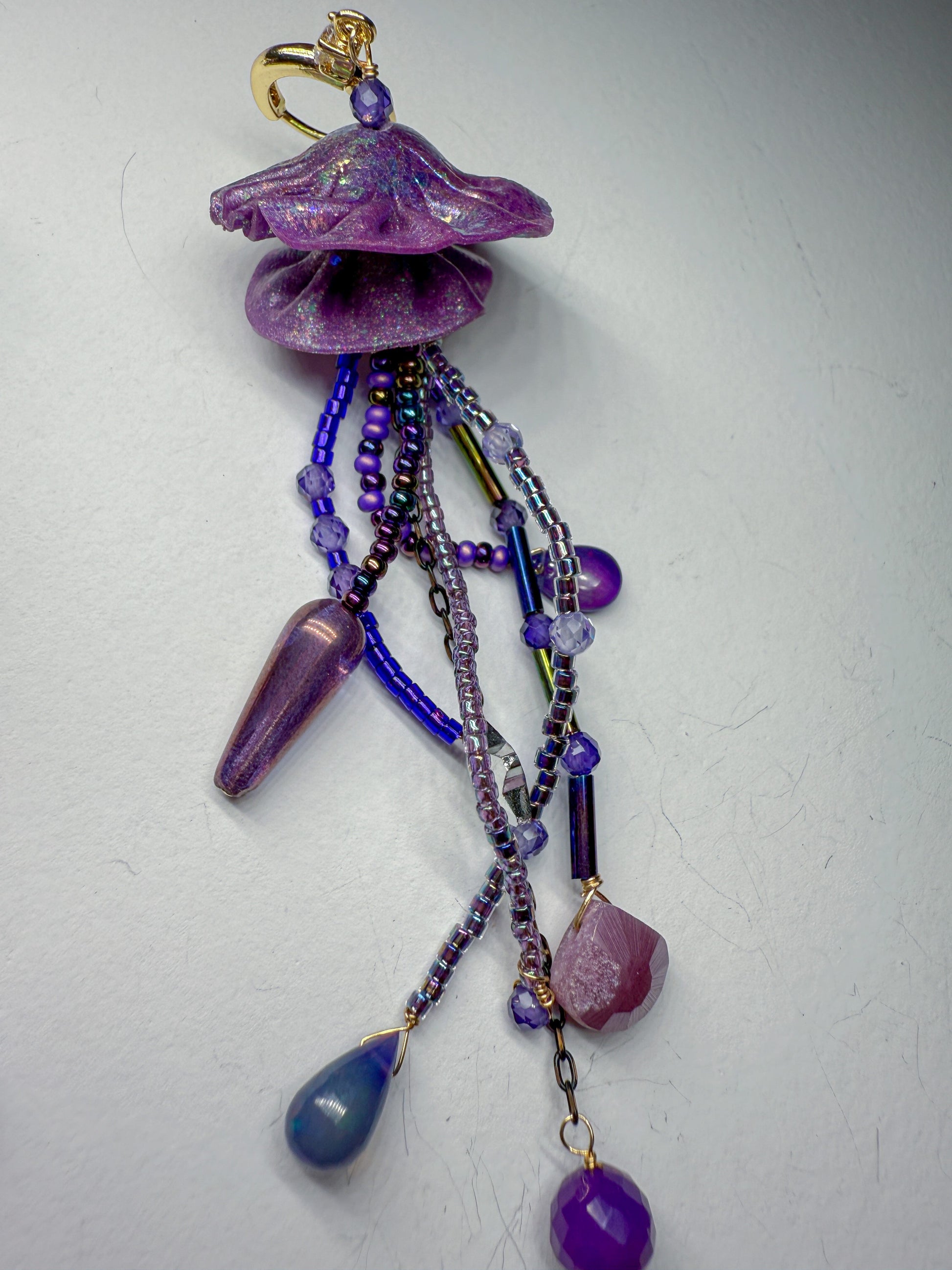 Shades of purple gemstones, glass and crystal on deep purple clay jellyfish tops