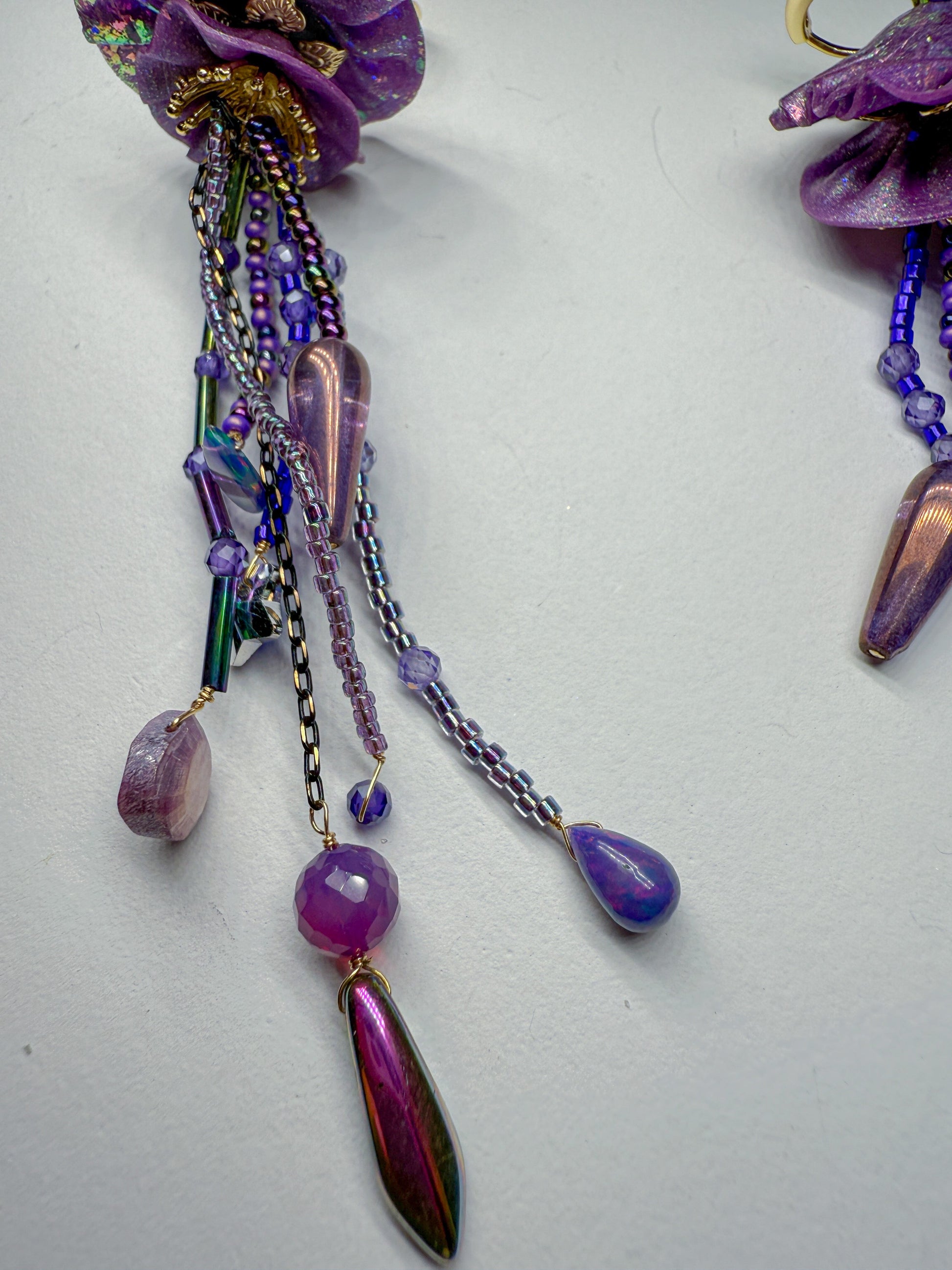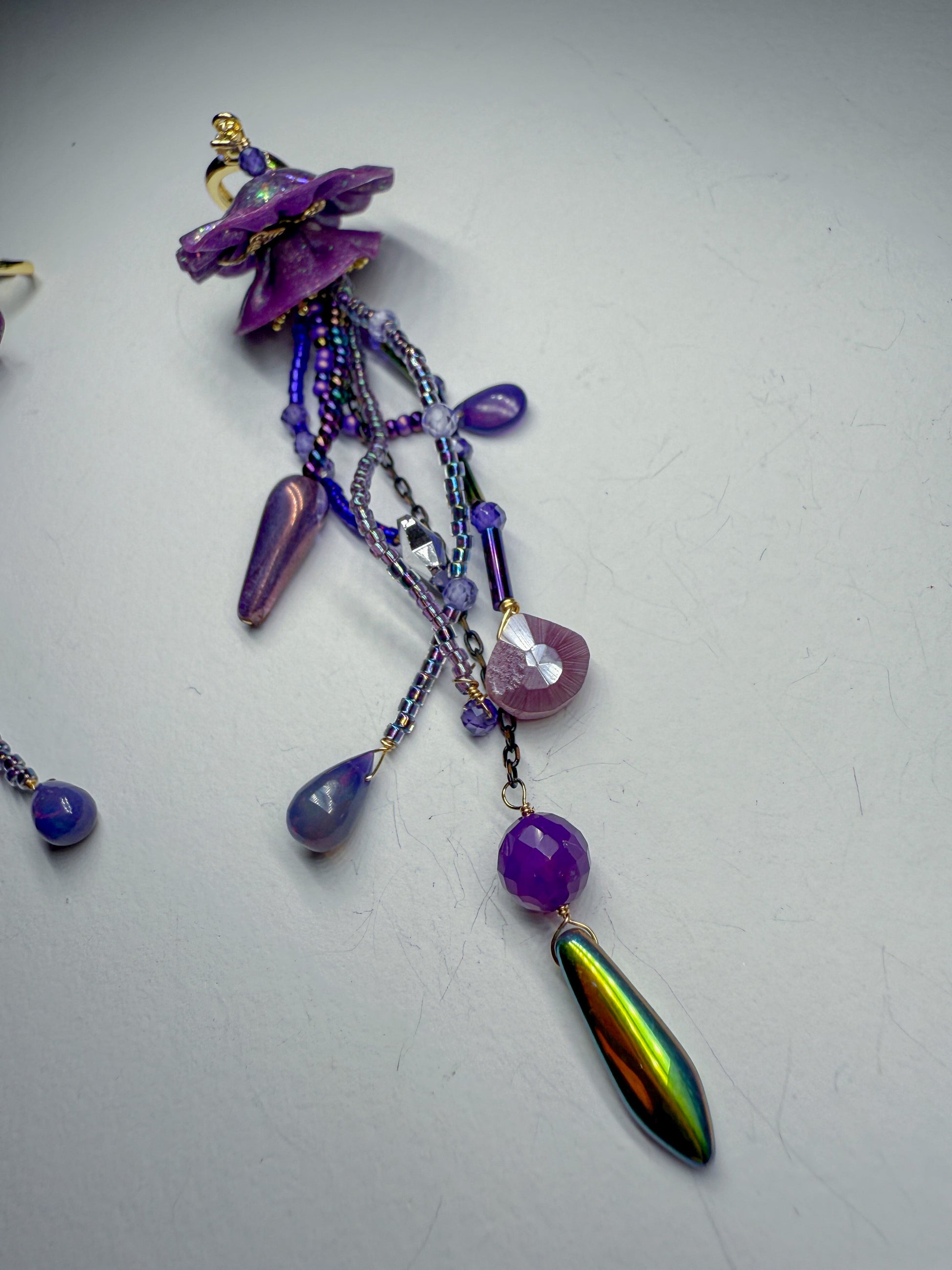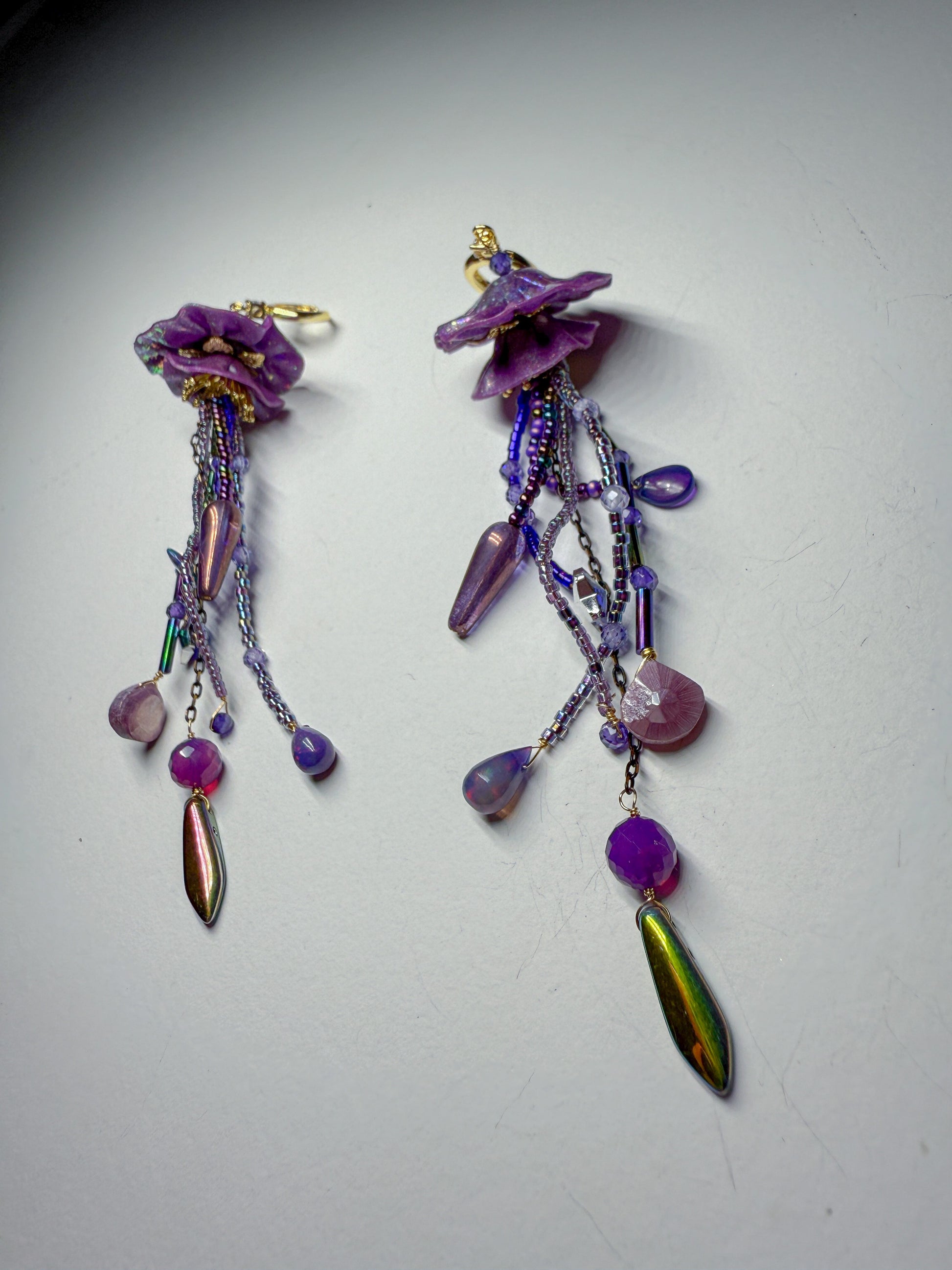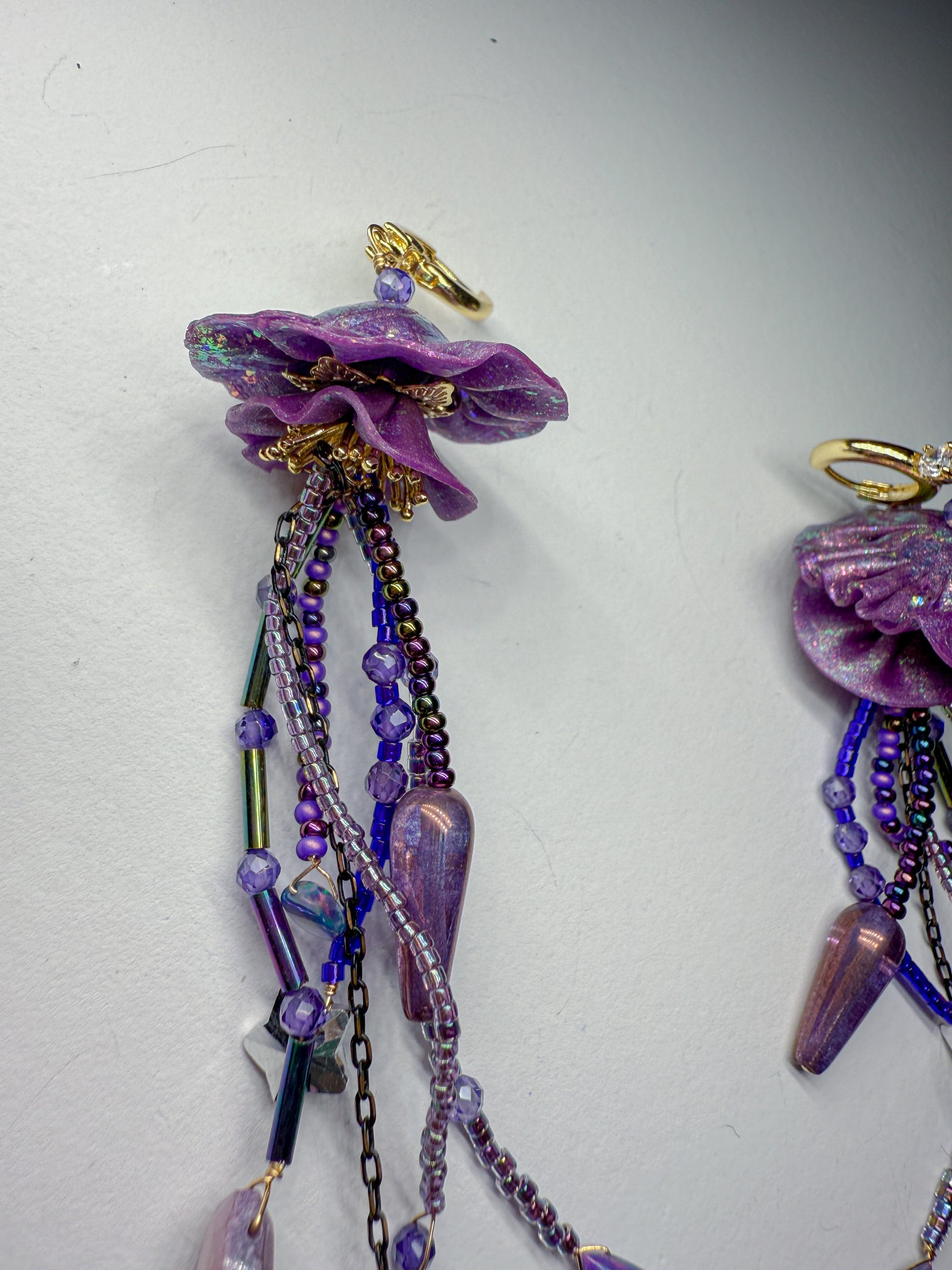 Shades of purple gemstones, glass and crystal on deep purple clay jellyfish tops