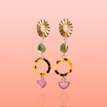 The Lucia Statements feature a sophisticated design, pairing a radiant gold-plated stainless steel fluted post with a hand-wrapped genuine green jade stone and a signature tortoiseshell resin hoop. Finished with a delicate pink jade drop, these earrings offer a rich, multi-layered silhouette that brings a touch of natural artistry to any look.