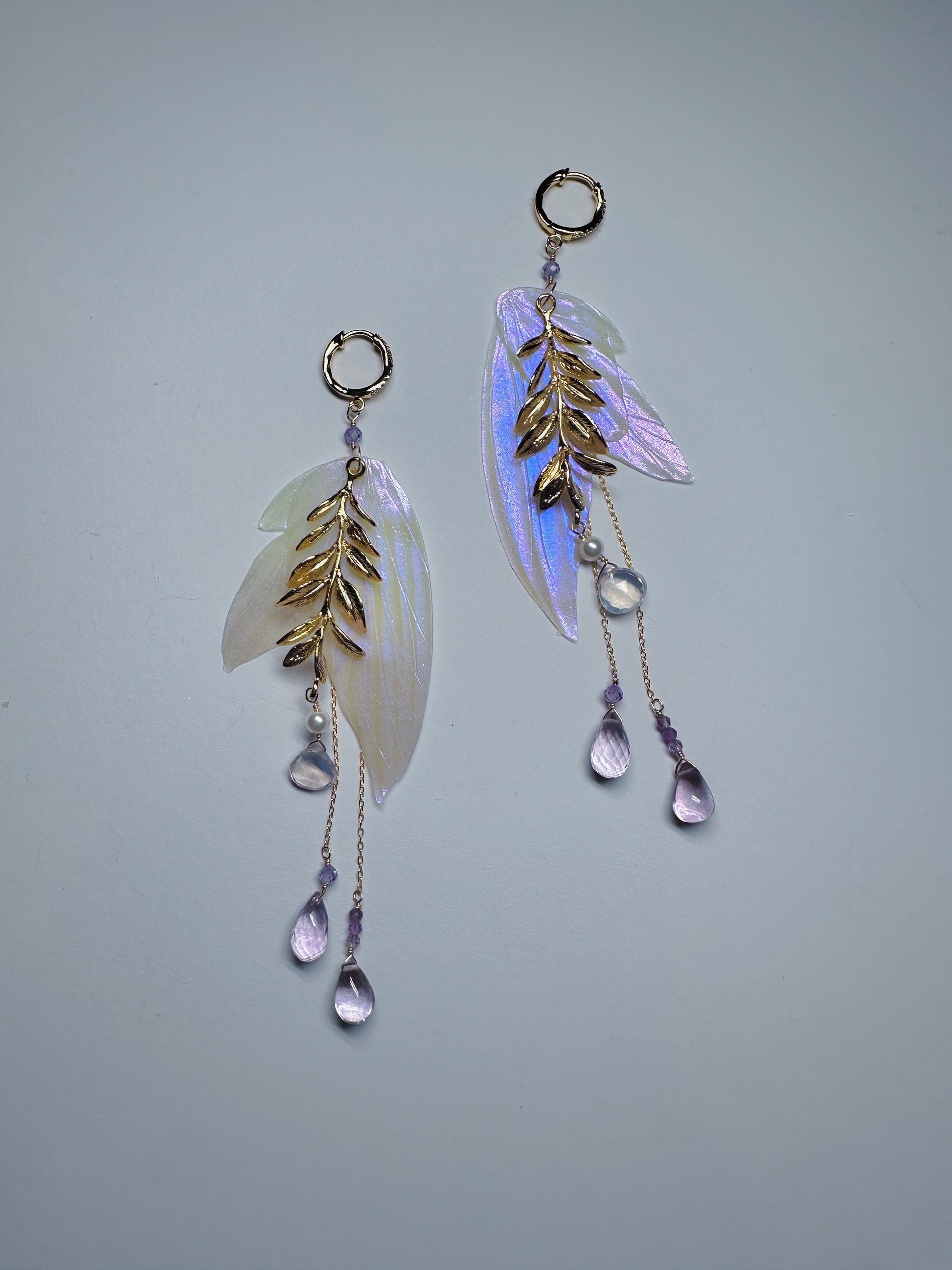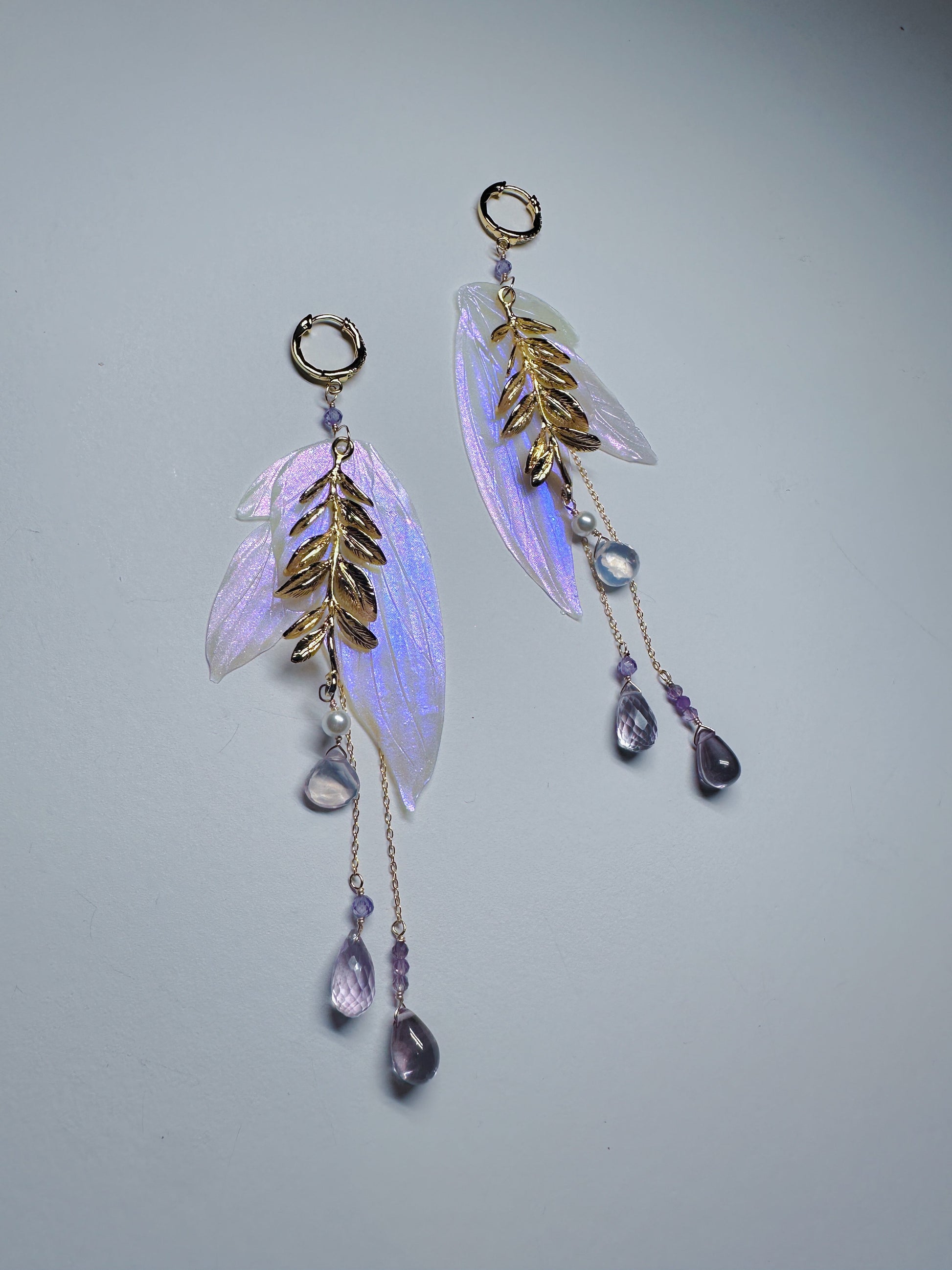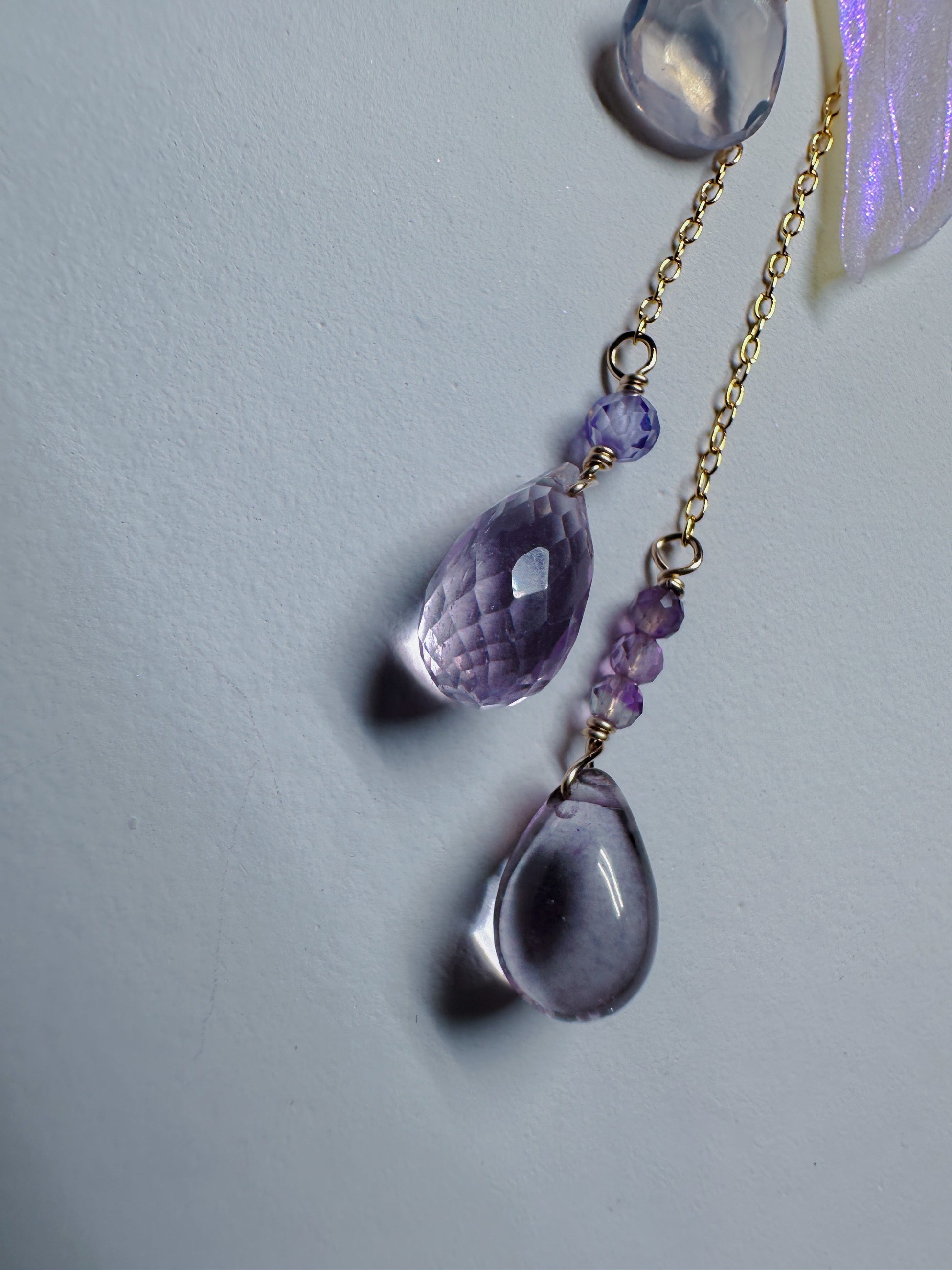 Soft lilac and vibrant violet shift create a beautiful layered foggy morning scenario. With brass branch and a variety of light amethyst drops on brass Huggies