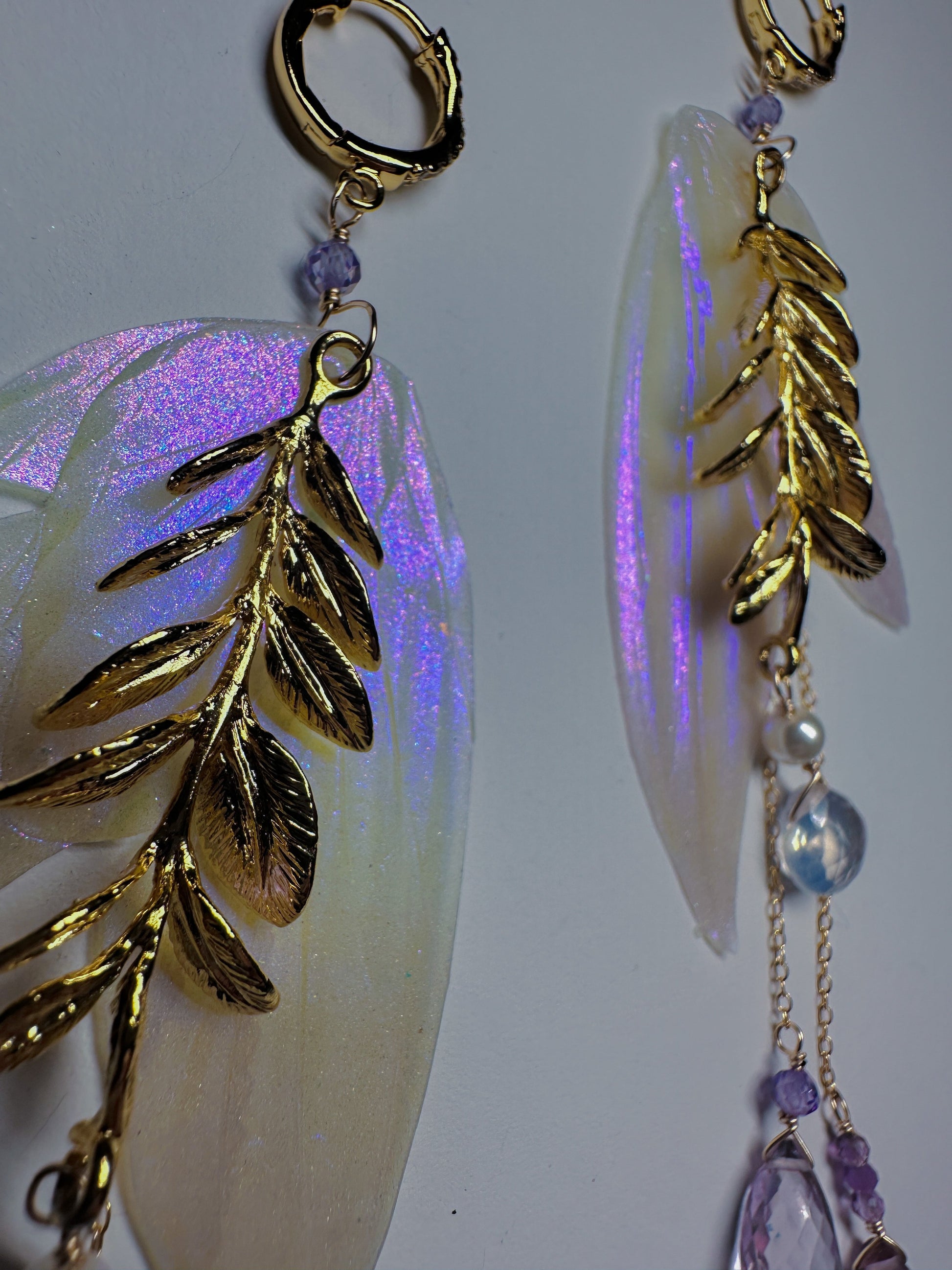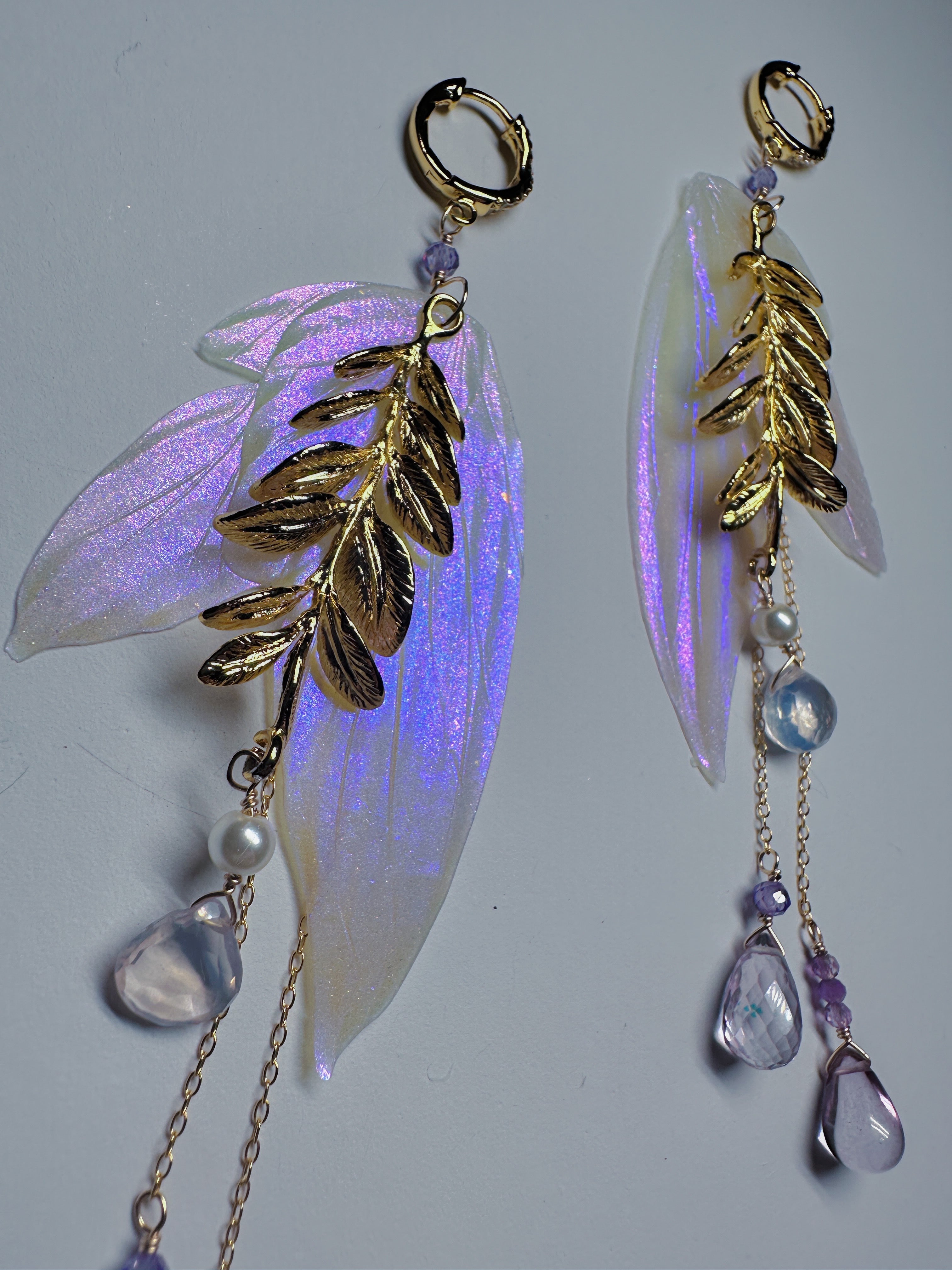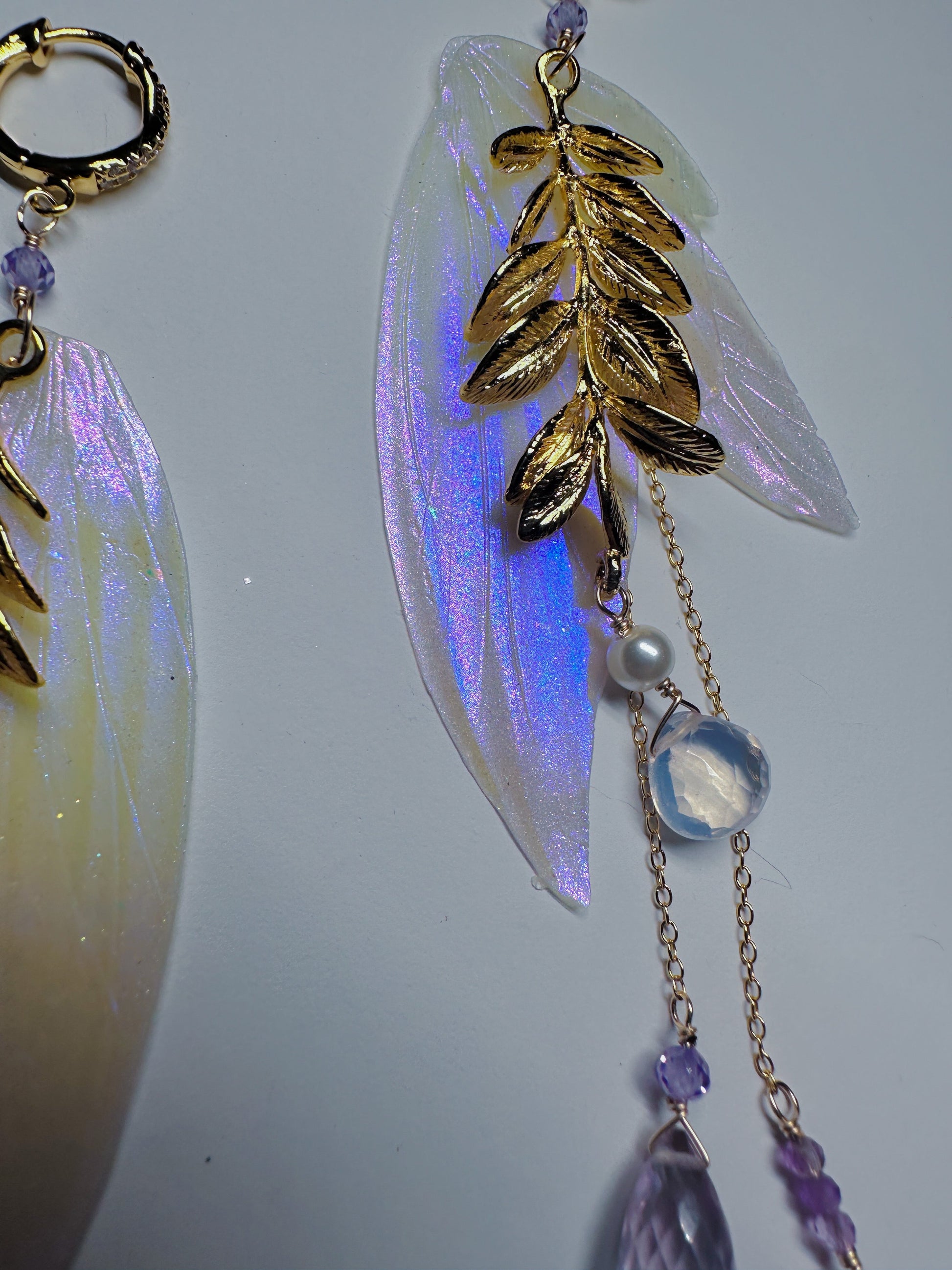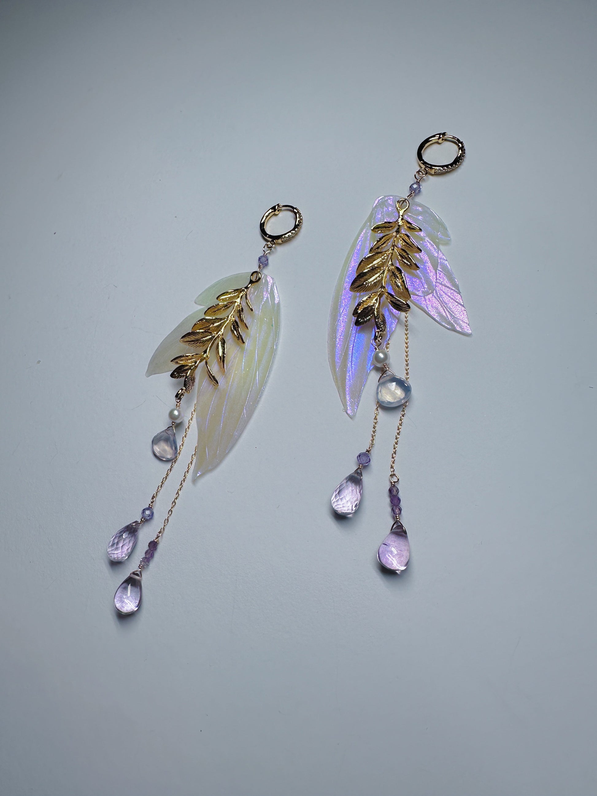 Soft lilac and vibrant violet shift create a beautiful layered foggy morning scenario. With brass branch and a variety of light amethyst drops on brass Huggies