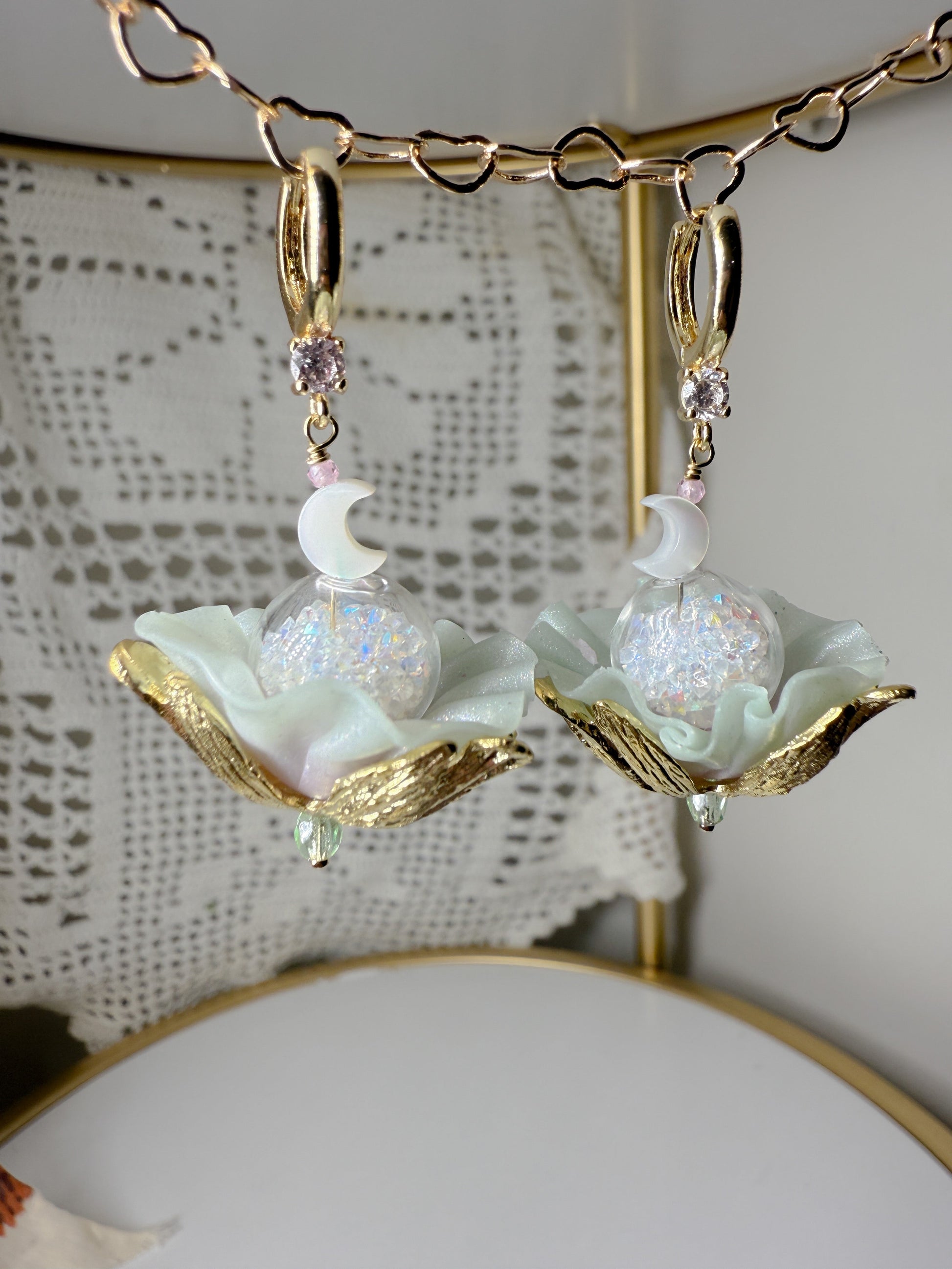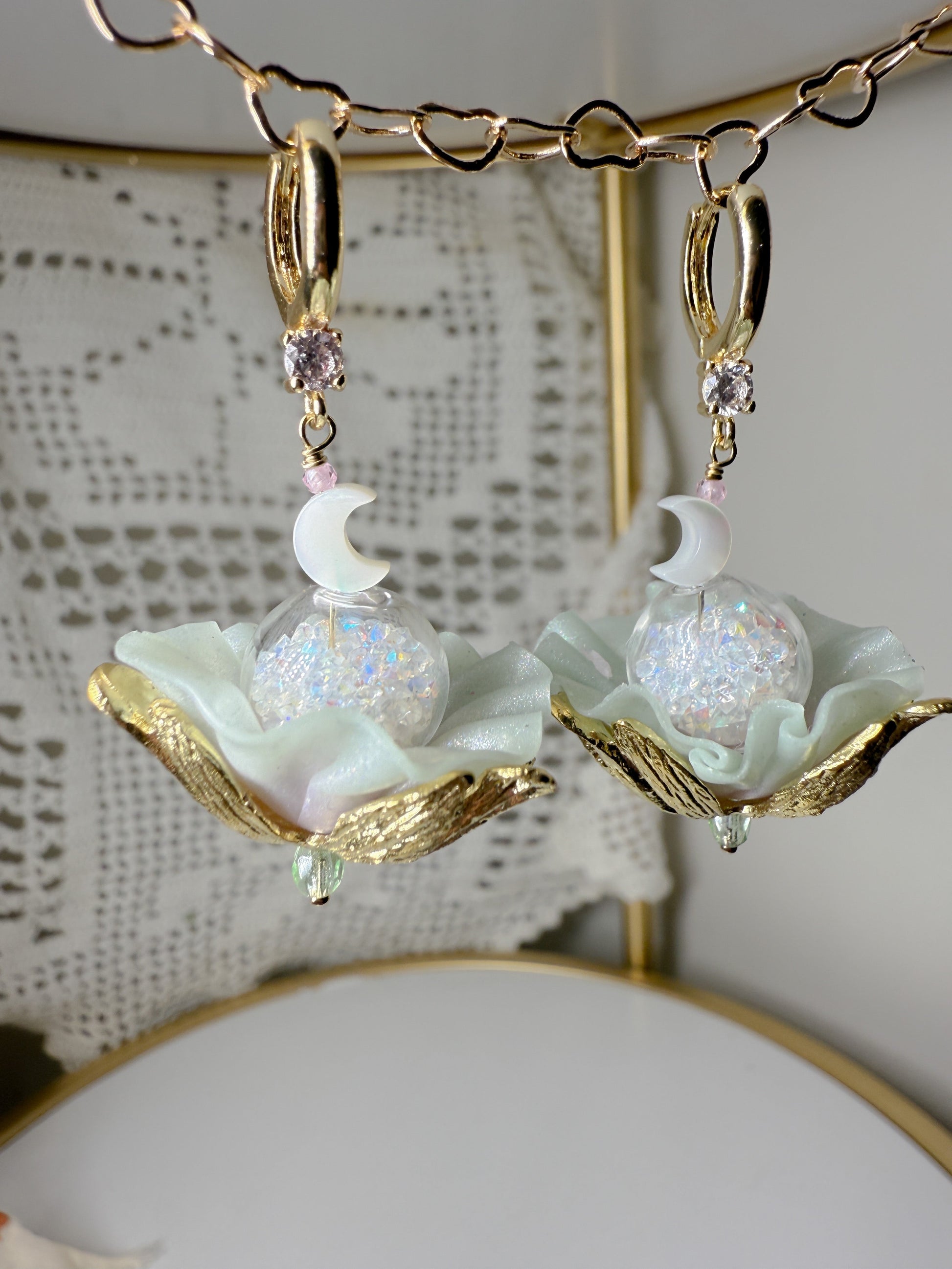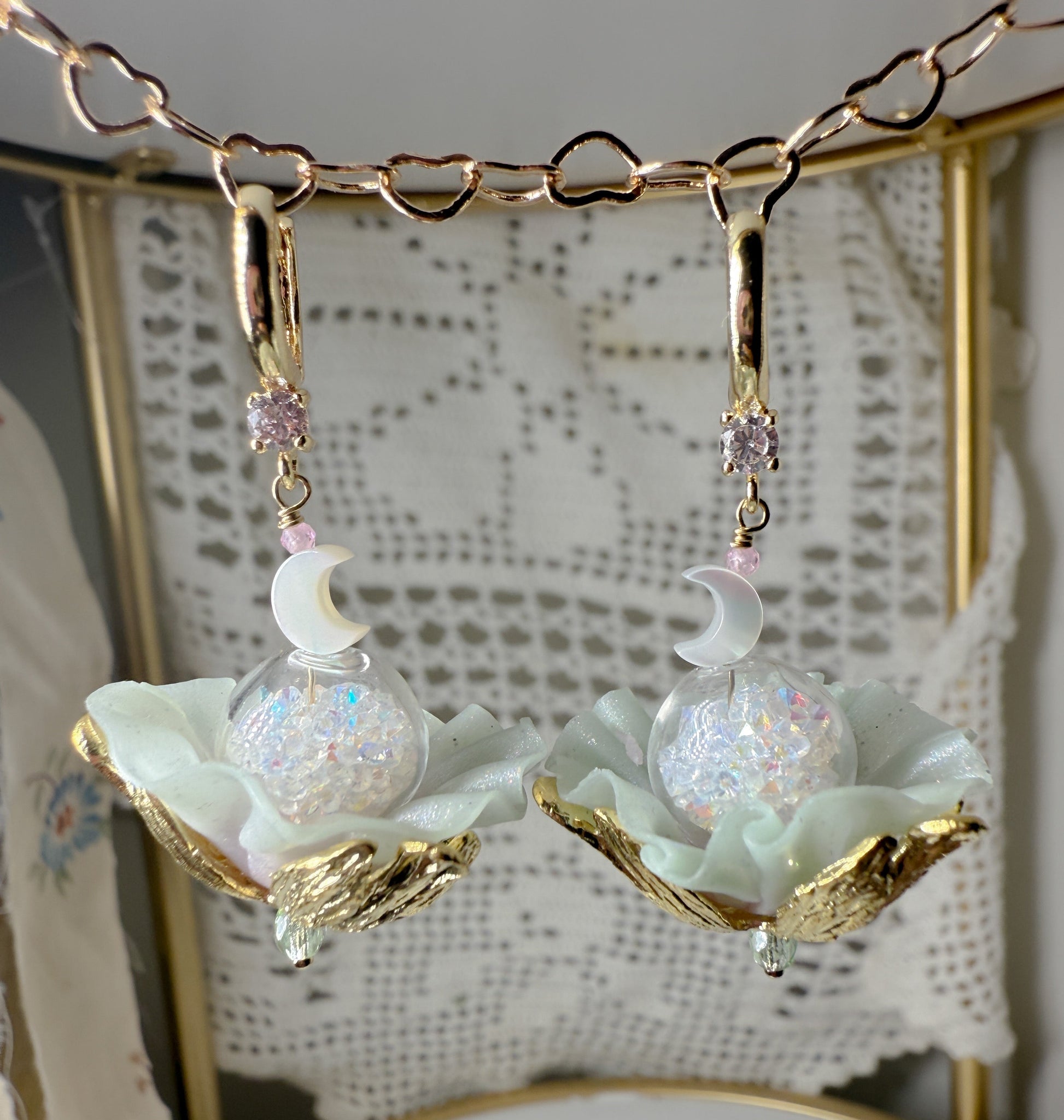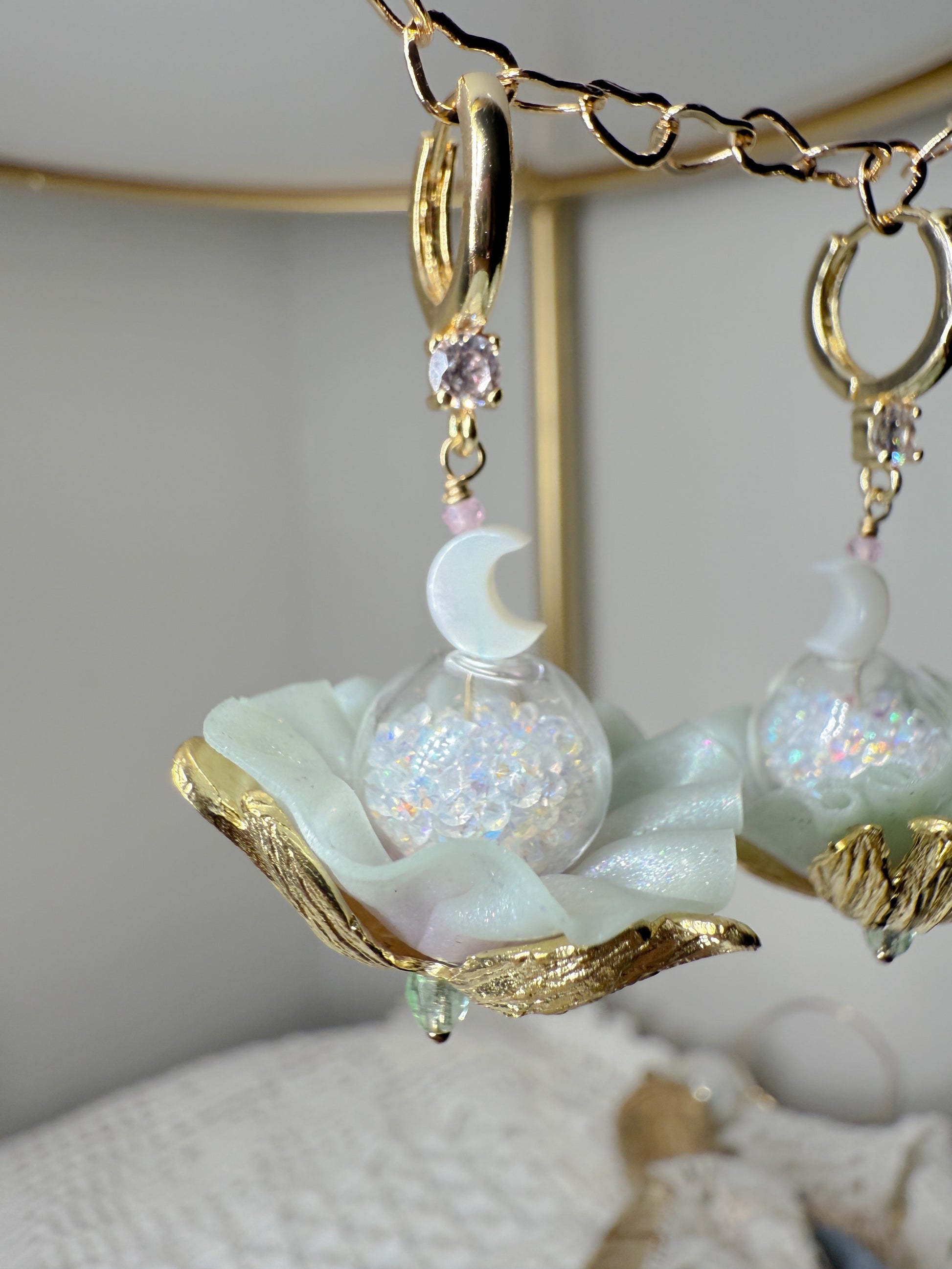 Sugary crystals filled a blown glass globe atop a minty green flower and brass petals and mother of pearl moons on brass huggies