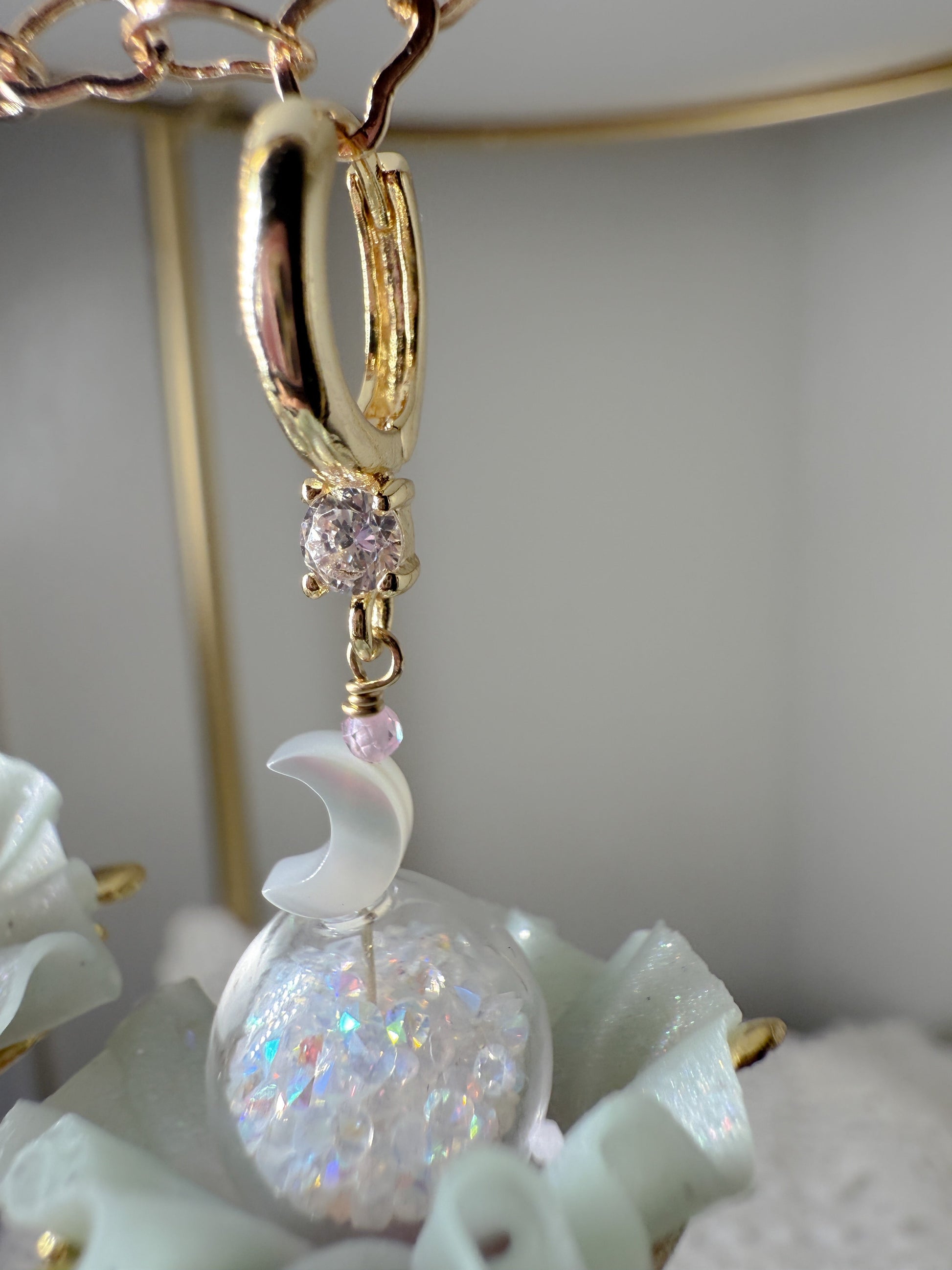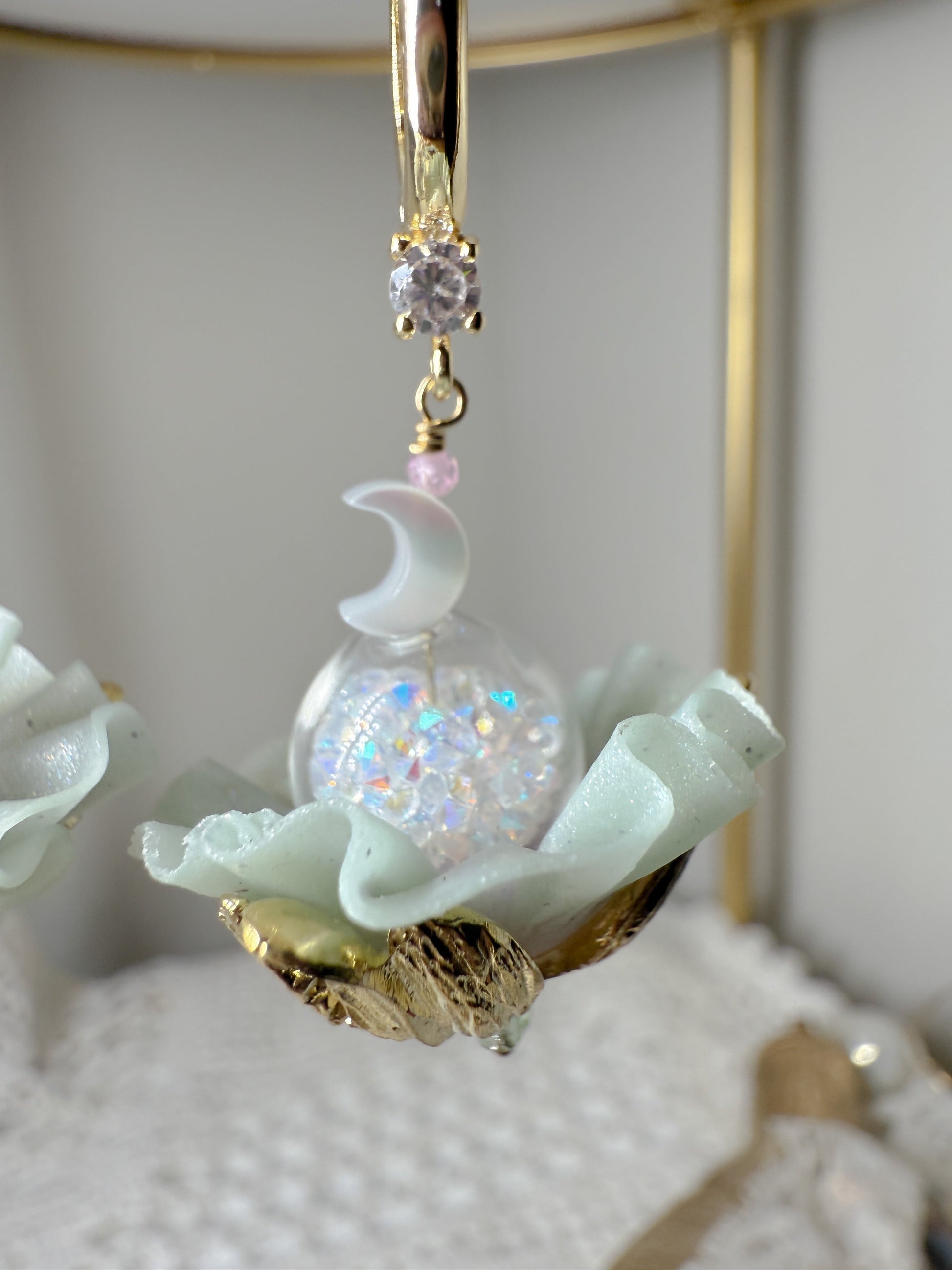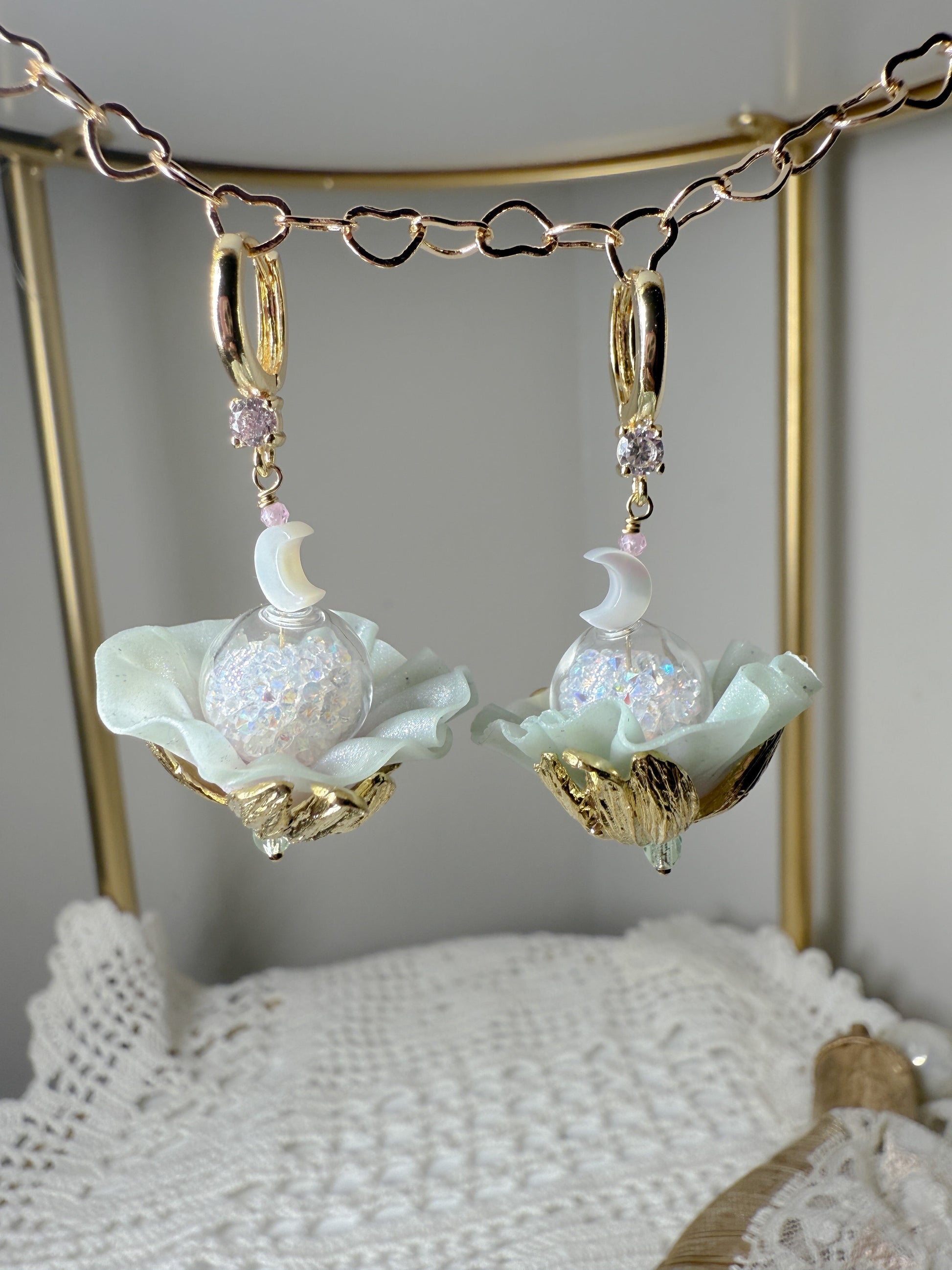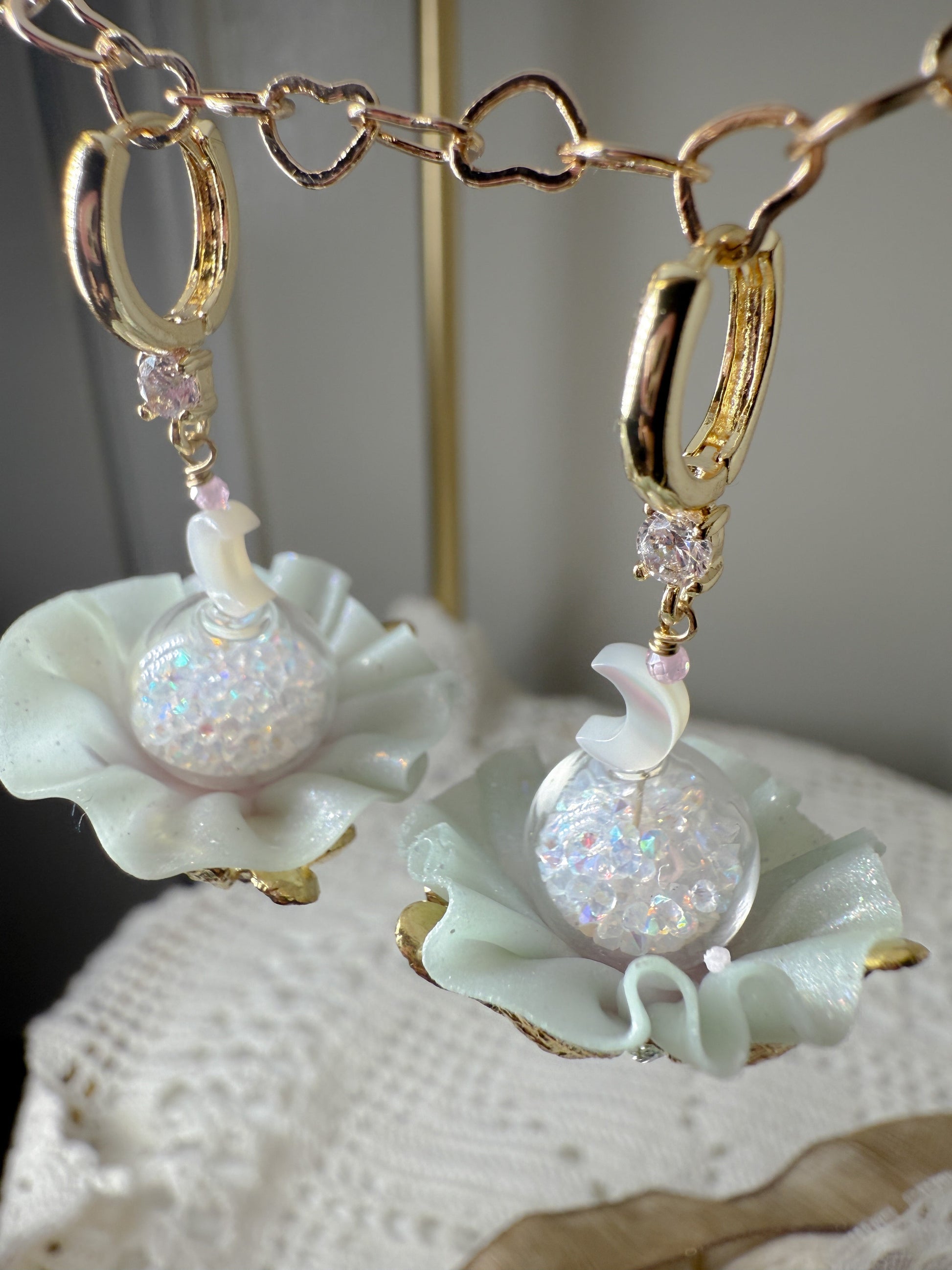 Sugary crystals filled a blown glass globe atop a minty green flower and brass petals and mother of pearl moons on brass huggies