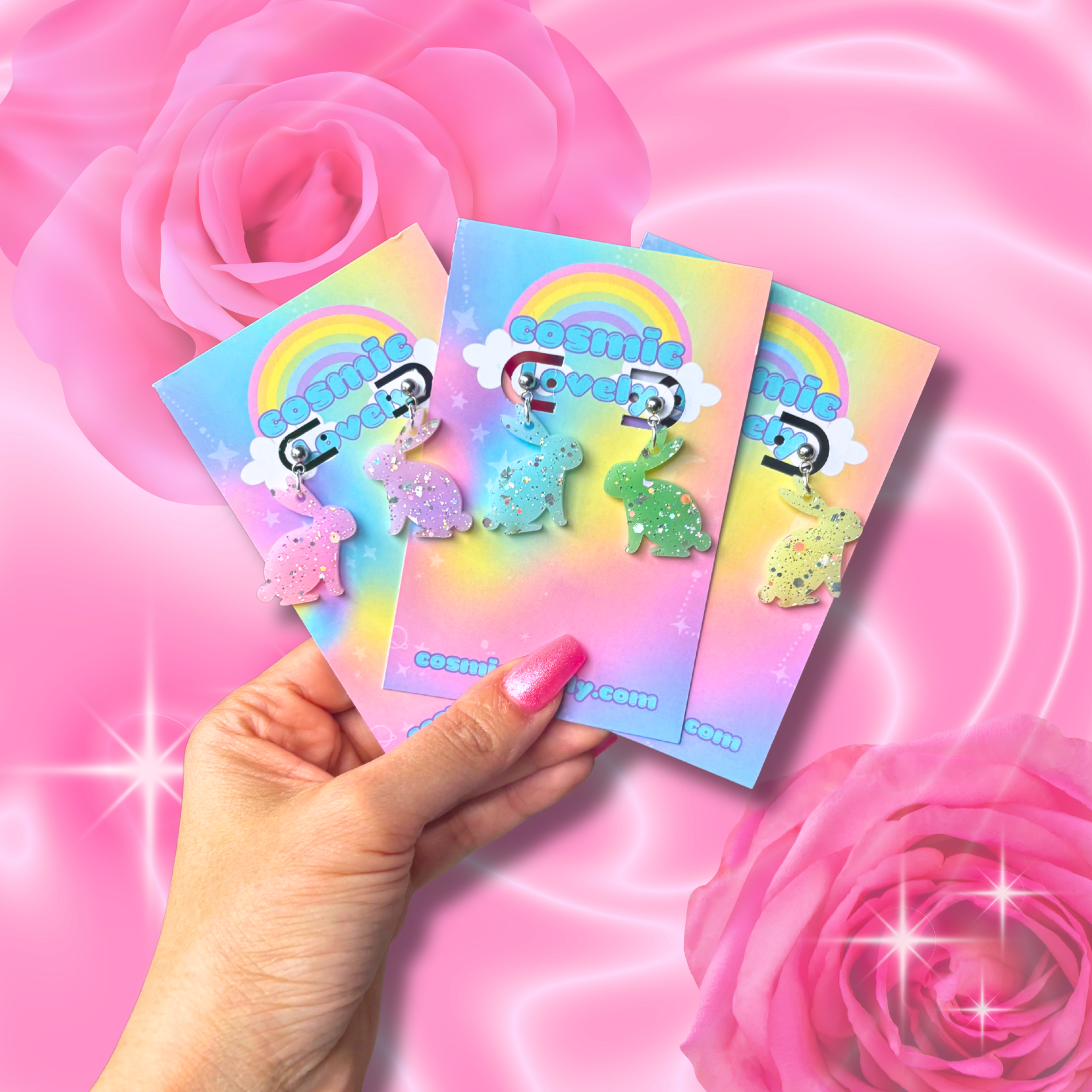 This listing is for ONE Pair of Pastel Rainbow Confetti Spring Bunny Earrings
