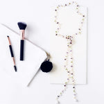 Our version of a modern lariat necklace makes a statement but is easy to wear with anything, including a white t- shirt. Can be tied and wrapped multiple ways. The shape of bead pearls will make it hold whatever shape you choose.