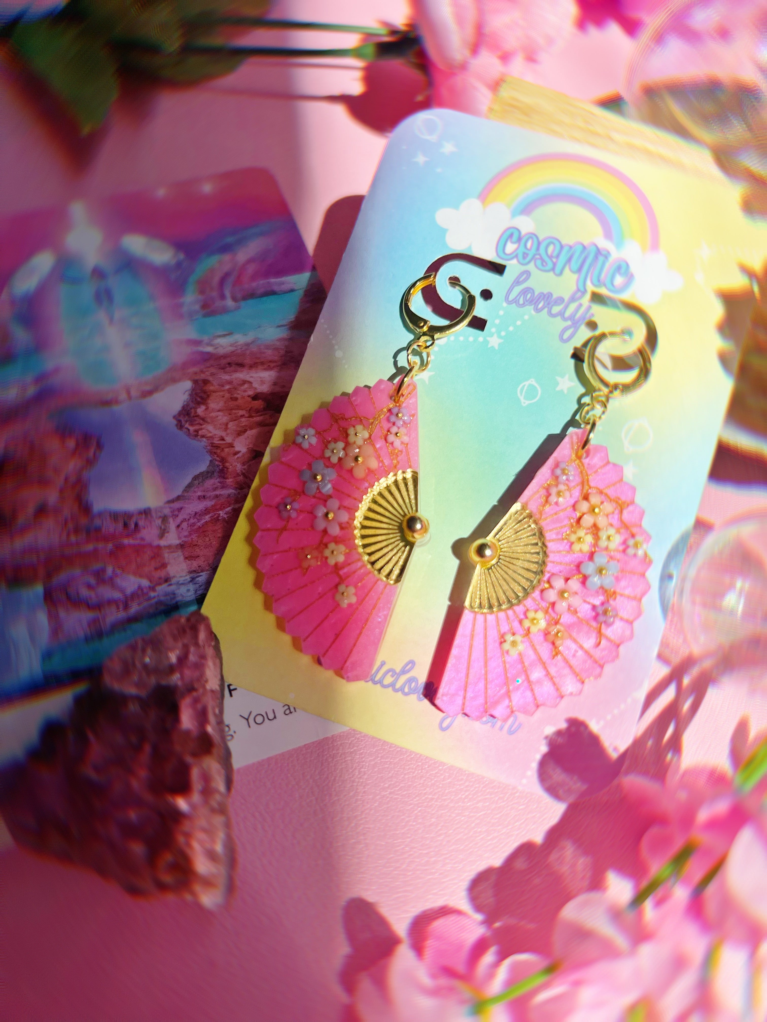 This listing is for ONE Pair of Pretty Pink Folding Fan Earrings. Leverbacks are hypoallergenic. Earrings are approximately 3"