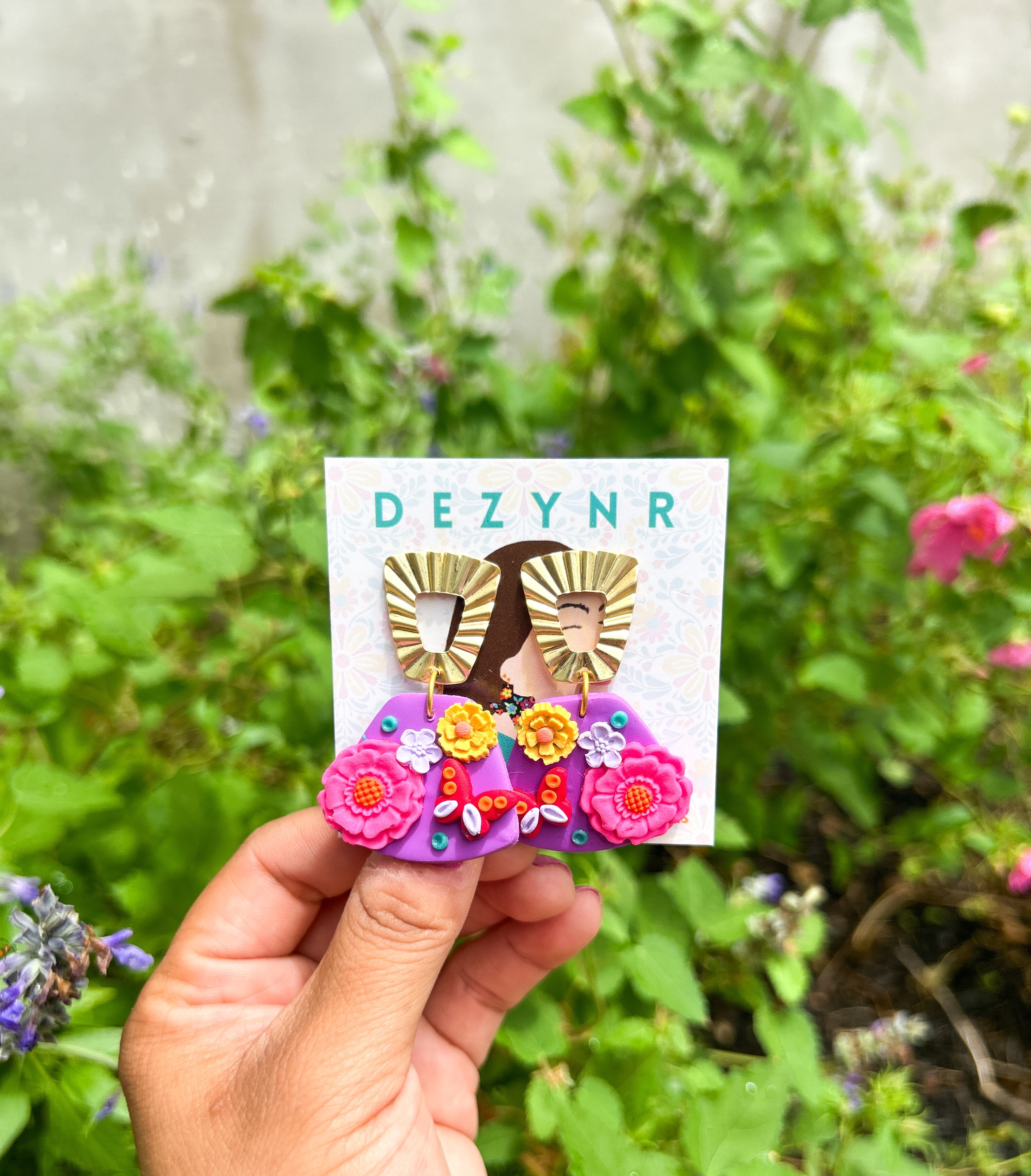This pair of earrings was made entirely of polymer clay with handcrafted colorful flowers and details. The top is a brass charm that is durable and easy to maintain.