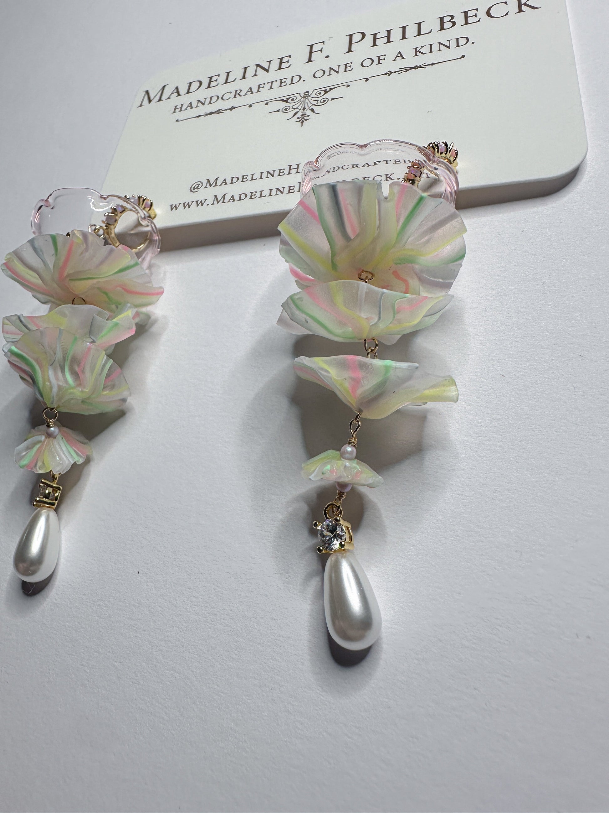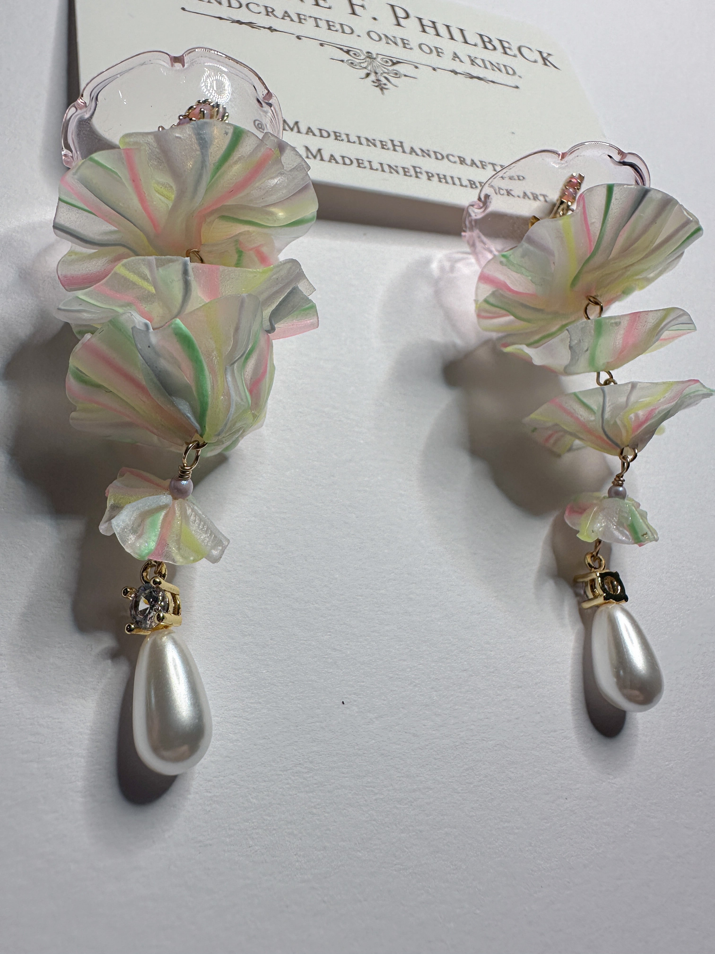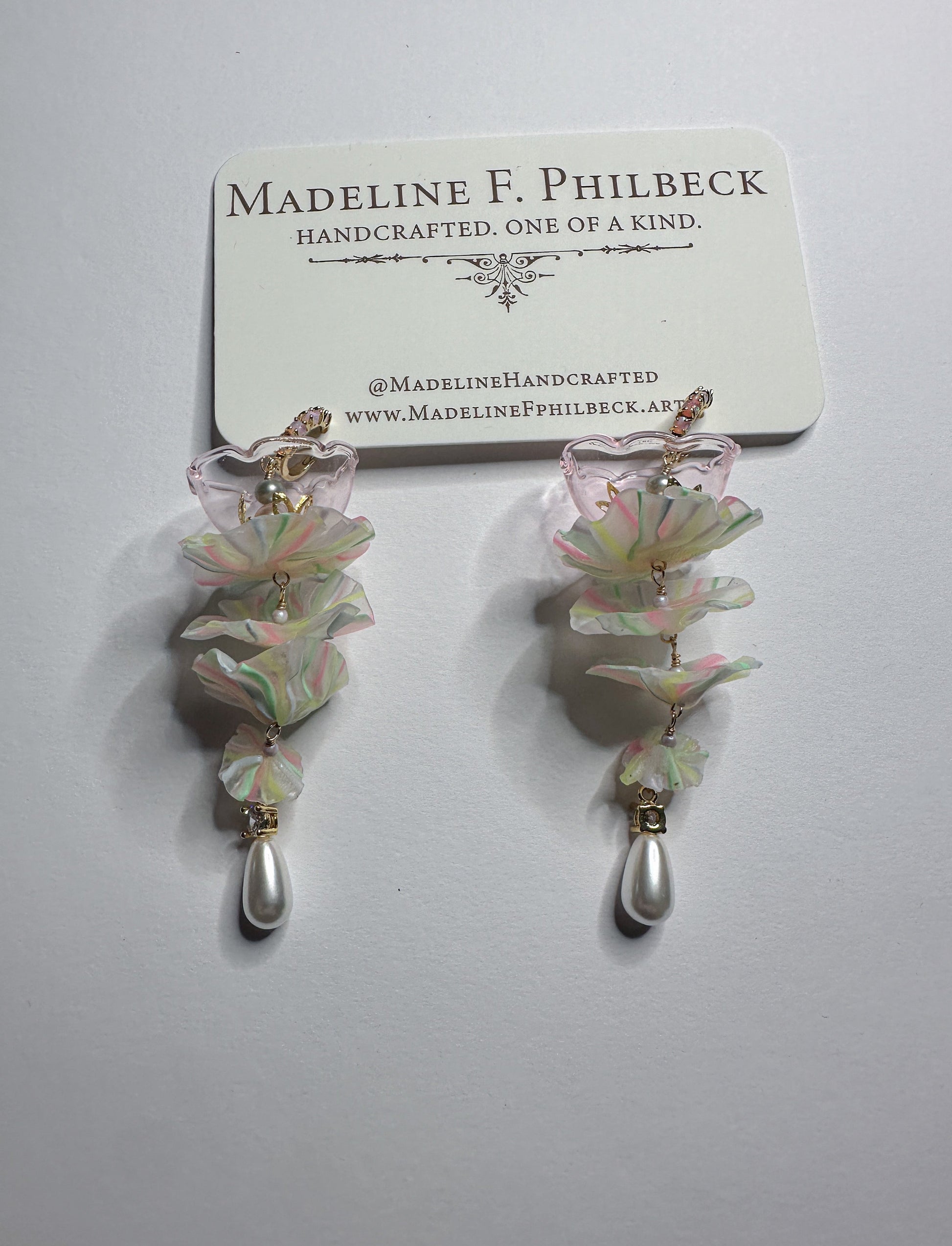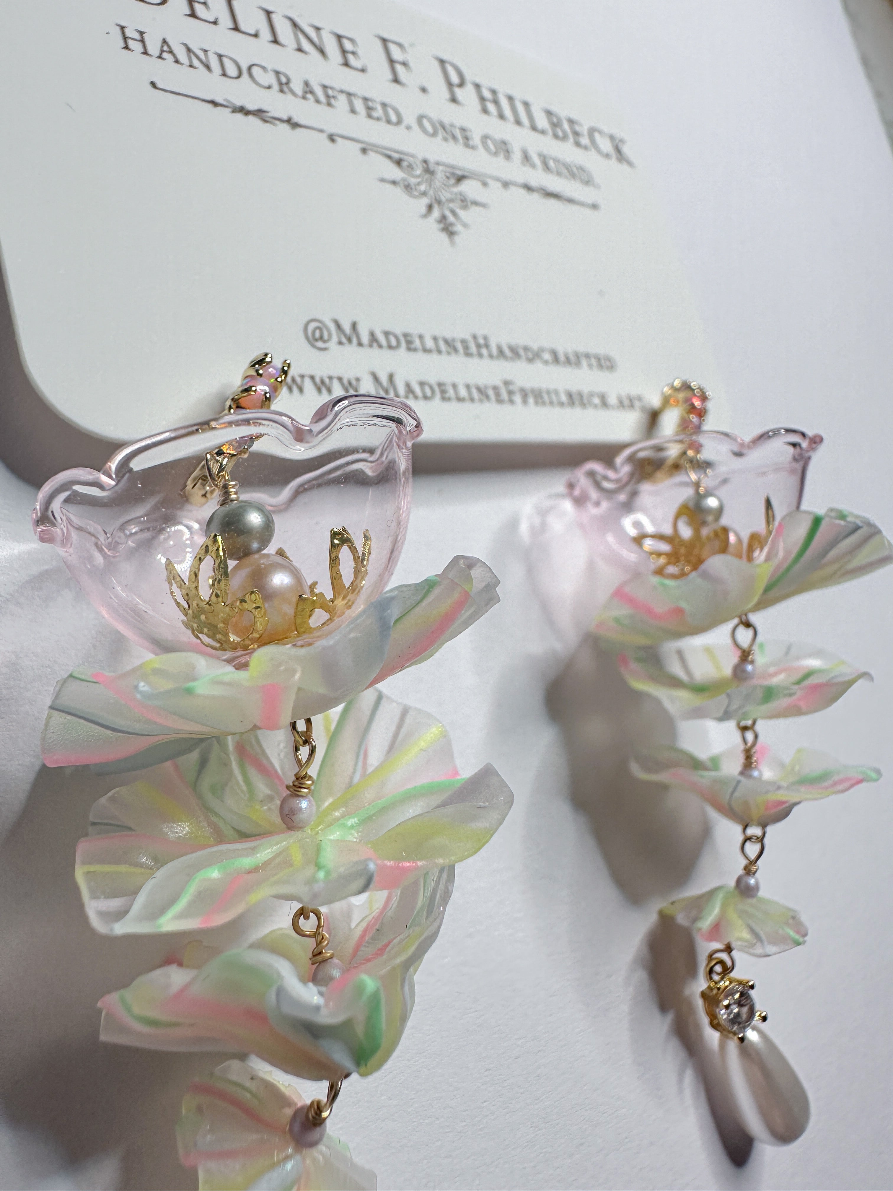 Handcrafted striped clay flowers with shimmering pearls drop and pink glass cup with pink pink detail on opal Huggies