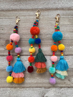 Handmade pom pom keychain / bag charms with wooden beads, colorful pom poms, and tassels. Three (3) color schemes to choose from!