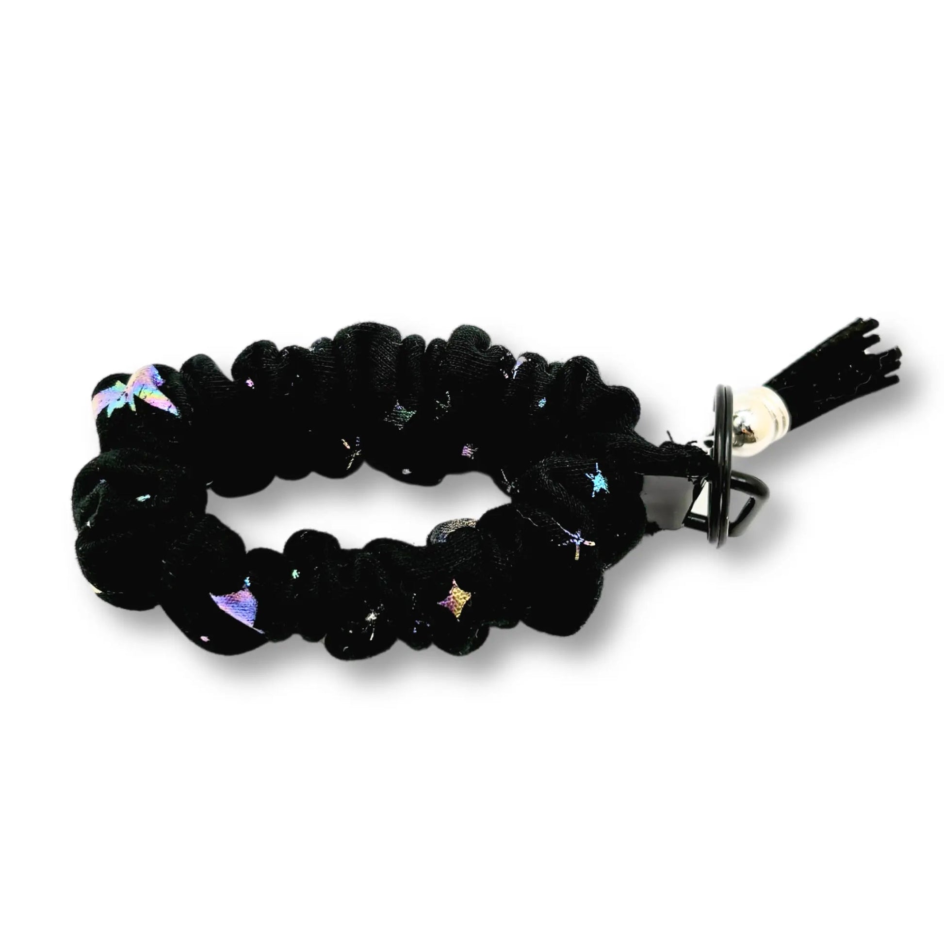 Hold your keys in style with our Holographic Bats Scrunchie Wristlet! This versatile accessory functions as both a scrunchie and key holder, making it a convenient and fashionable addition to any outfit. Made with soft Knit cotton material, it's gentle on your skin and hair. Elevate your accessorizing game with this must-have!