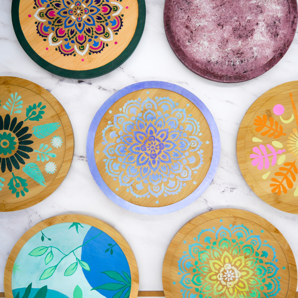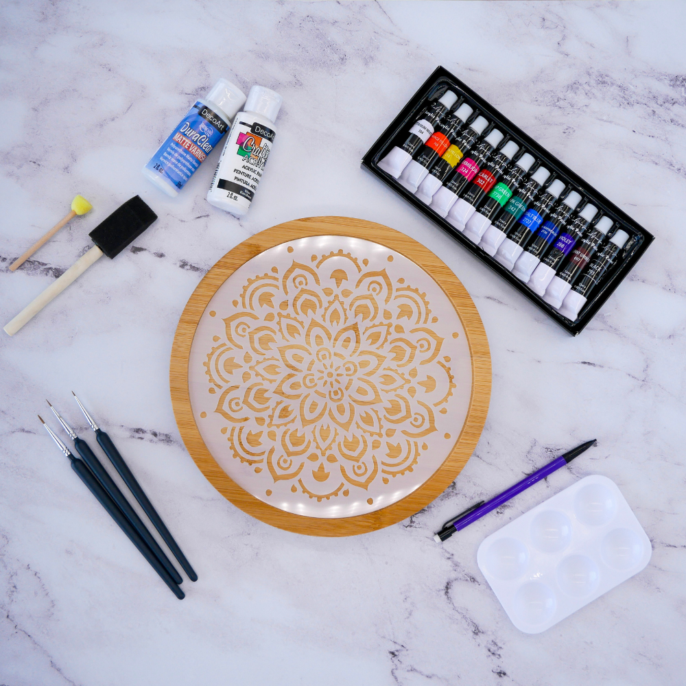 This craft kit includes a bamboo turntable, six stencils, and all the painting materials you could need. To protect your masterpiece, we've provided a durable matte varnish that ensures long-lasting beauty. Crafters will need a water cup and tape.